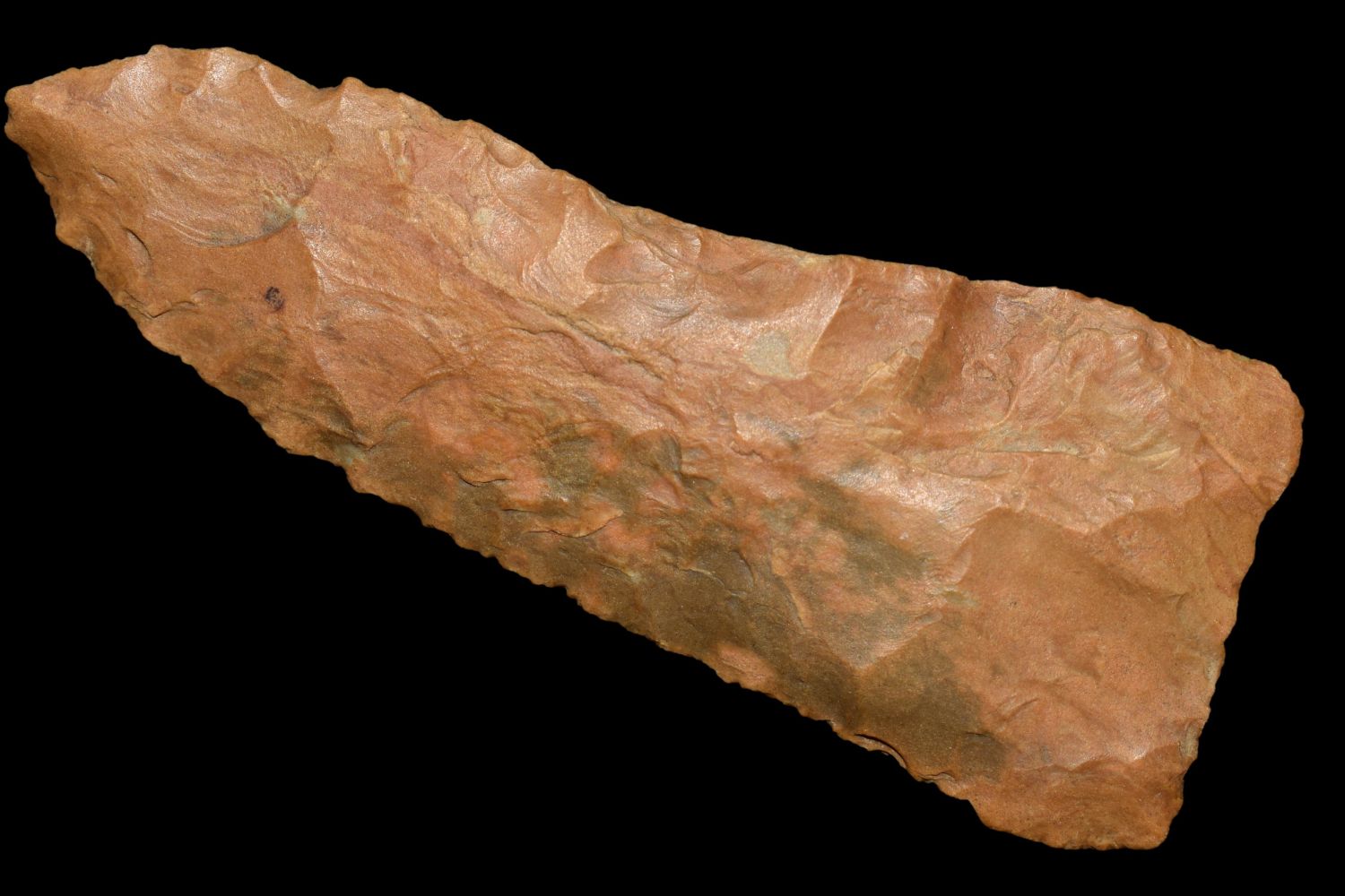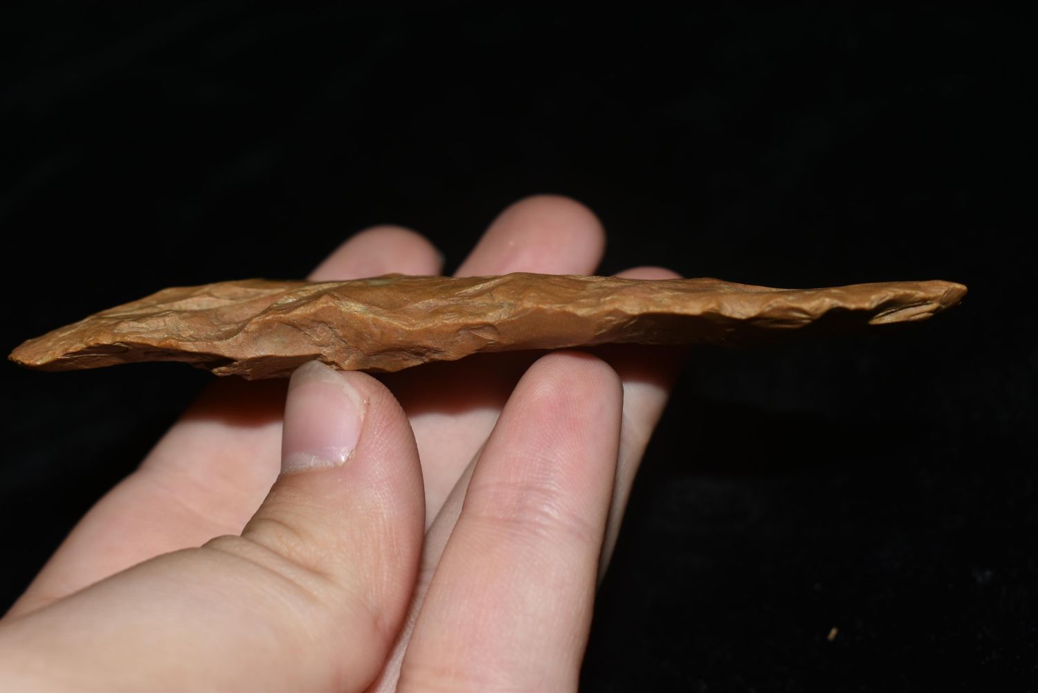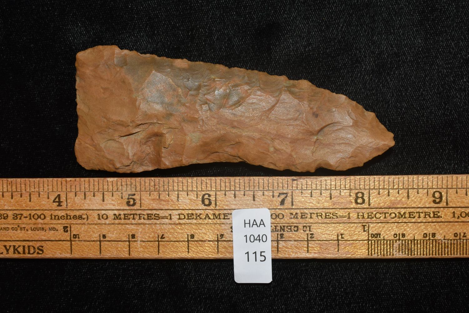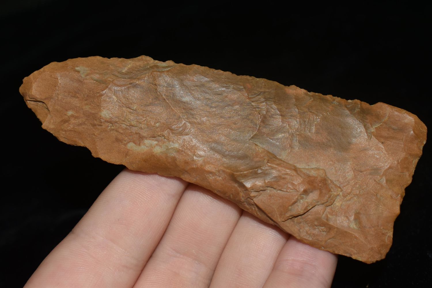 4 1/8" Dalton Knife, Heavily Ground Base, Colorful Chert, found near the Tennessee River in Decatur Co., Tennessee, Authentic Native American Arrowhead