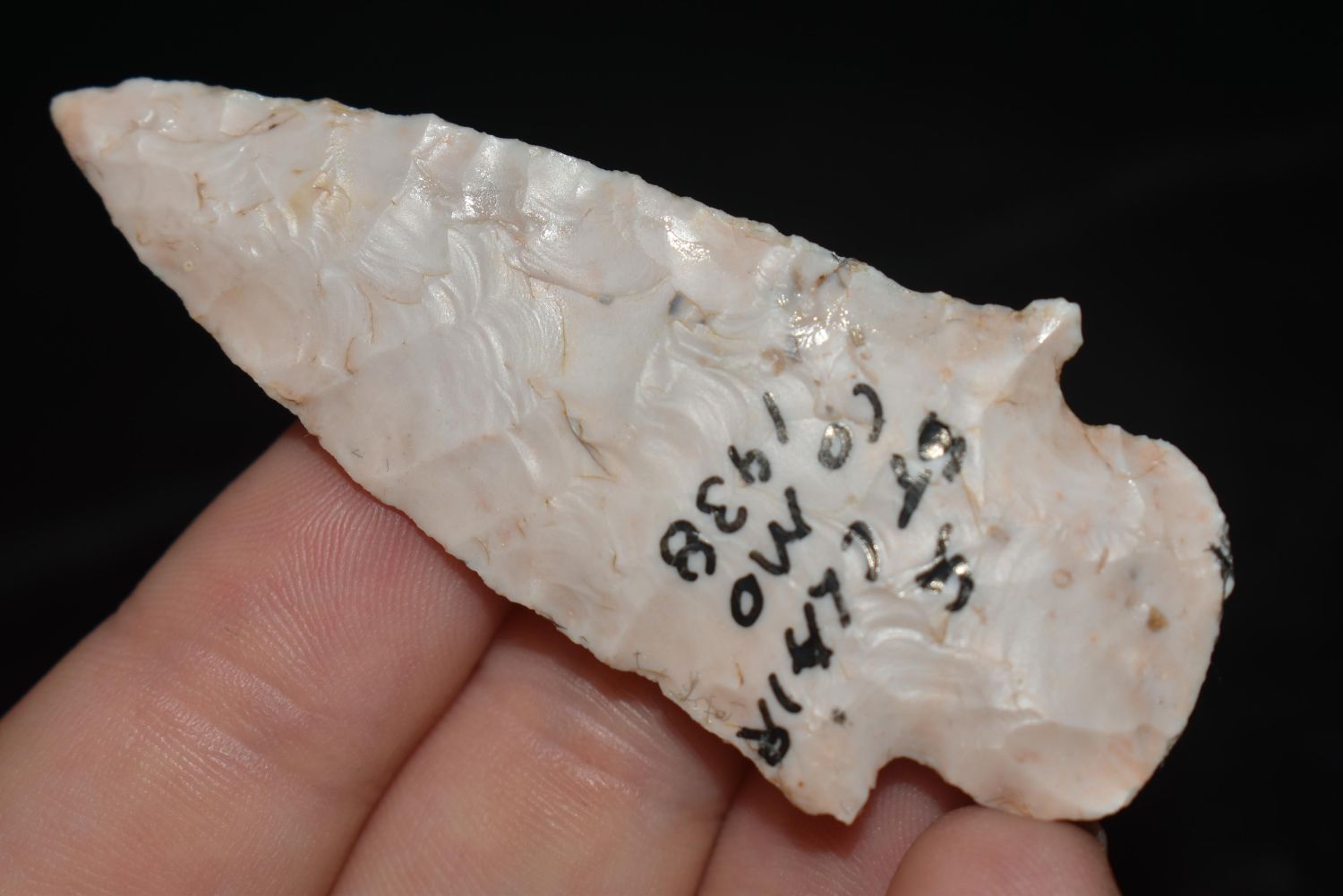 2 5/8" Delhi, found in St. Clair Co., Missouri in 1938, Ex. Gerald Bernacchi Coll. Authentic Native American Arrowhead