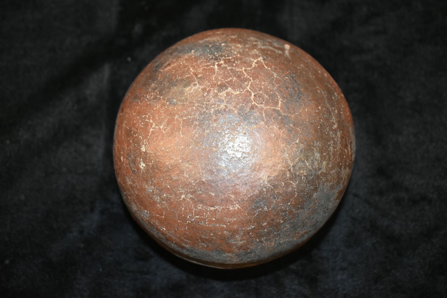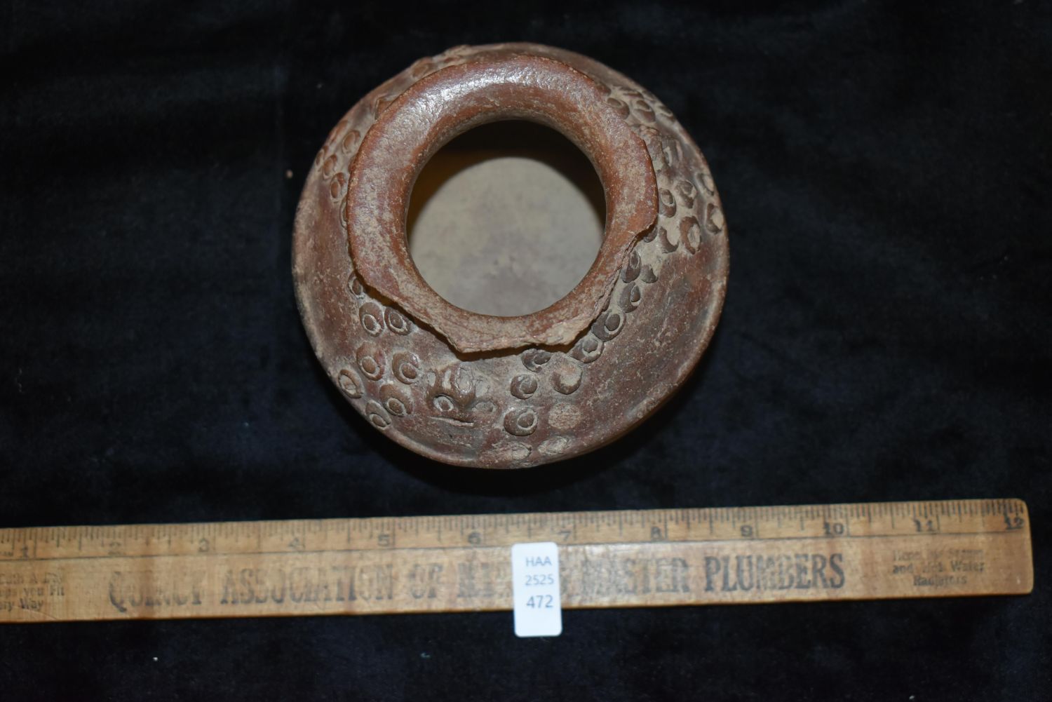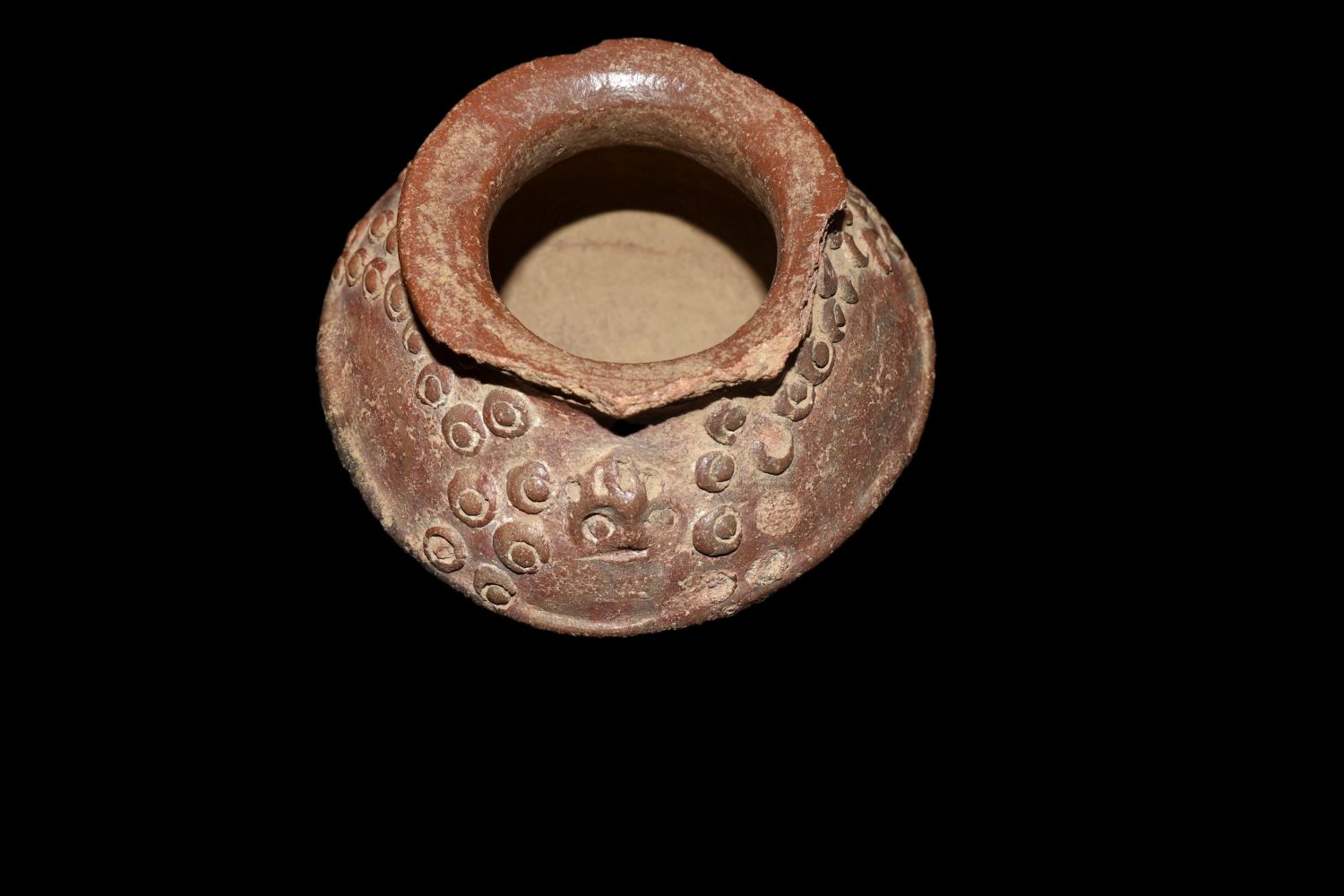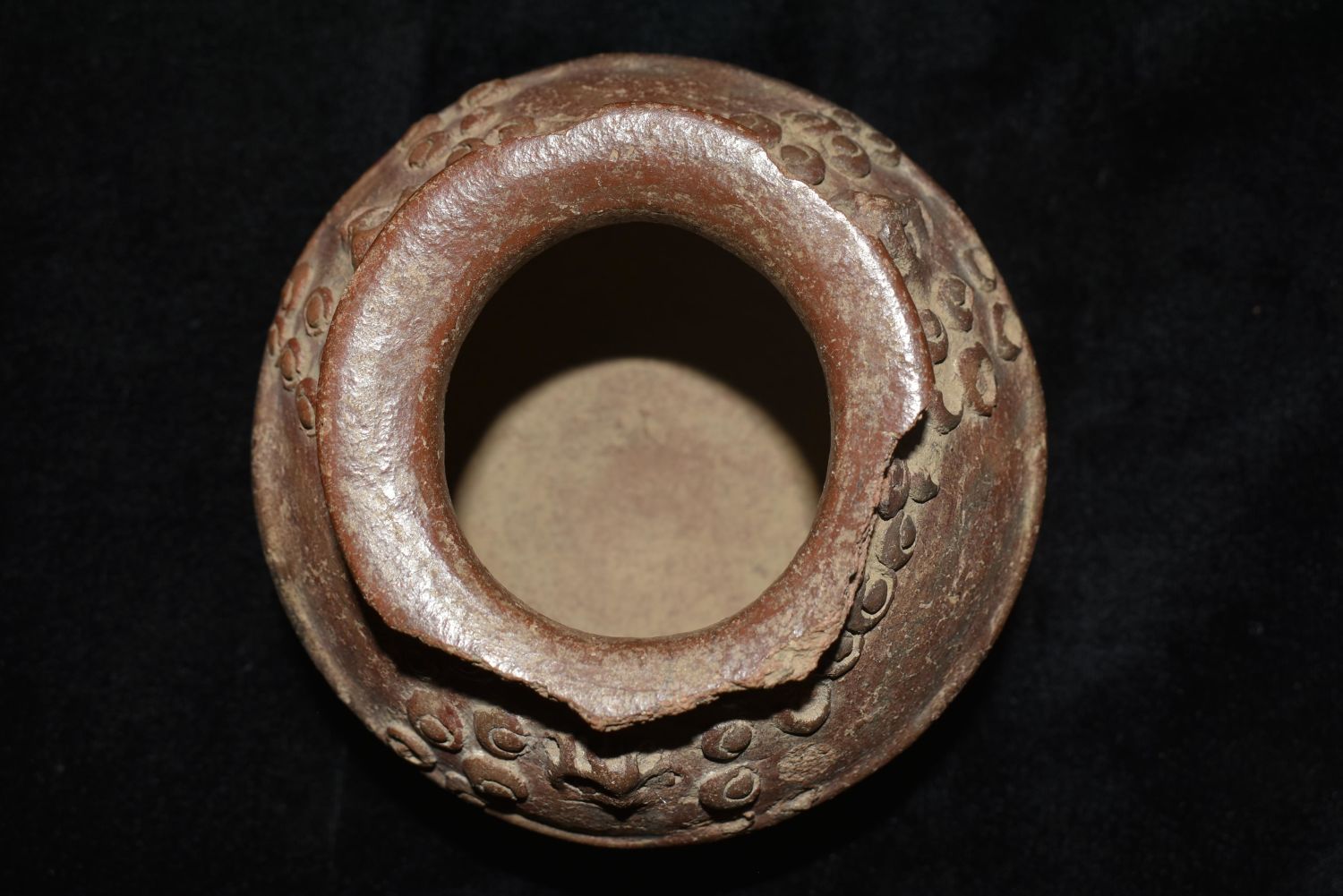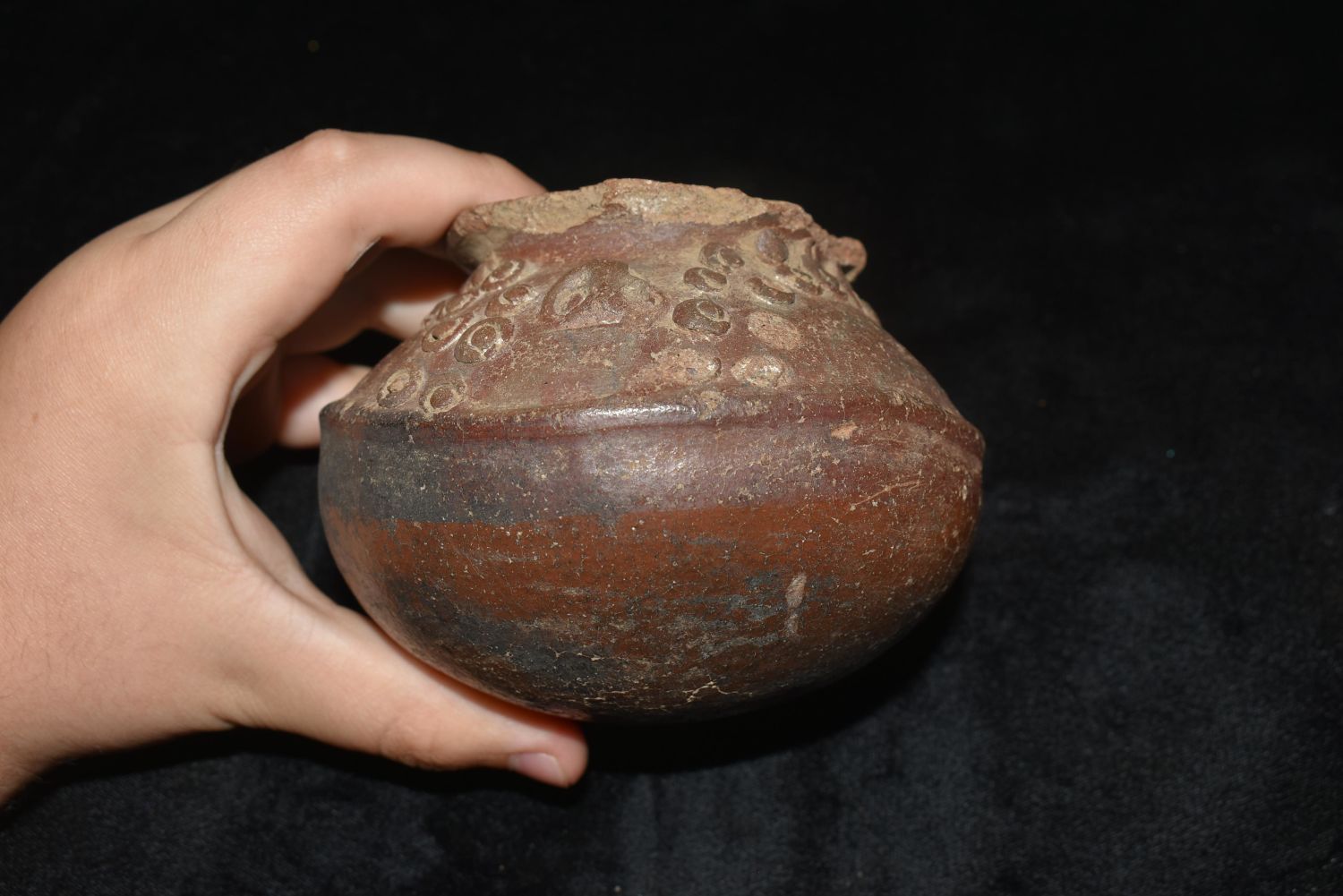 A fine El Bosque bowl from Costa Rica, ca. 100 BC – 500 AD. It is 4-1/2” in diameter and is decorated with a trio of monkey heads and shell ornaments. The bottom of the vessel is painted dark red and is enhance with a black stripe. Strong mineral deposits.