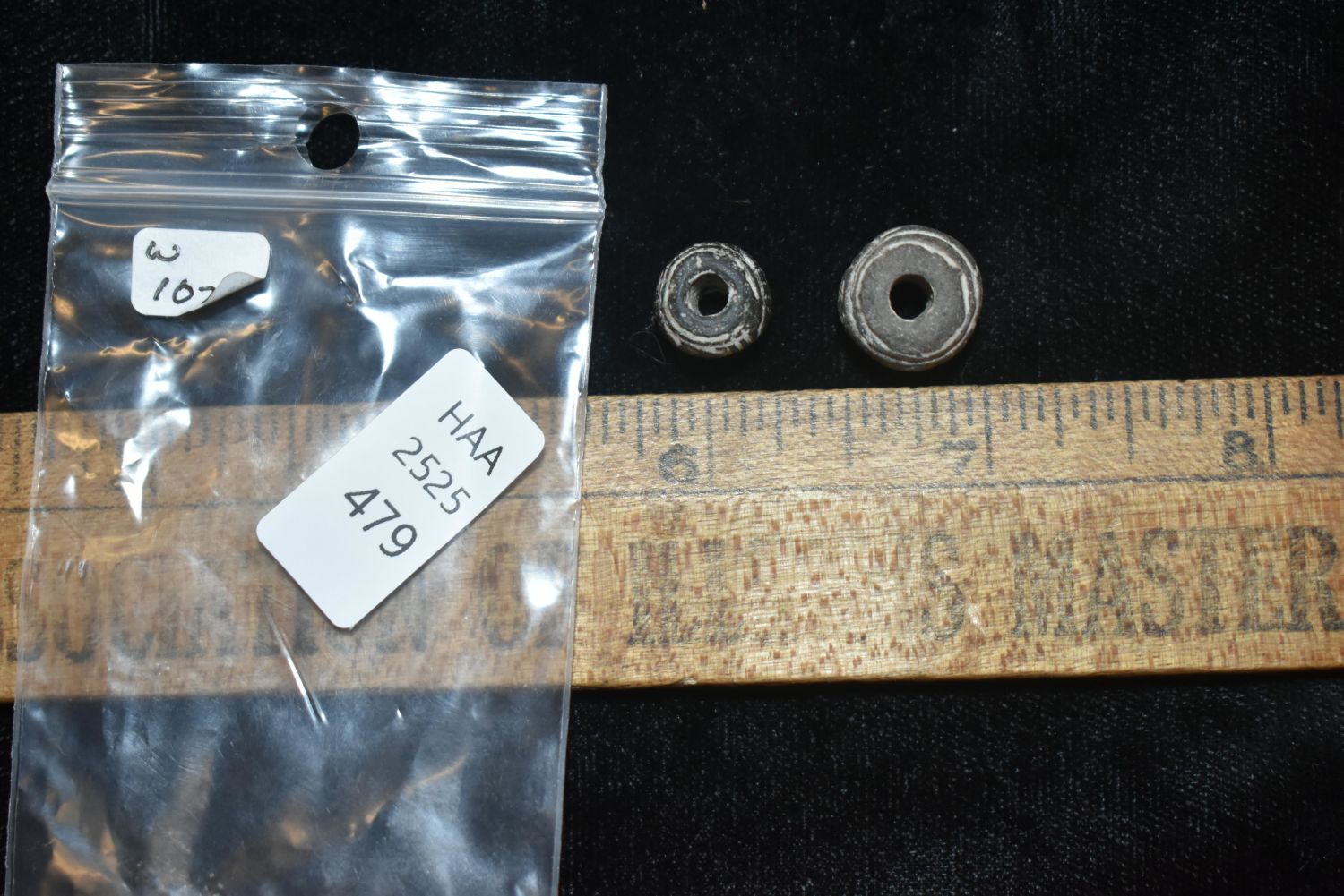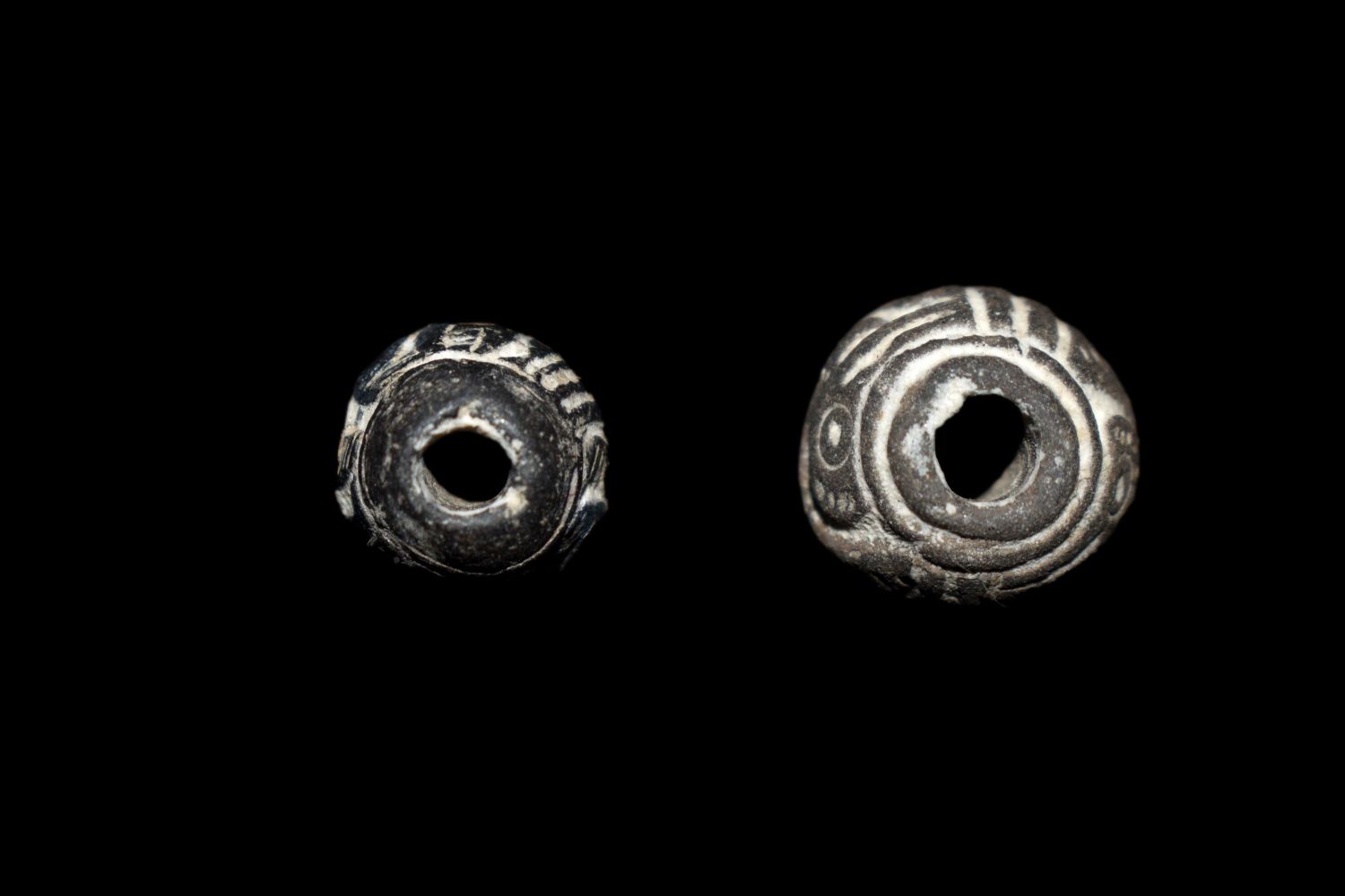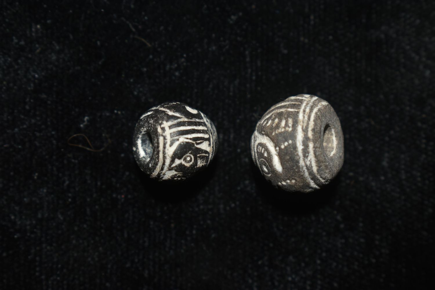 A pair of rare Manteno spindle whorls from Ecuador, ca. 1000 – 1500 AD. They are 14 mm long and feature fish and mythological animals.