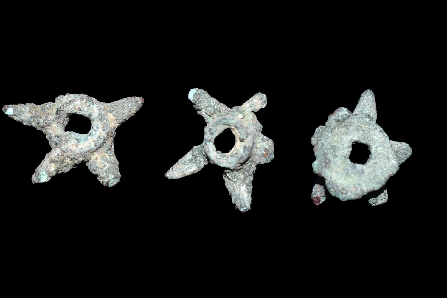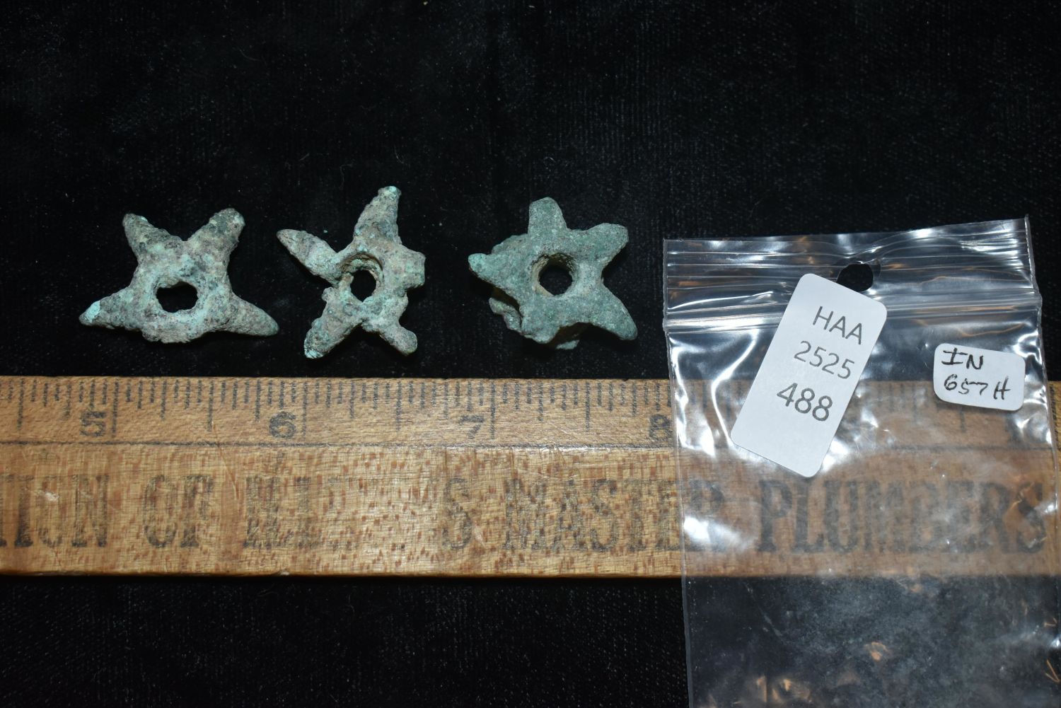 A trio of Chimu/Inca copper mace head pendants from Peru, ca. 1300 – 1500 AD. They are 1” in diameter and are miniature examples of traditional battle maces. Good mineral deposits.