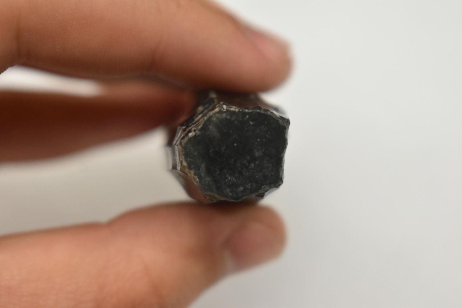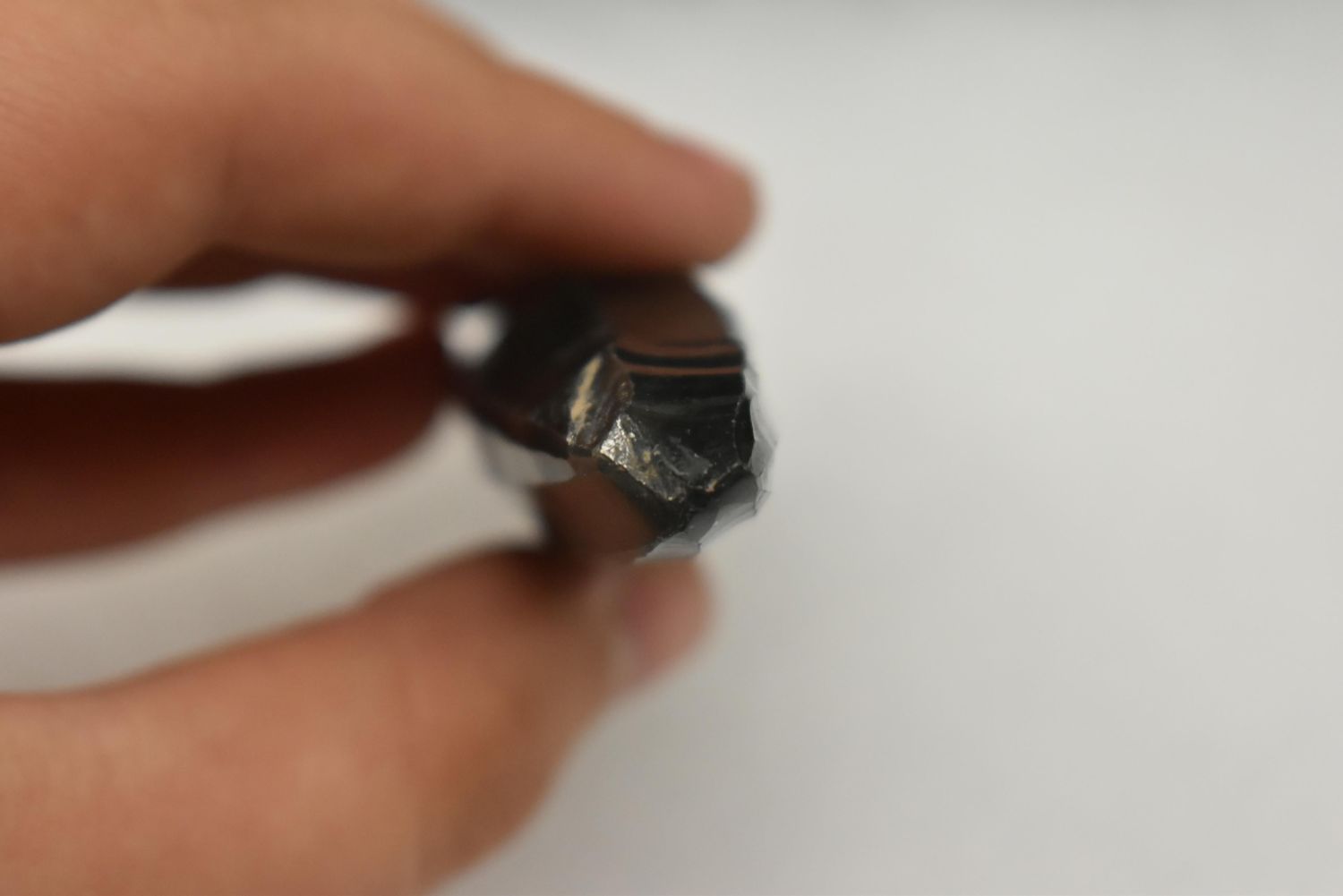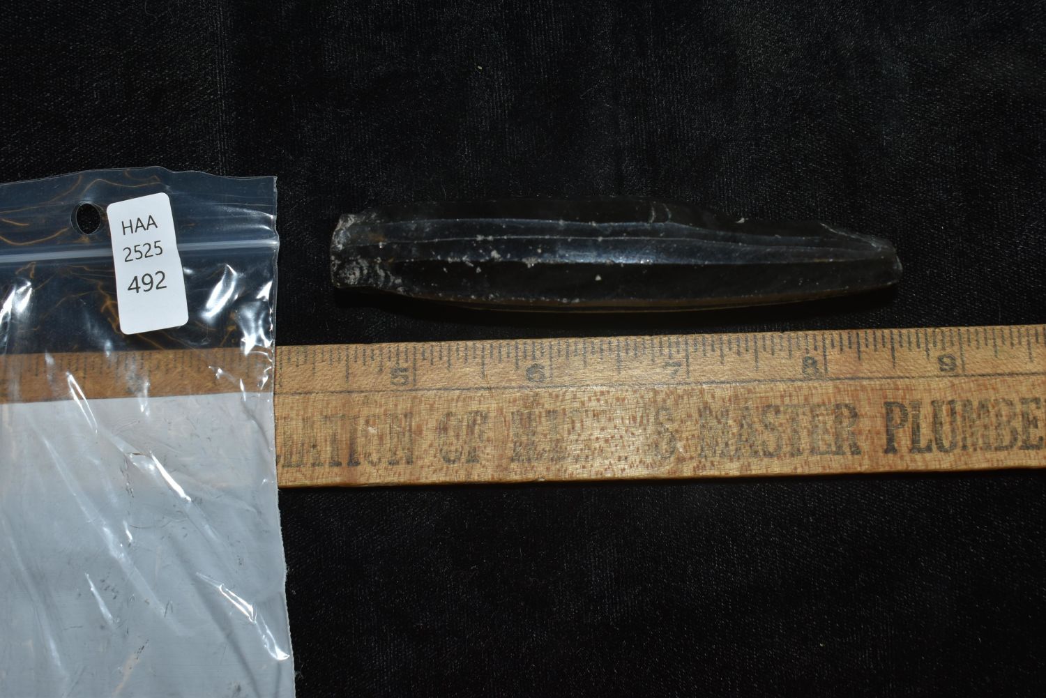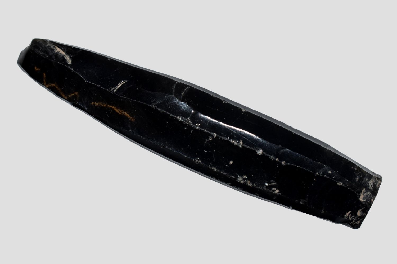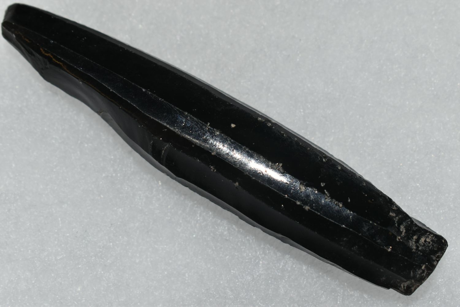 A choice Maya obsidian core from Guatemala, ca. 400 – 1000 AD. It is 4” long and shows how the thin prismatic blades were flaked from it. An exceptional example.