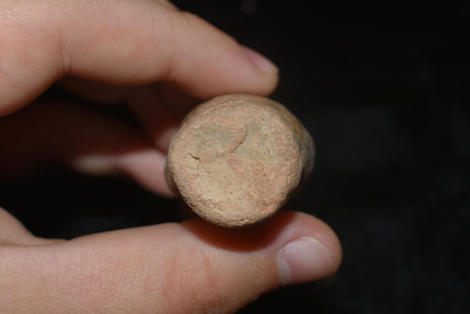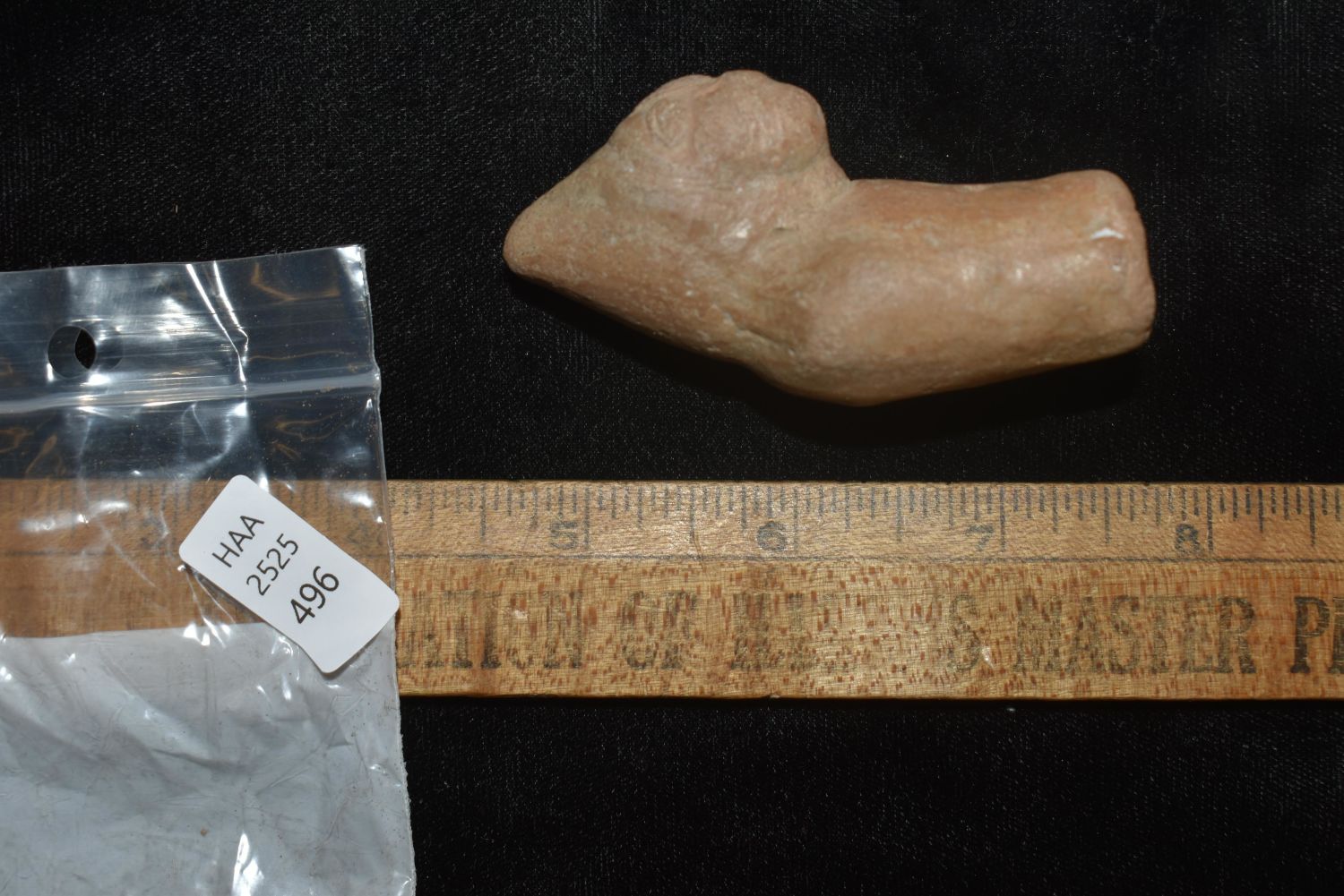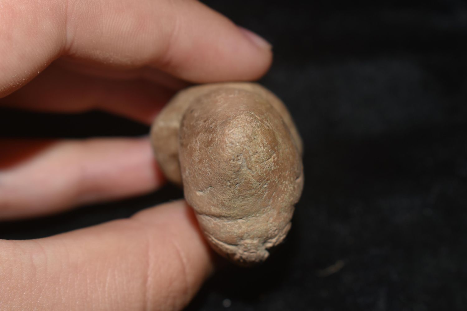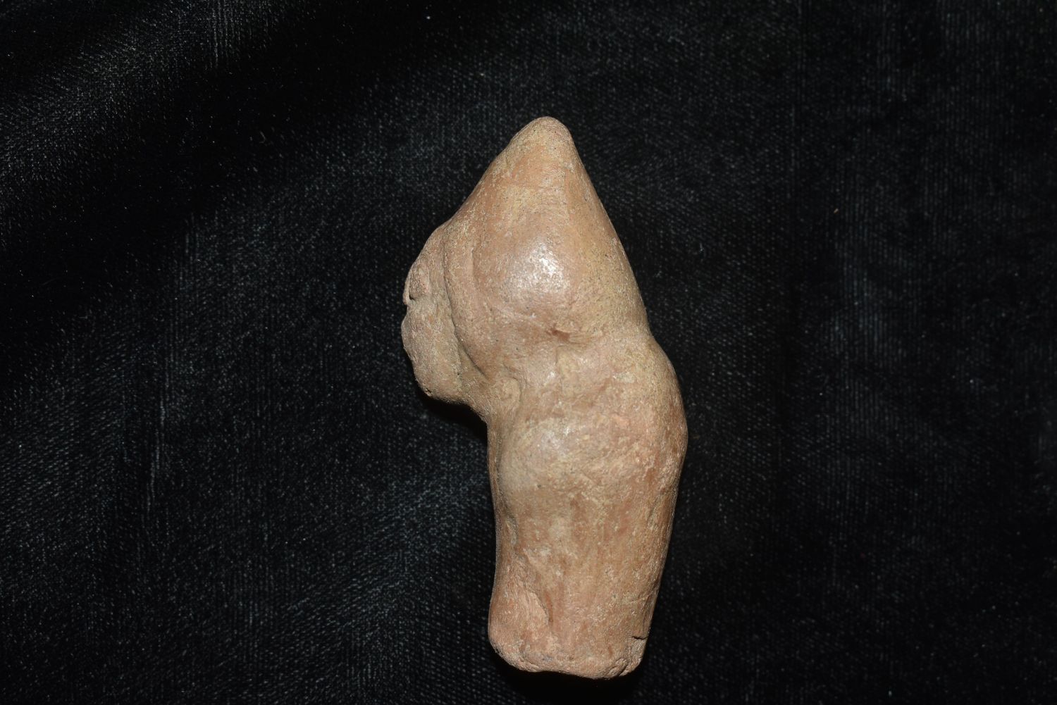 A fine Colima rattle figure from West Mexico, ca. 300 BC – 300 AD. It is 3” high and depicts a hooded, hunched-over figure. The hollow body contains rattles and the slip high nicely burnished. Intact, with good mineral deposits.