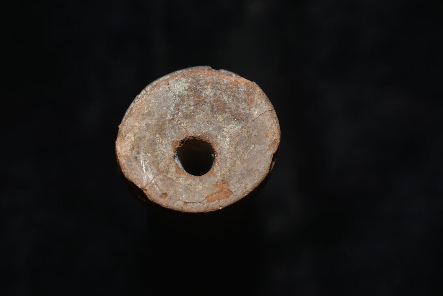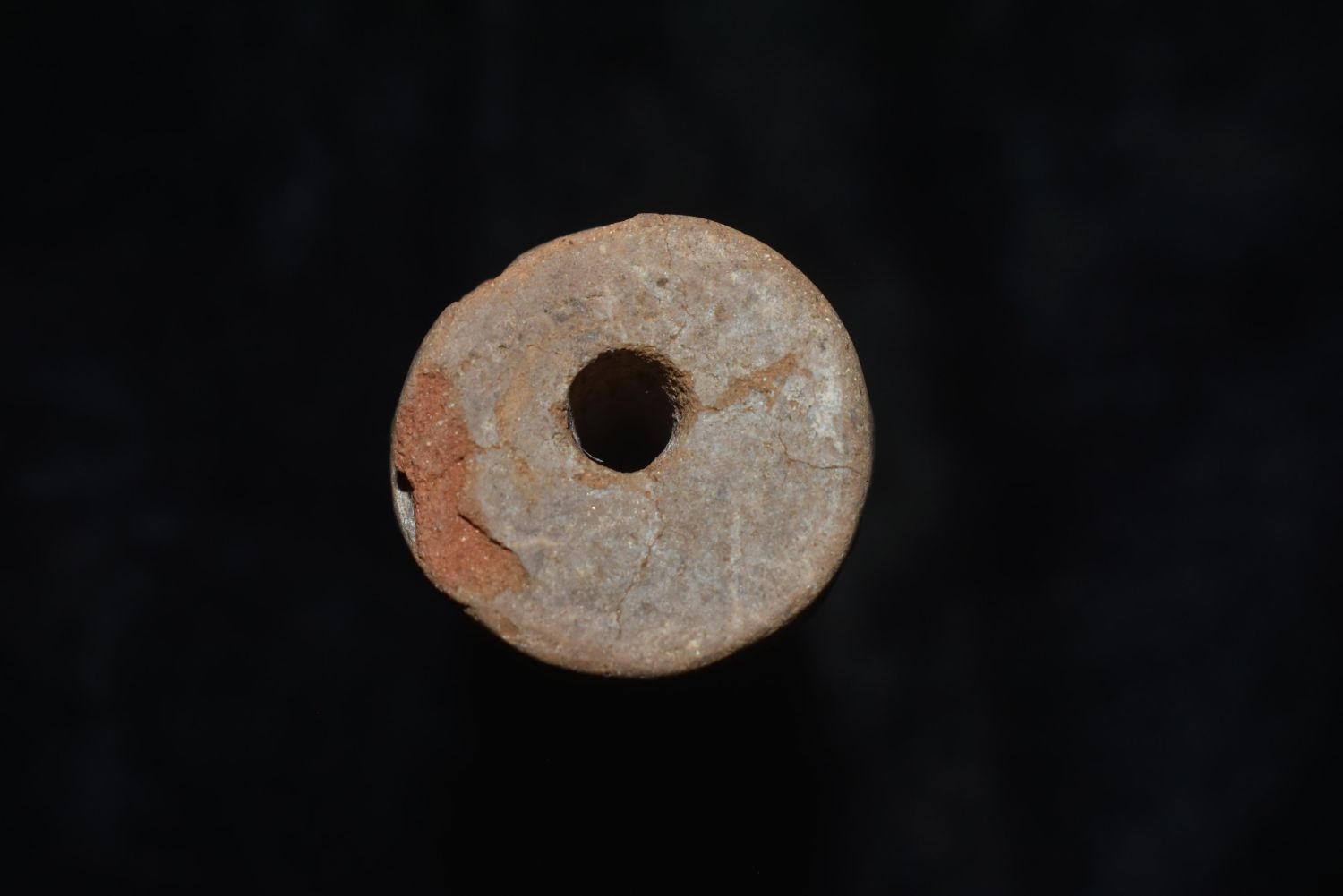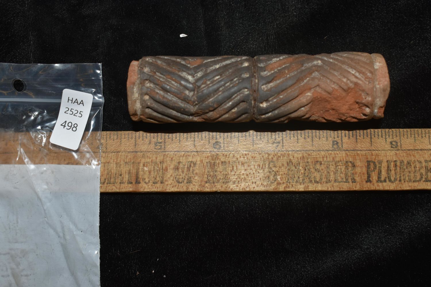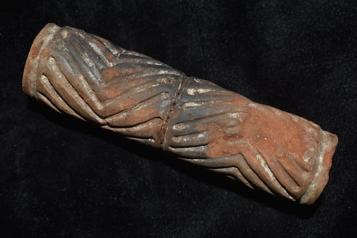 A rare El Chanal sello (roller seal) from West Mexico, ca. 300 BC – 300 AD. This unusually large example is 4" long, 1-1/8" in diameter and is perforated lengthwise. It is decorated with two bands of deeply grooved chevron designs running in opposite directions. Strong mineral deposits, small losses.