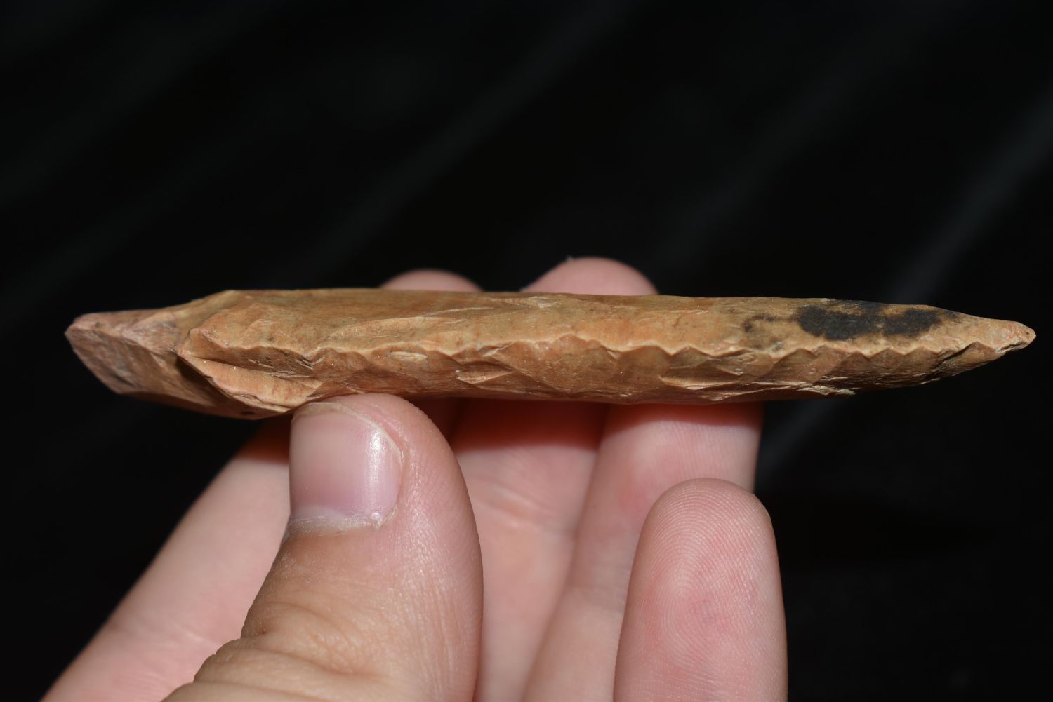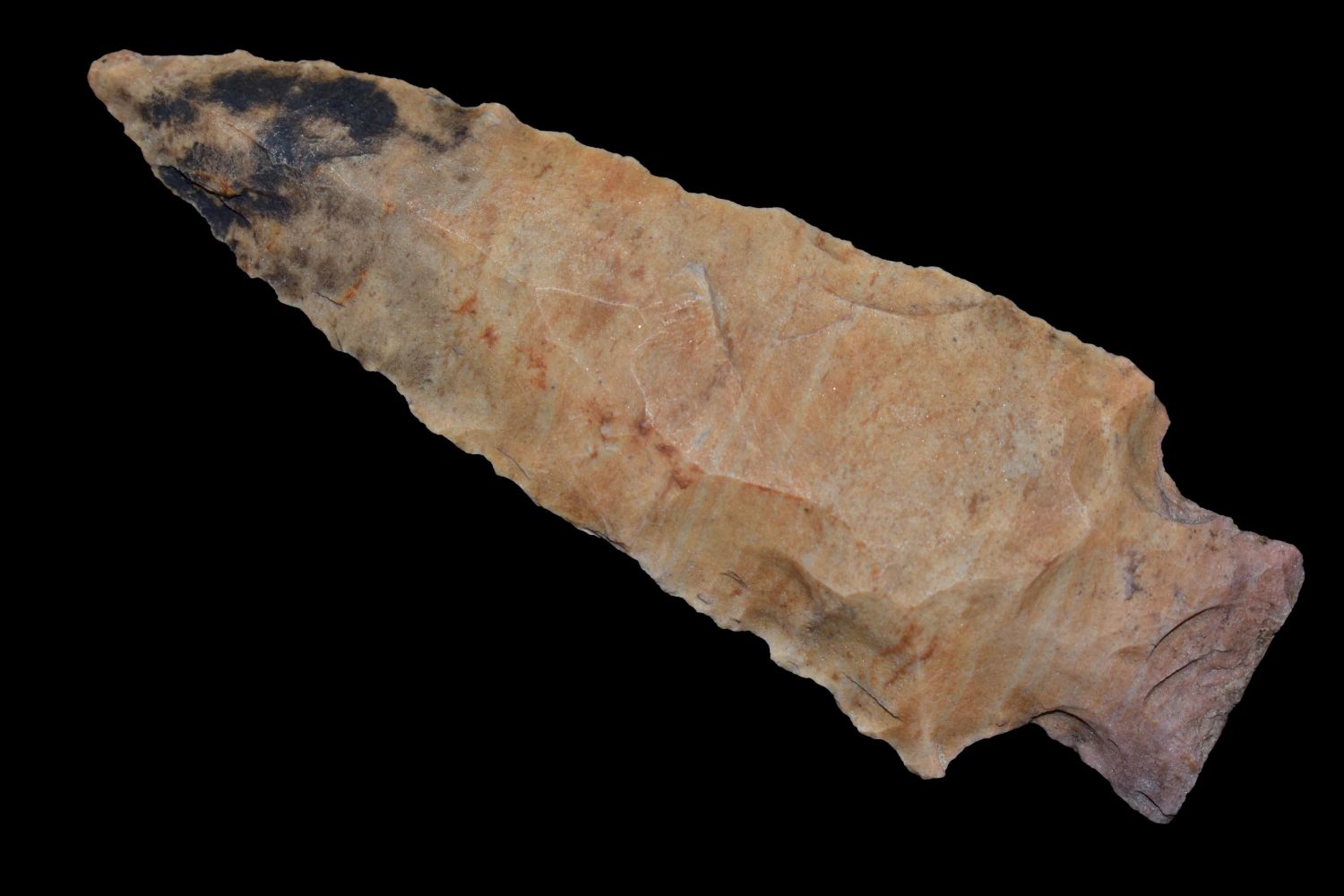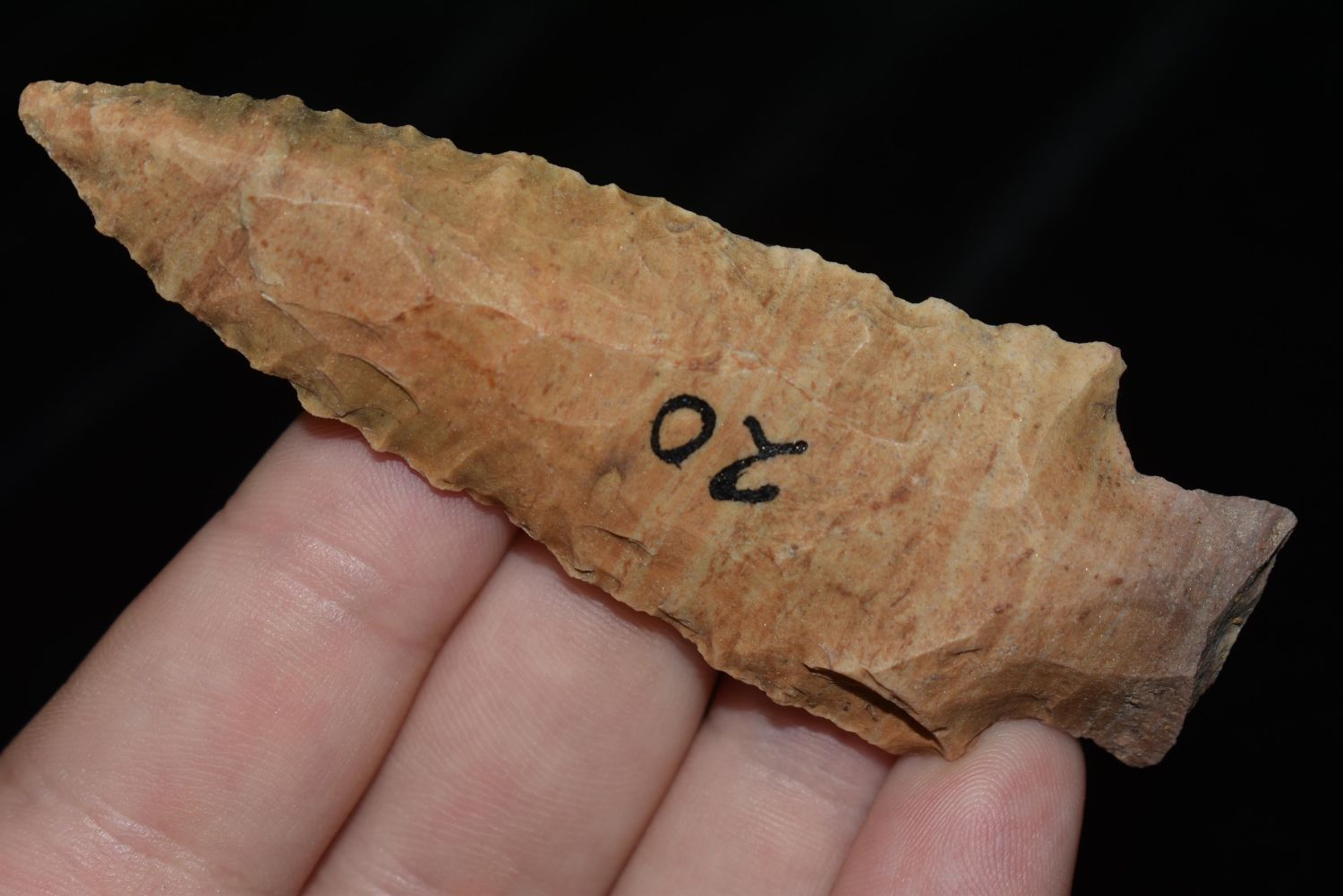 COLORFUL 3 3/8" BENTON FOUND IN BENTON/HUMPHREYS COUNTY TENNESSEE, EX SIMMS COLLECTION, NATIVE AMERICAN INDIAN ARROWHEAD