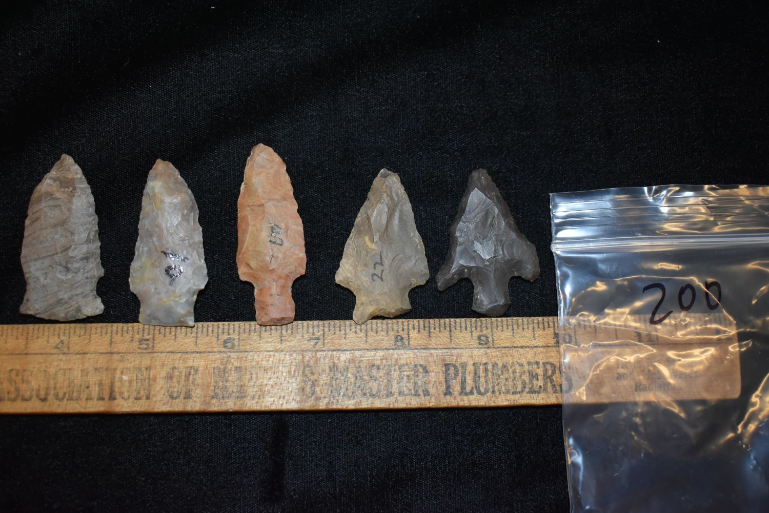 LOT OF 5 ARCHAIC ARROWHEADS FOUND IN BENTON/HUMPHREYS COUNTY TENNESSEE, EX SIMMS COLLECTION, NATIVE AMERICAN INDIAN ARTIFACT