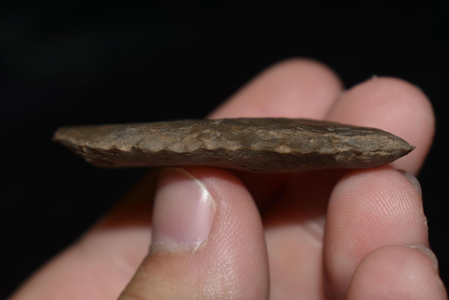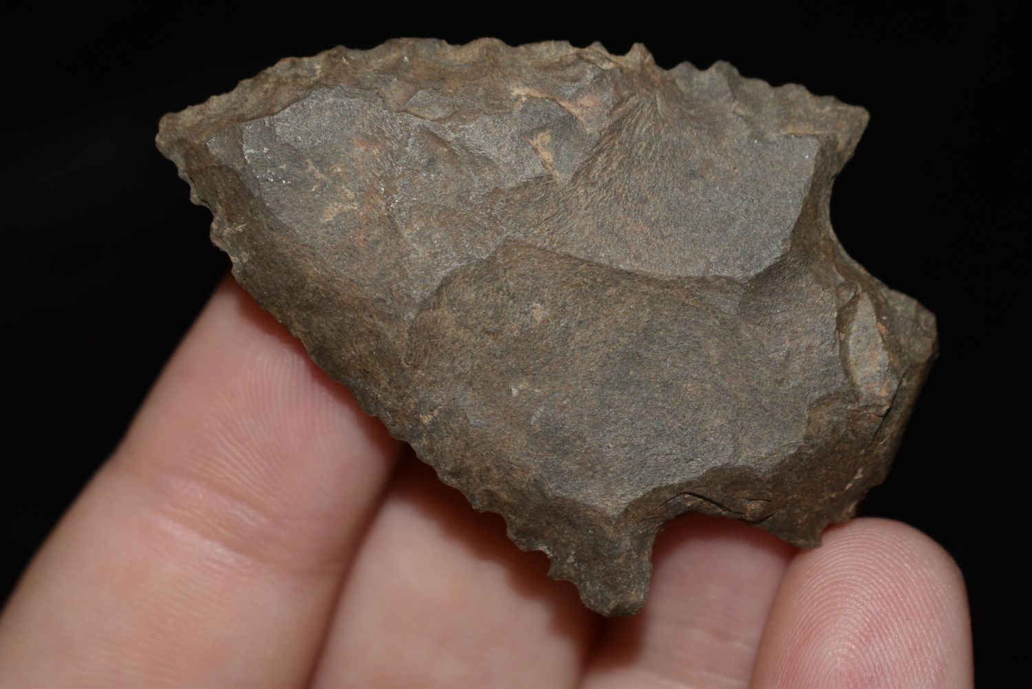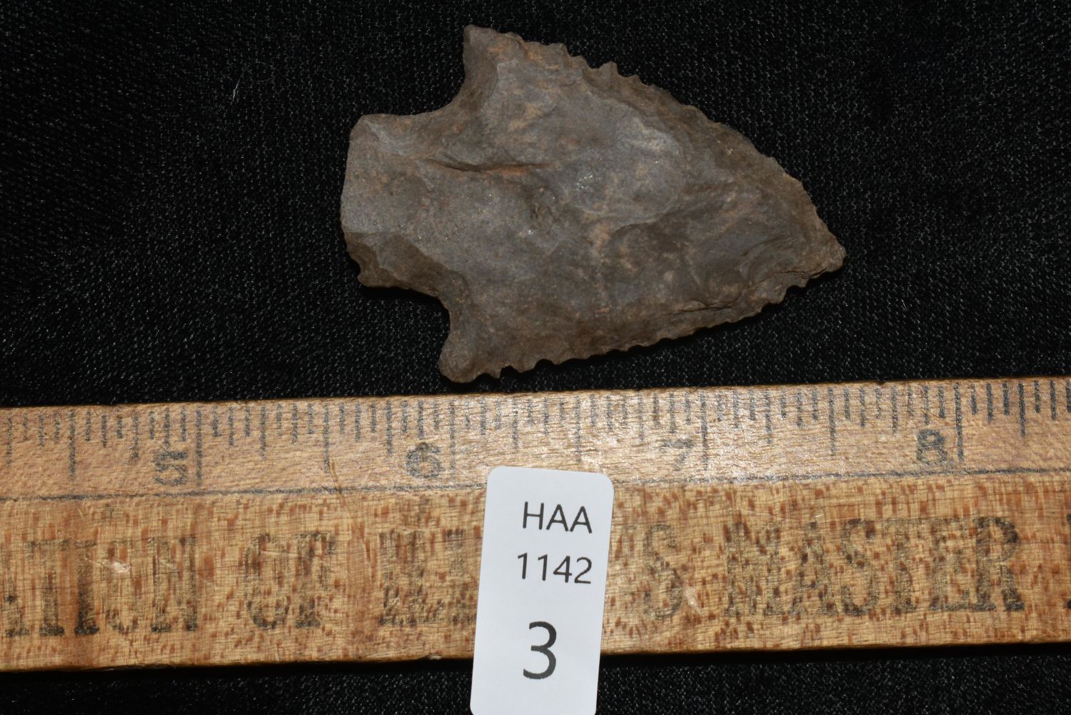 2" SERRATED KIRK STEMMED FOUND IN BENTON COUNTY TENNESSEE, EX SIMMS COLLECTION, NATIVE AMERICAN INDIAN ARROWHEAD, ARTIFACT