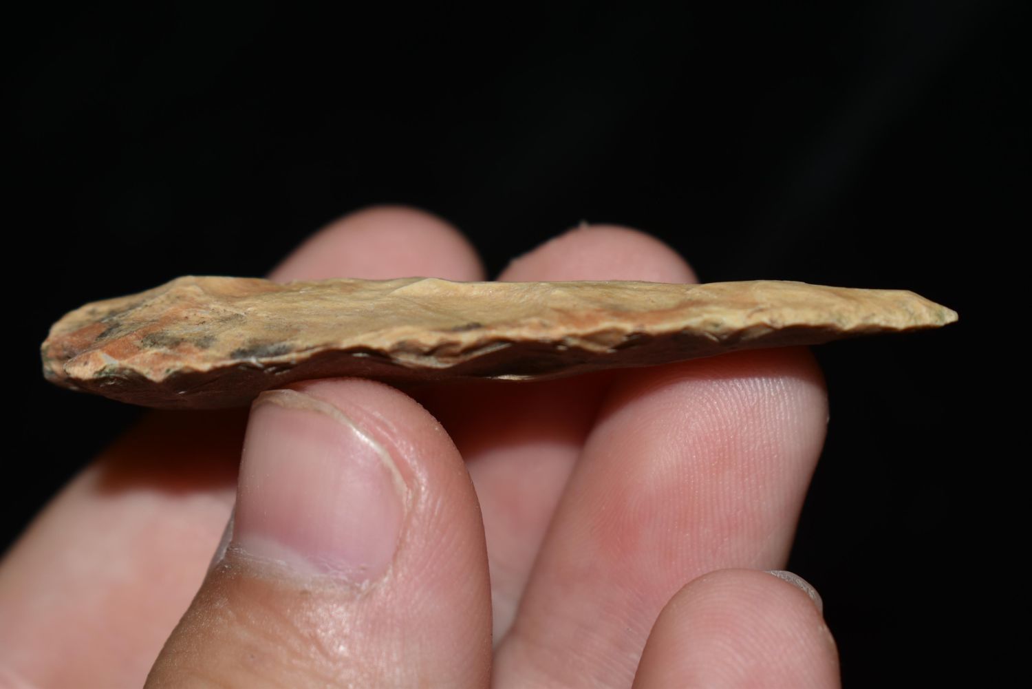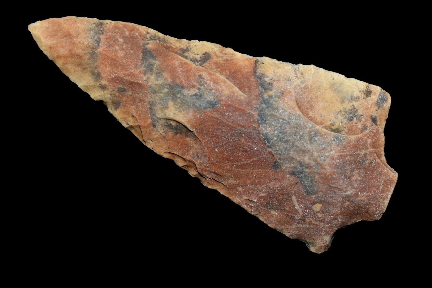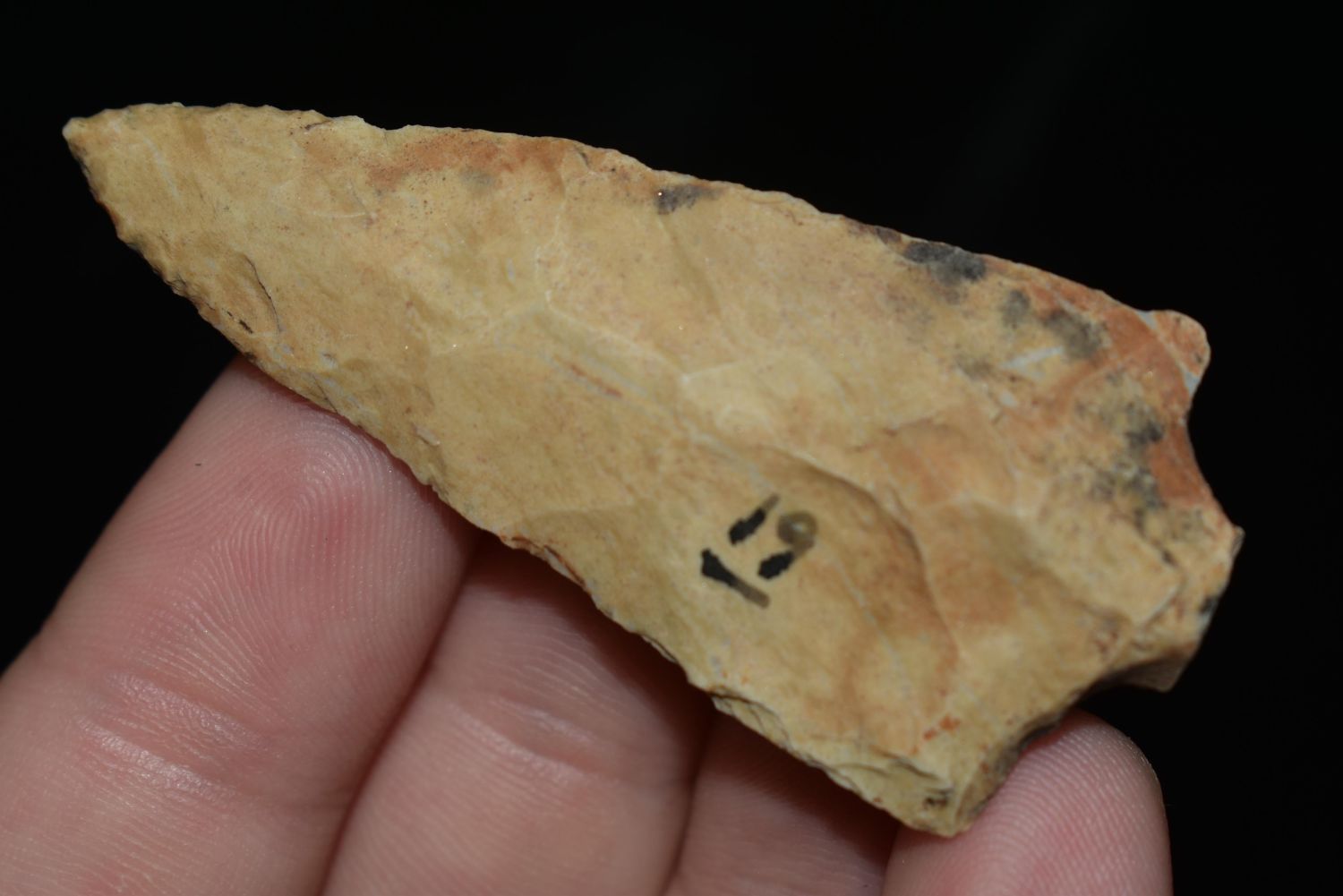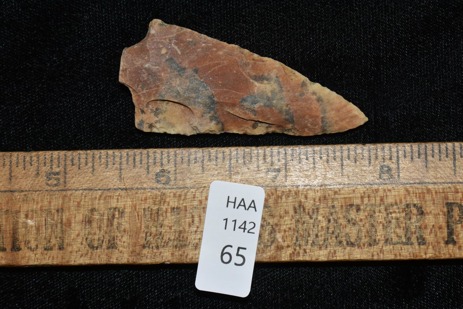 2 1/4" COLORFUL ADENA FOUND IN BENTON/HUMPHREYS COUNTY TENNESSEE, EX SIMMS COLLECTION, NATIVE AMERICAN INDIAN ARROWHEAD