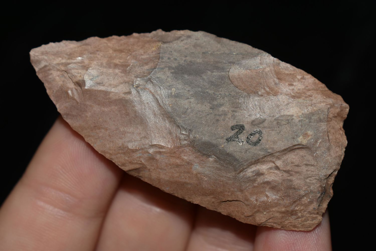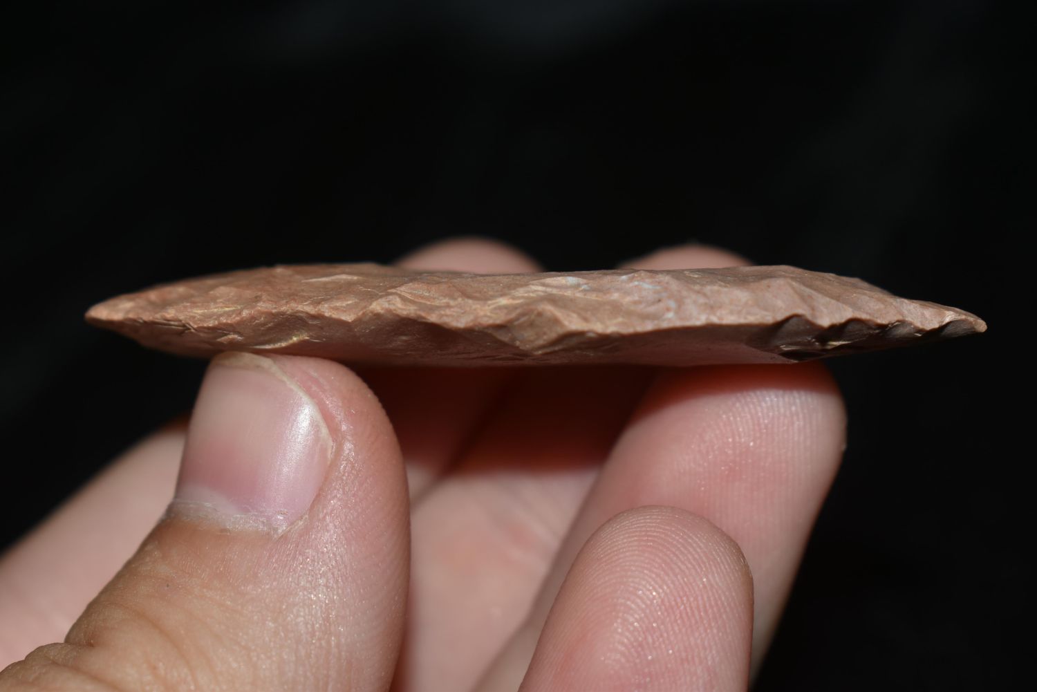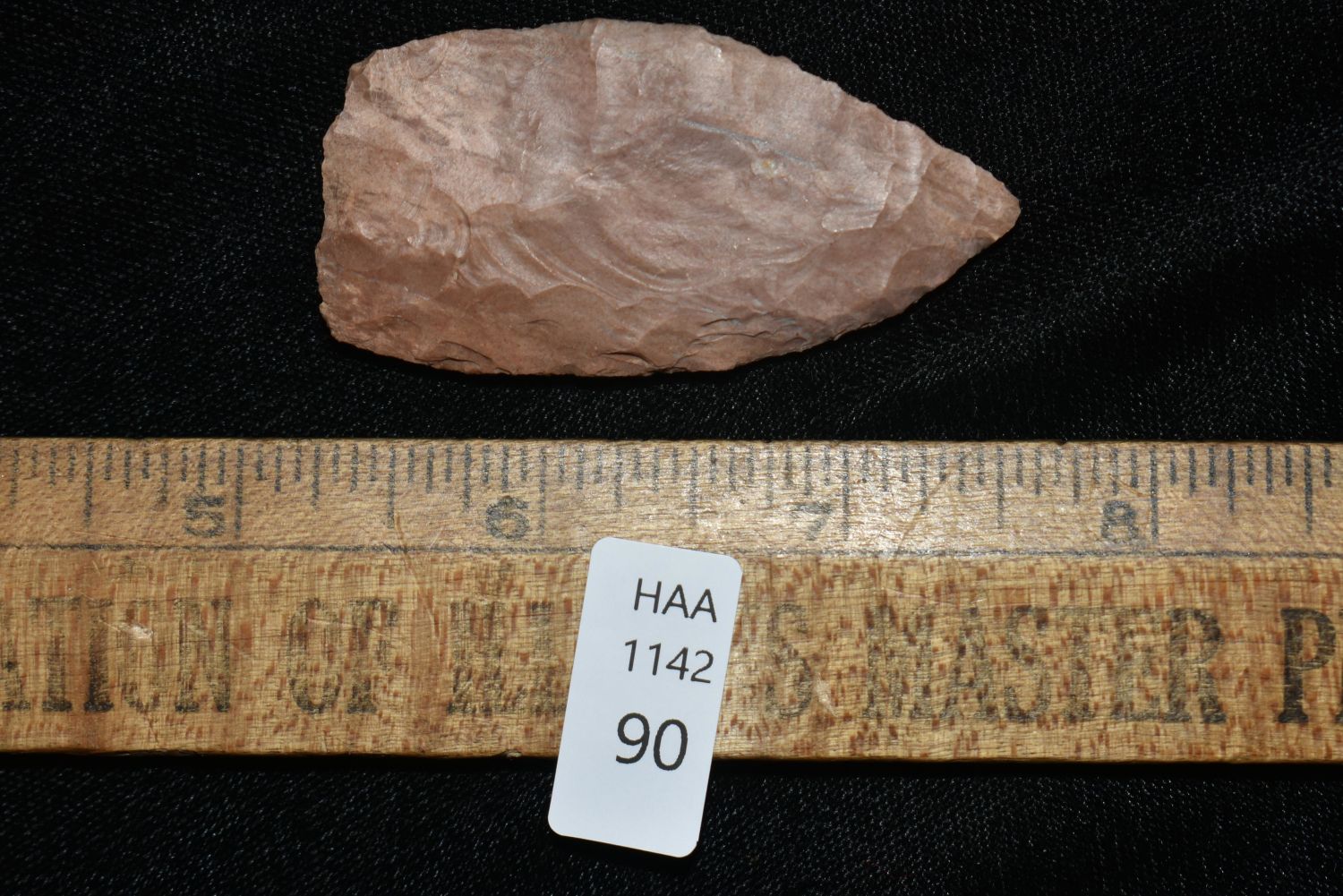 2 1/4" RED OCHRE BLADE FOUND IN BENTON/HUMPHREYS COUNTY TENNESSEE, EX SIMMS COLLECTION, NATIVE AMERICAN INDIAN ARROWHEAD