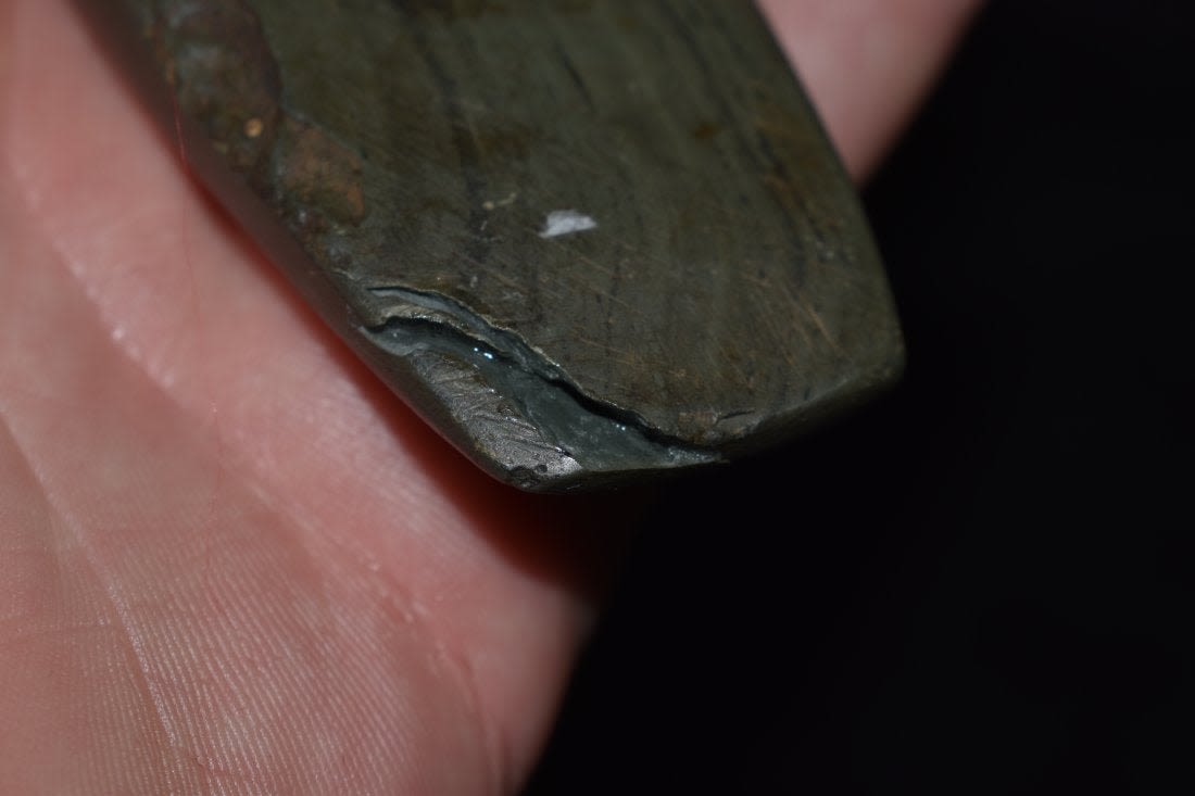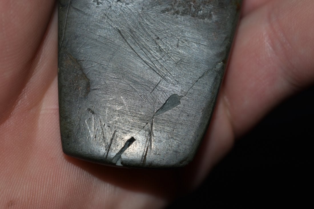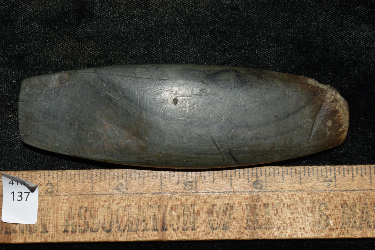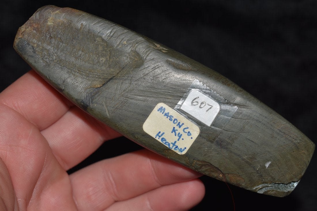 4 3/4" Undrilled Slate Gorget found in Mason County, Kentucky. Does have one side broken and reglued