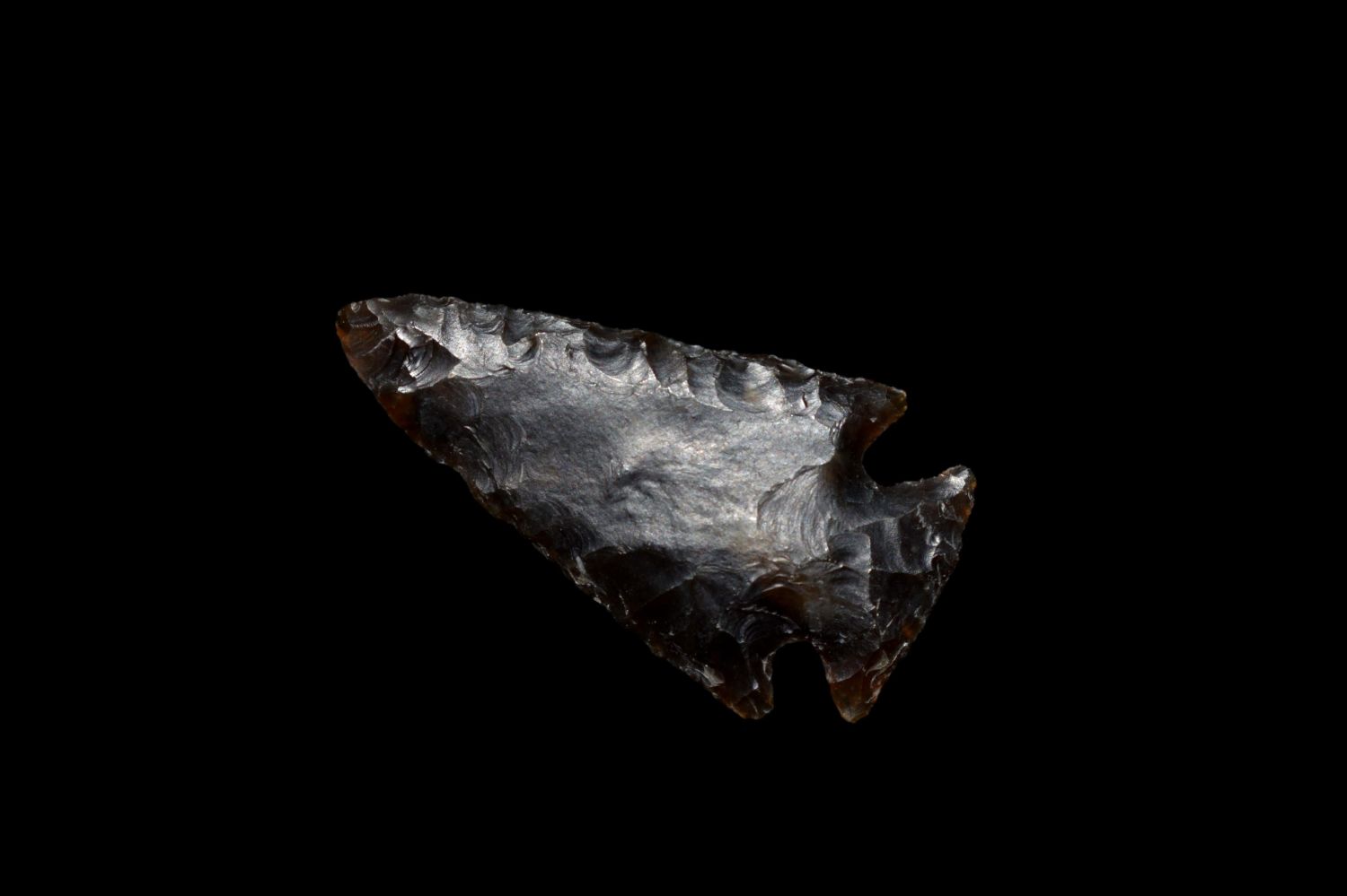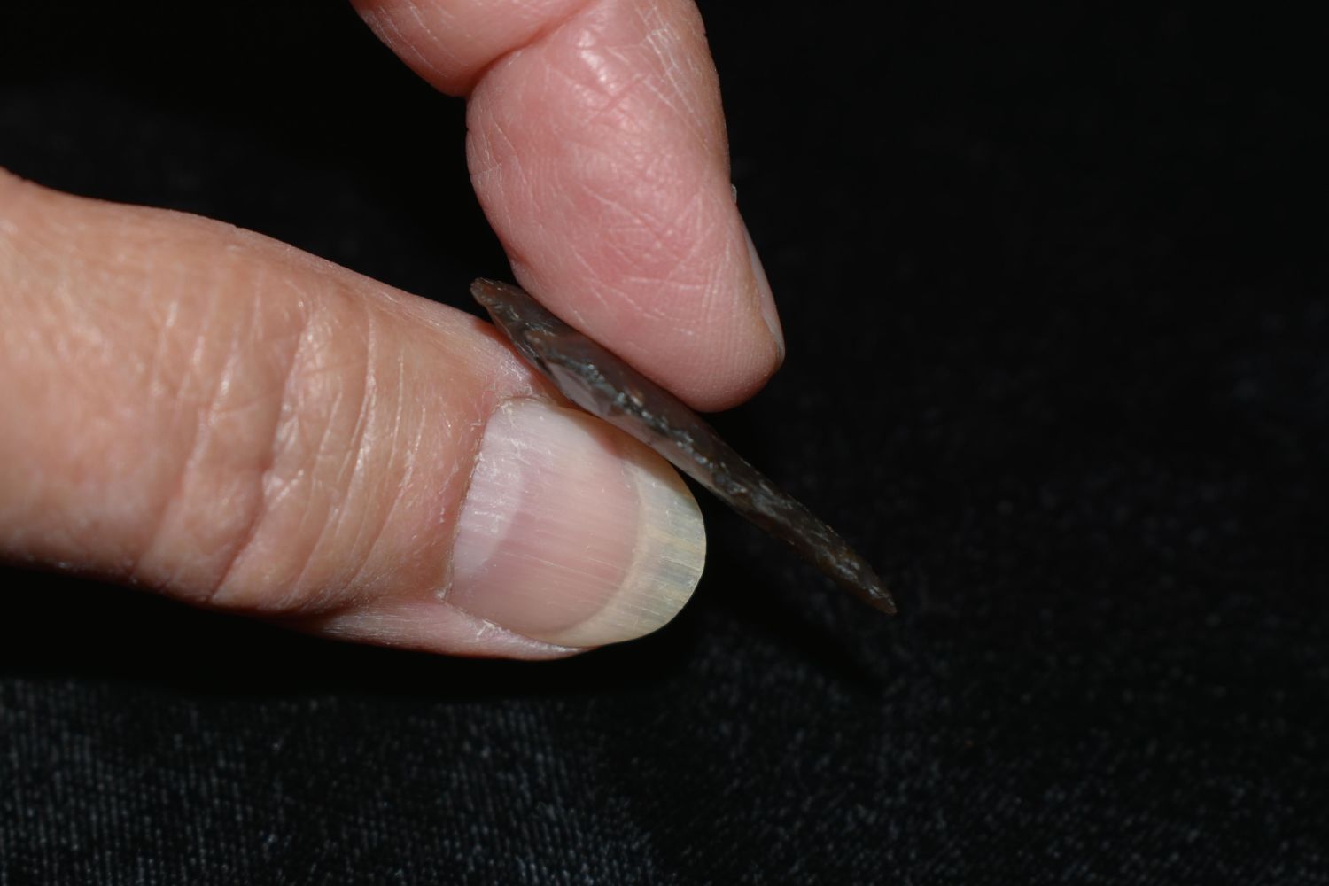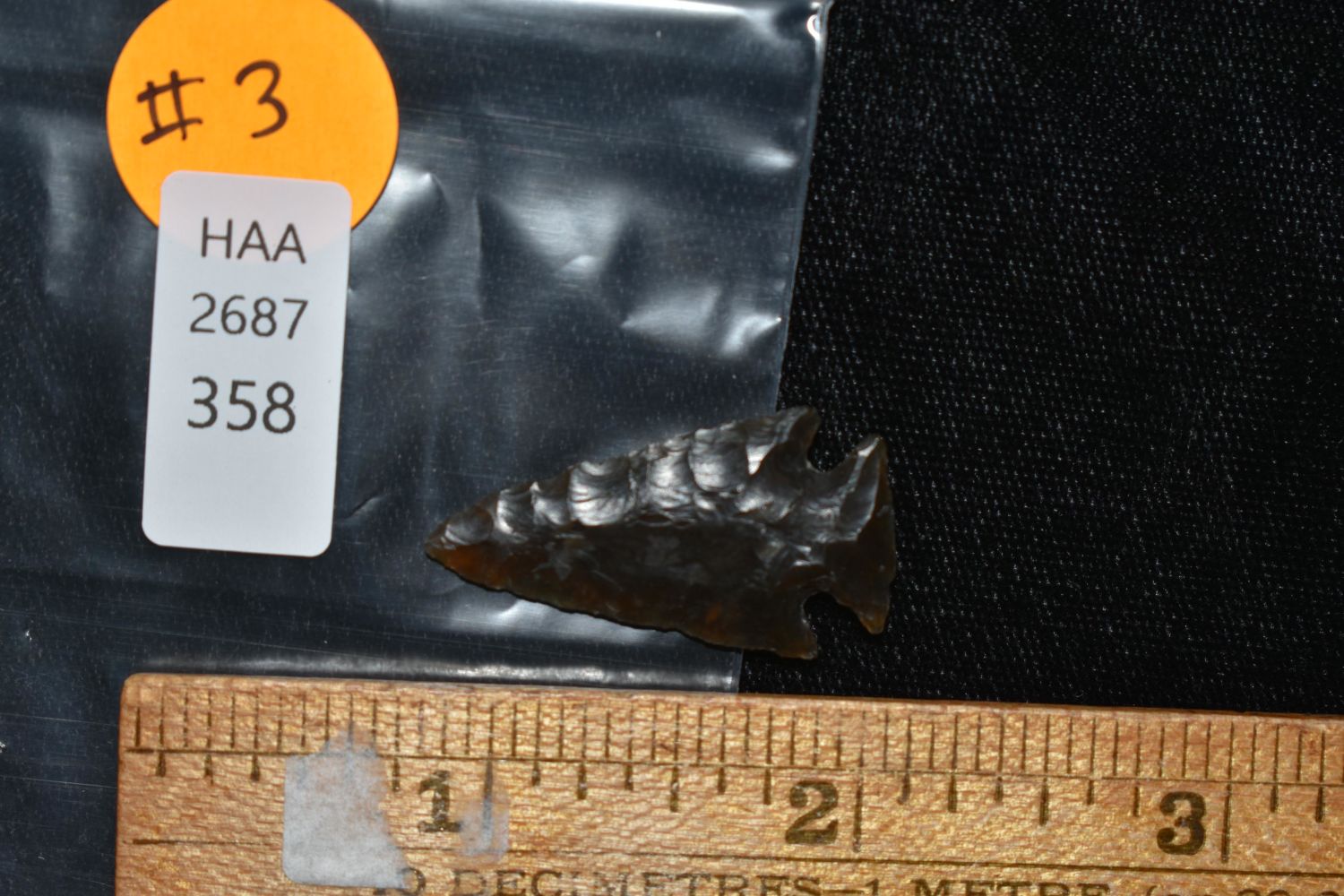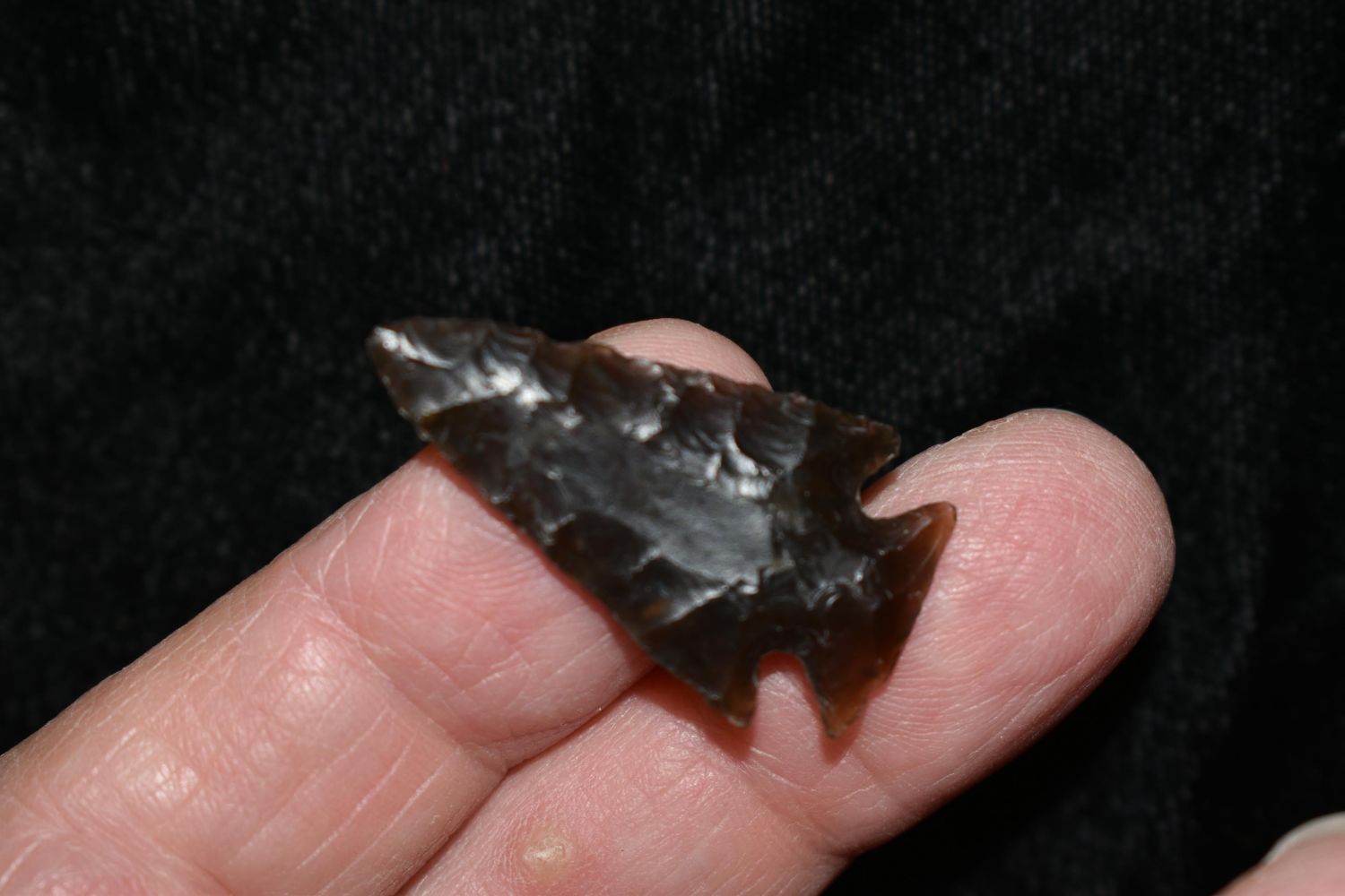 1 1/4" Corner Notch Bird Point made of Knife River Flint Found By Fred Kronenburg in Makoti North Dakota (Ward County)
