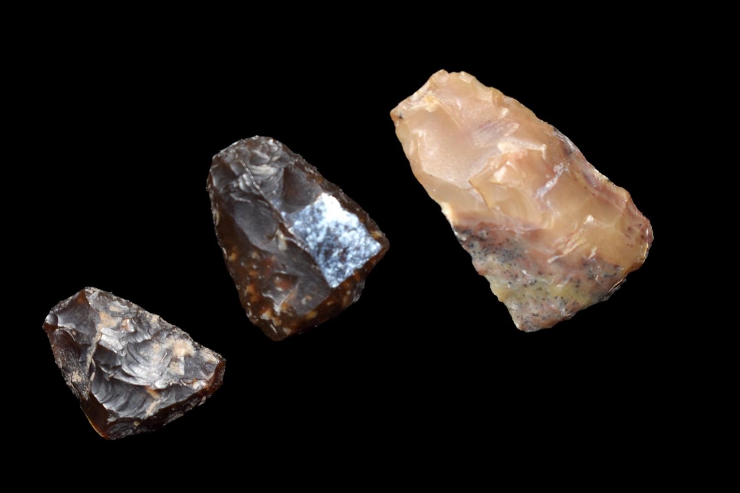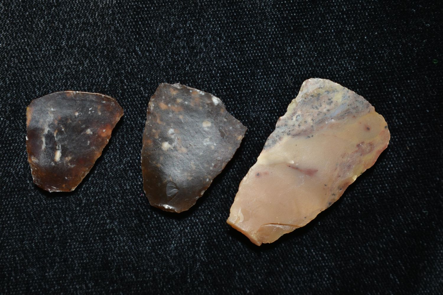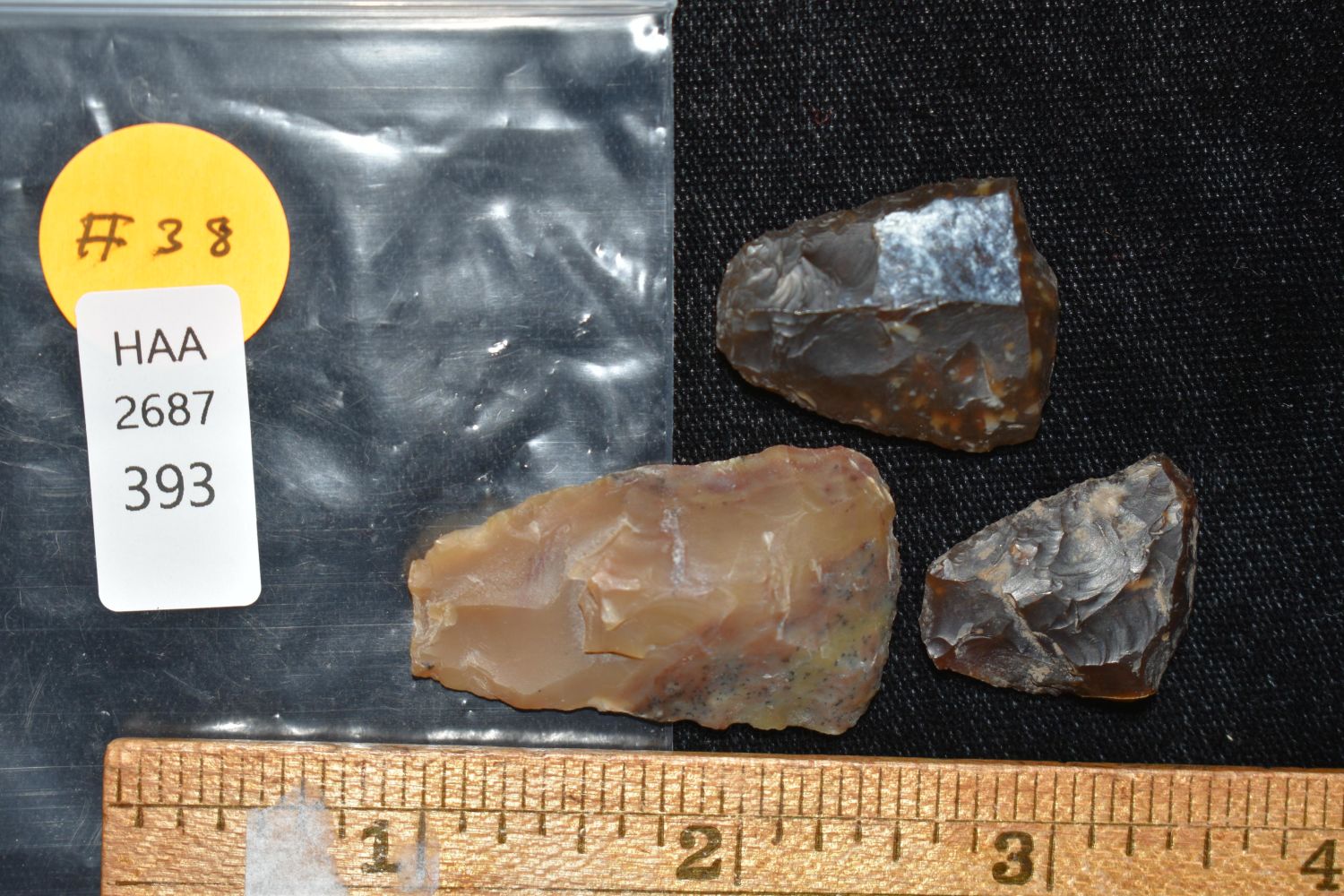 Lot of 3 Thumb Scrapers made of Knife River Flint Found By Fred Kronenburg in Makoti North Dakota (Ward County) Largest piece is 1 1/2"