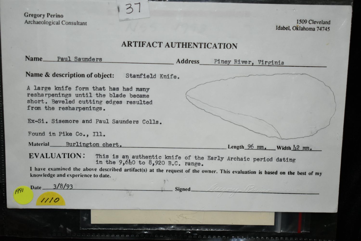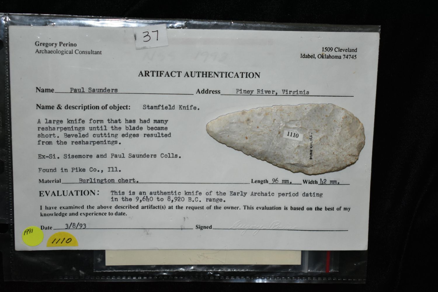 3 3/4" Cobbs Blade Pike Co Illinois Greg Perino COA