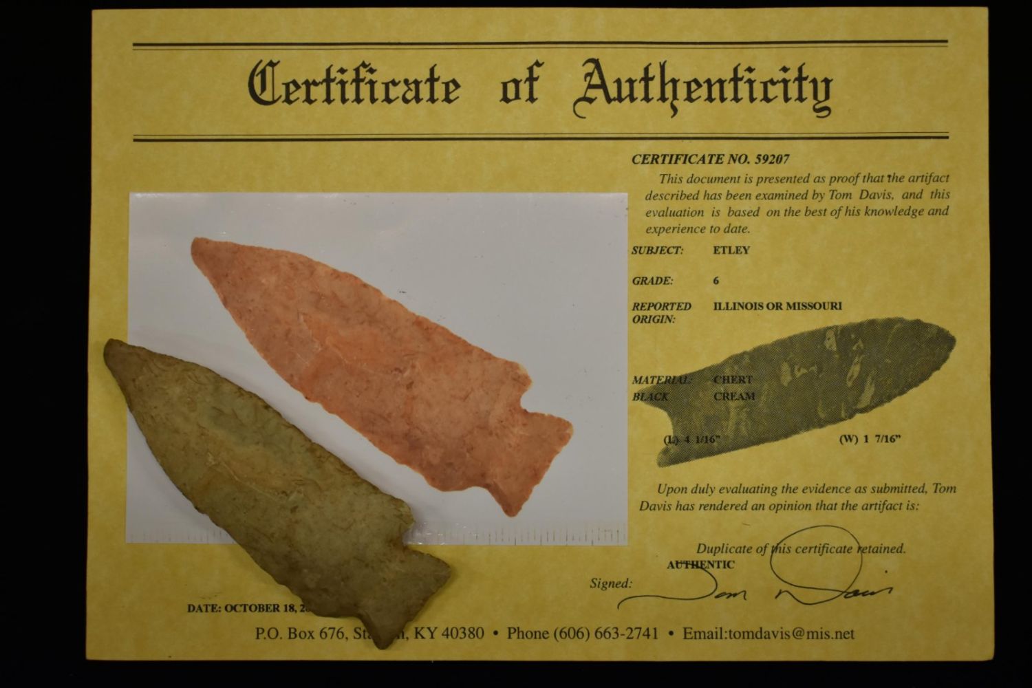 4/16" Etley, Tom Davis COA, found in Illinois or Missouri, Burlington Chert, Authentic Native American Arrowhead