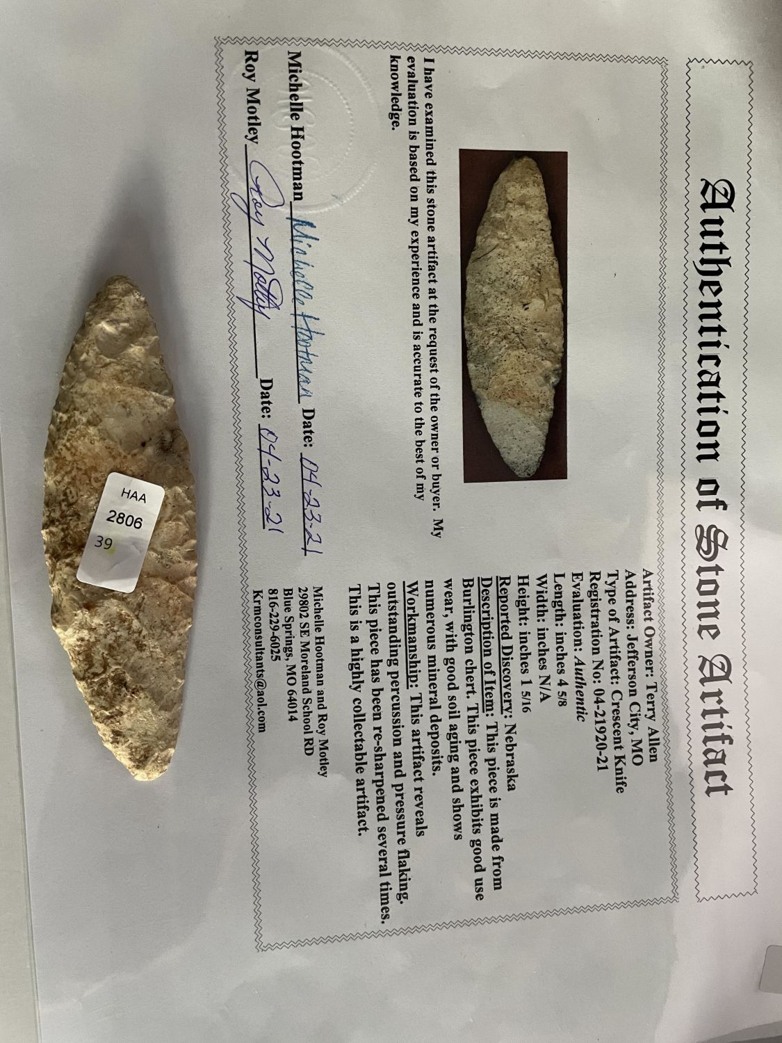 4 5/8" Crescent Knife, Motley COA, Recovered in