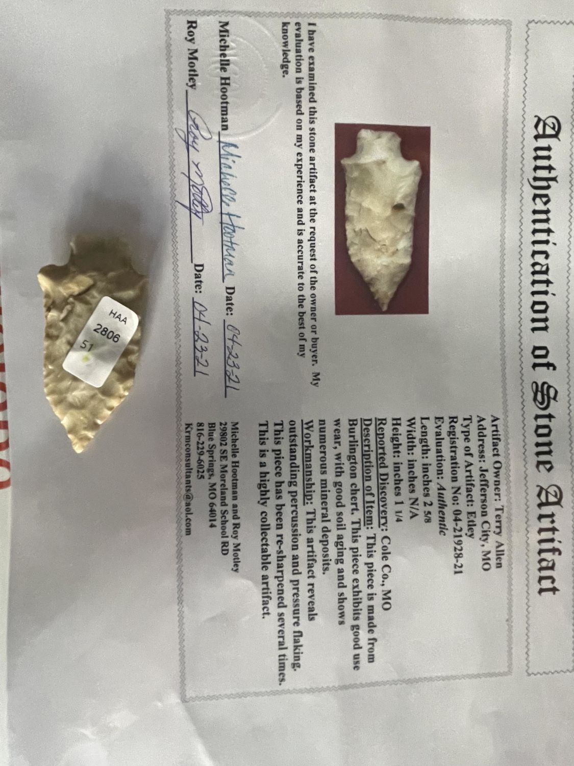 2 5/8" Etley, Motley COA, Recovered in Cole Co. MO,