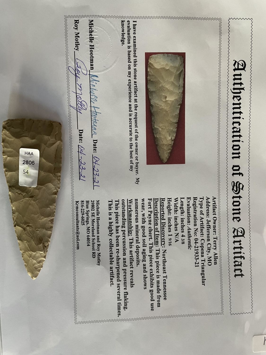 4 3/8" Copena Triangular, Motley COA, Recovered in