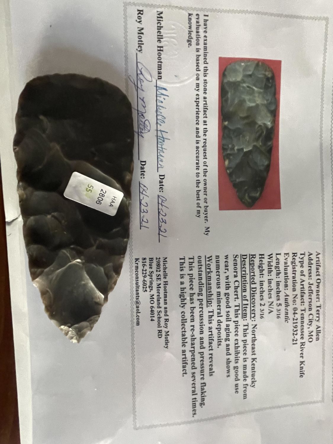 5 3/16" Tennessee River Knife, Motley COA, Recovered in