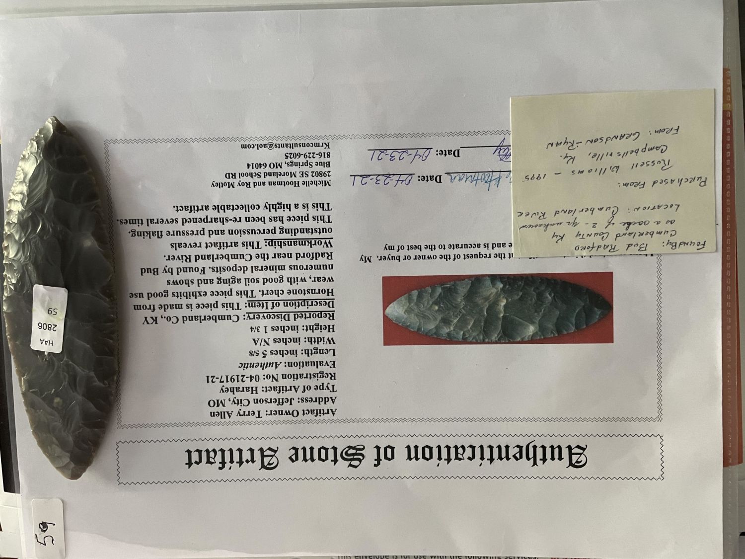5 5/8" Harahey, Motley COA, Recovered in Cumberland Co.