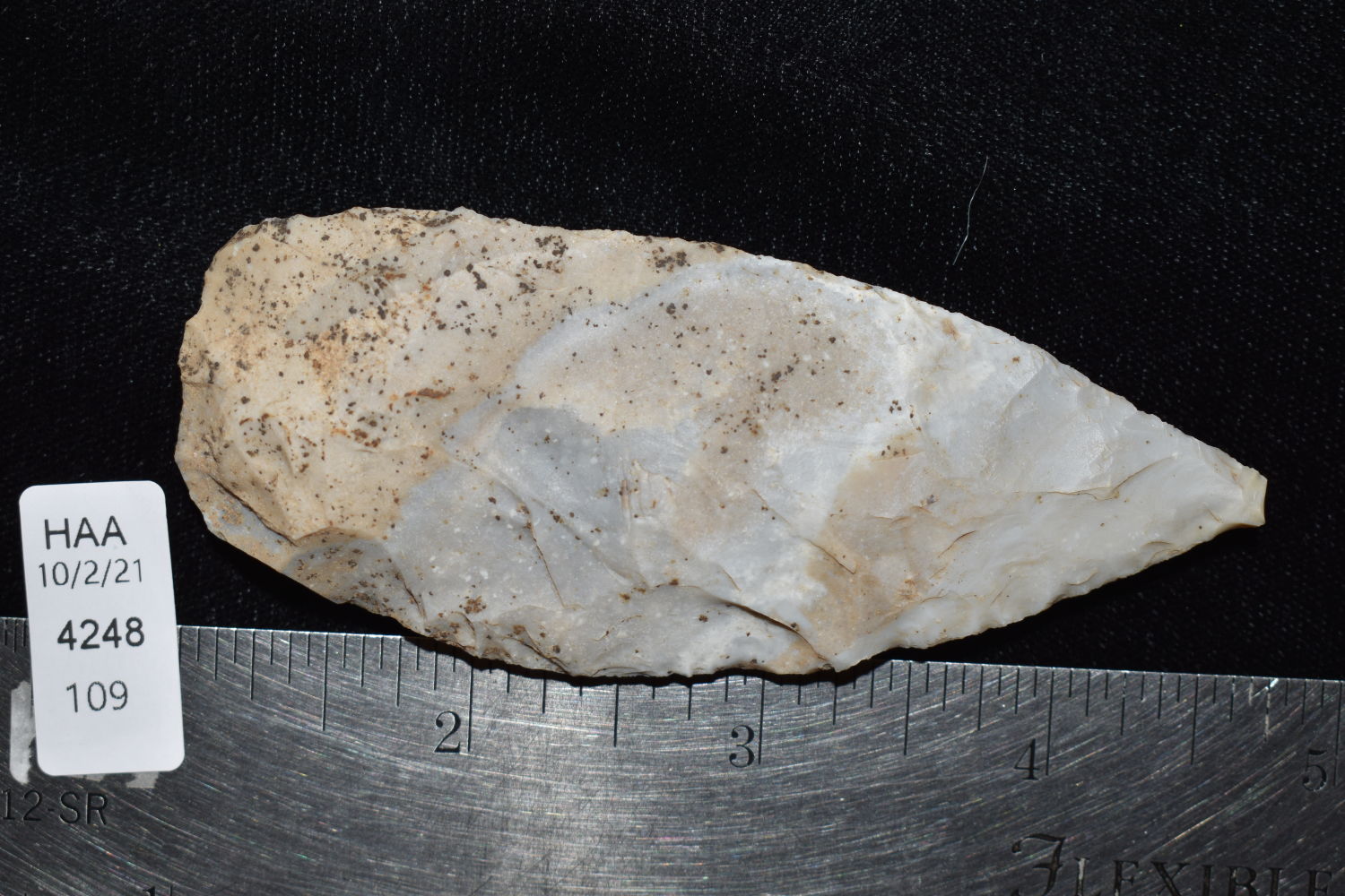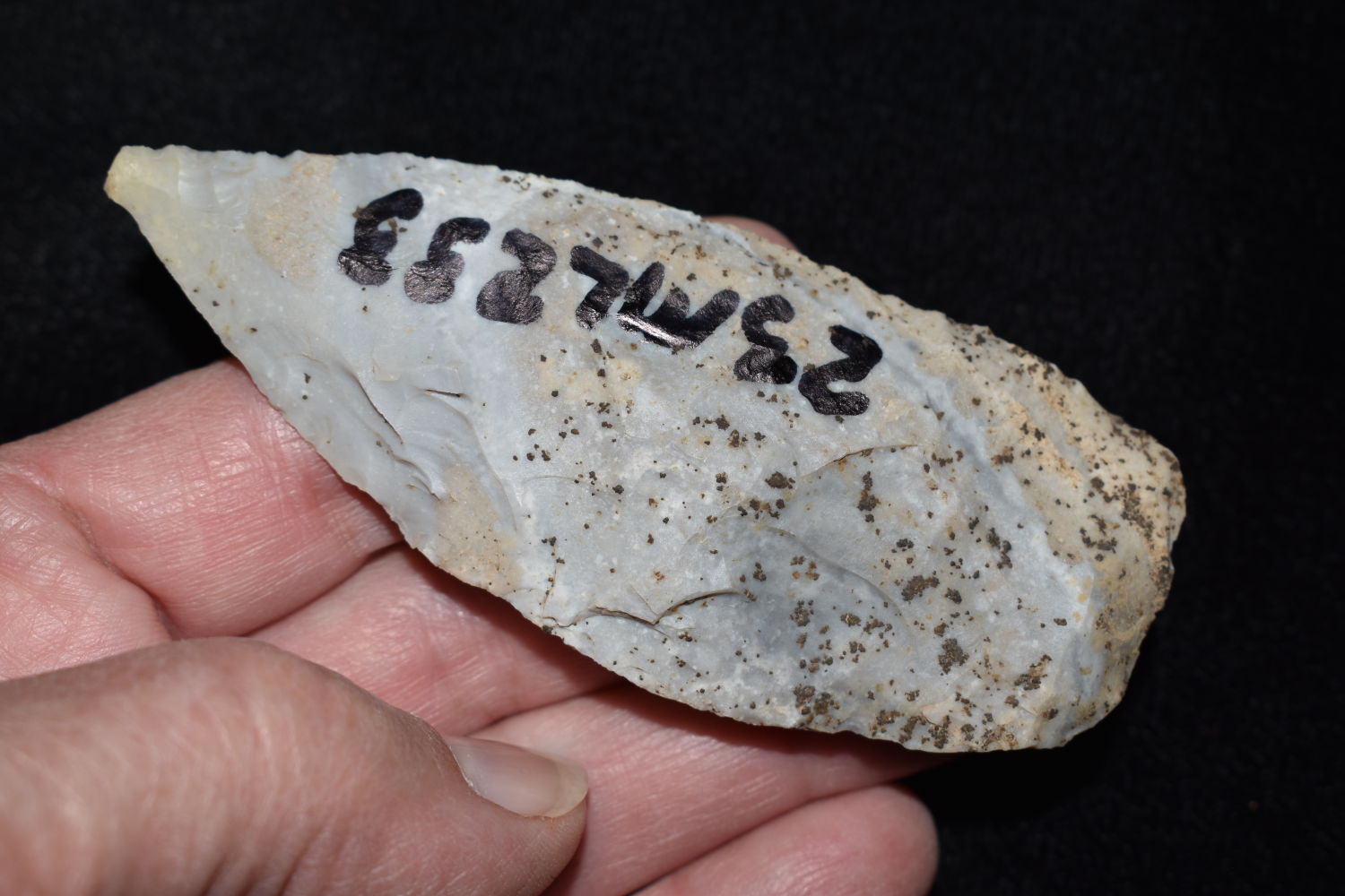 3 3/4″ Archaic Blade found in Miller County Missouri on the Miller Site (23ML233) by Alan D. Miller. Authentic Native American Arrowhead