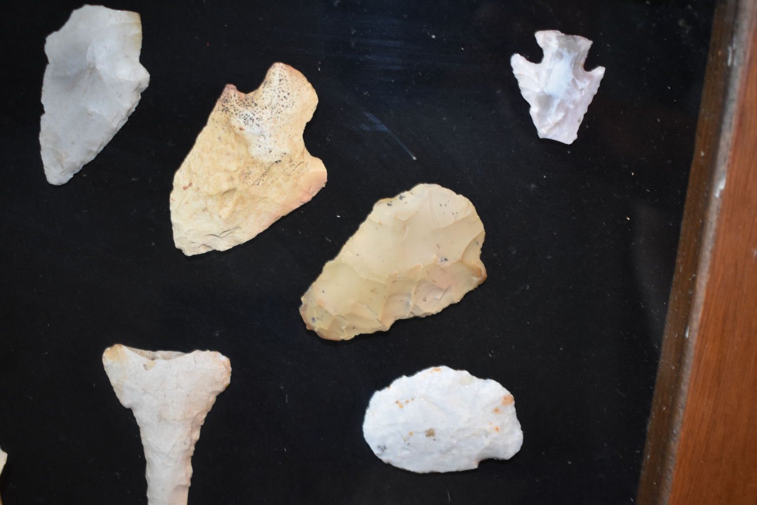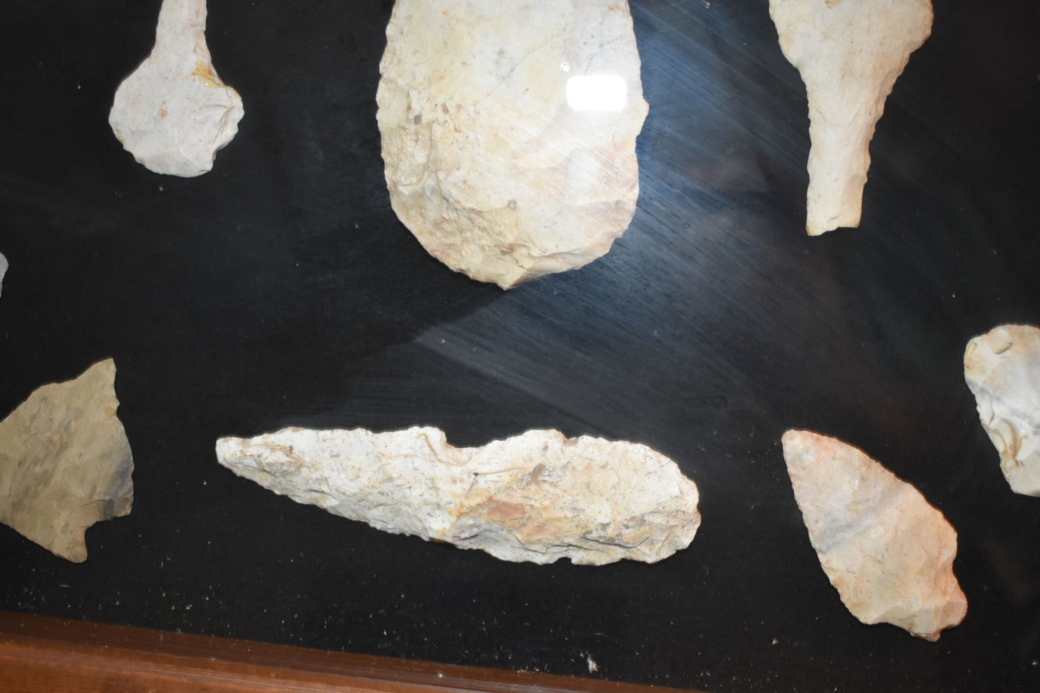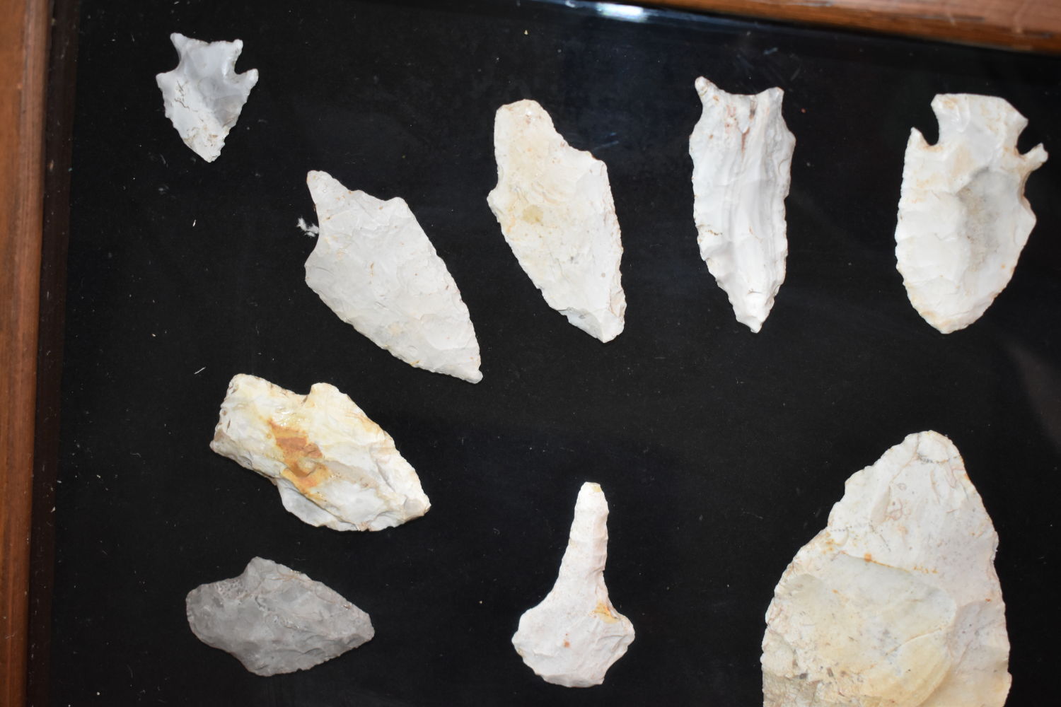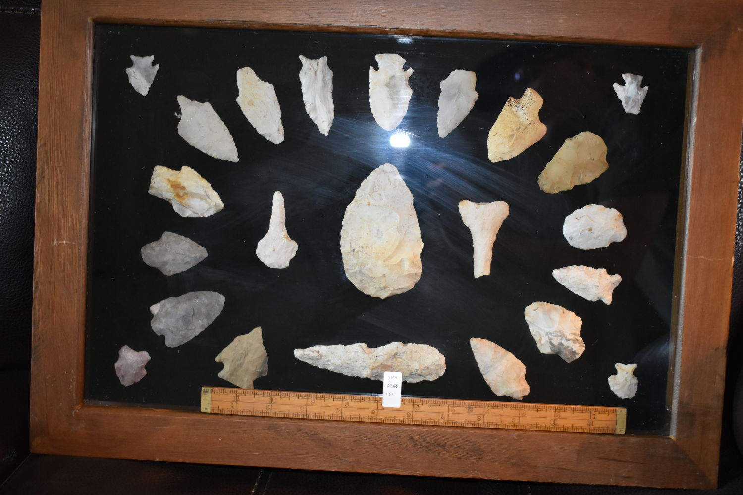 20″ X 14″ Frame containing 23 Arrowheads, found in Miller County Missouri on the Miller Site (23ML233) by Alan D. Miller. Authentic Native American Arrowhead