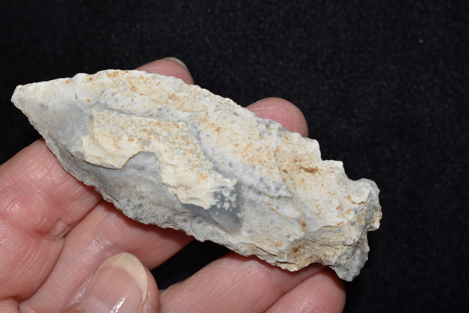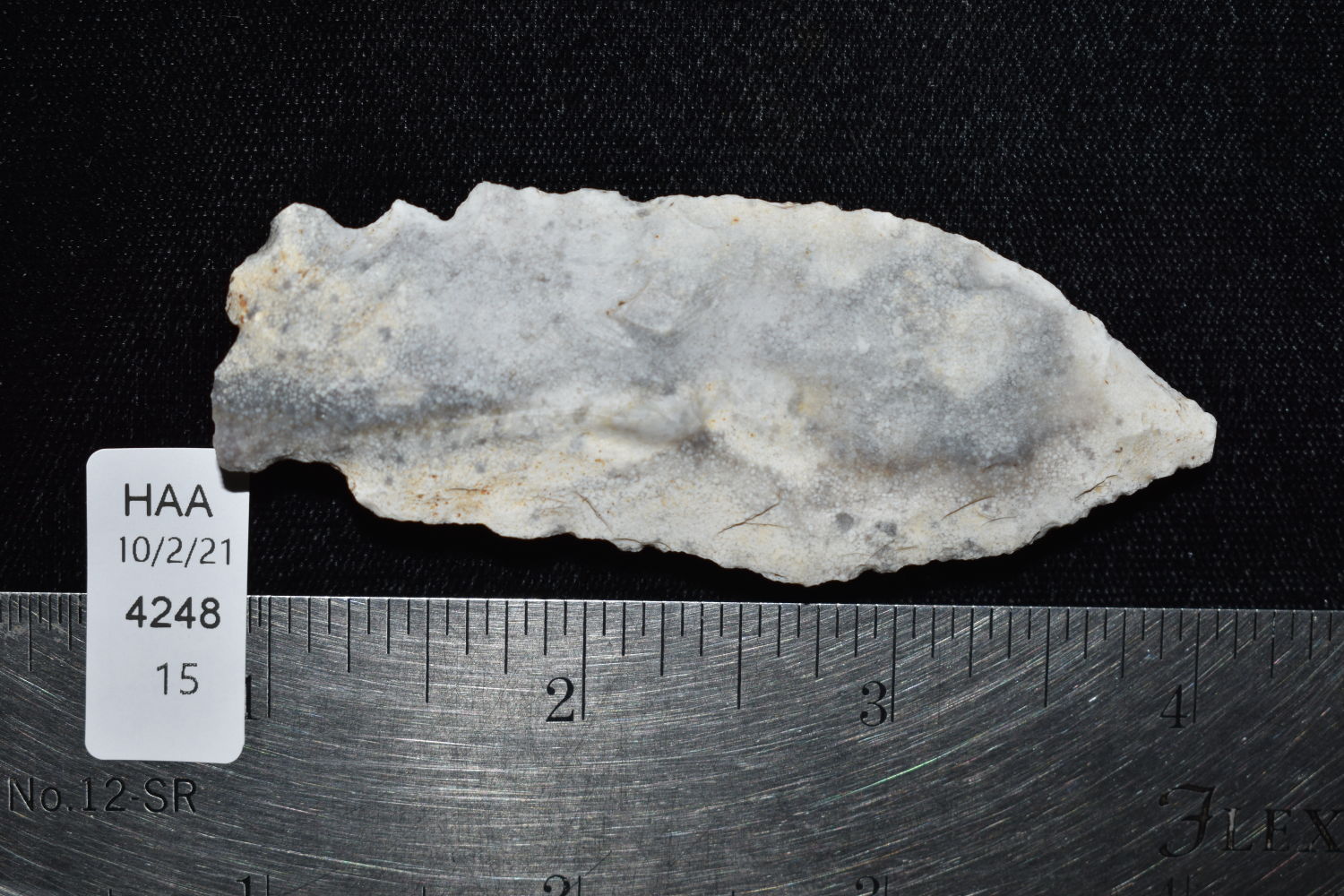3 1/8″ Etley, found in Miller County Missouri on the Miller Site (23ML233) by Alan D. Miller. Authentic Native American Arrowhead