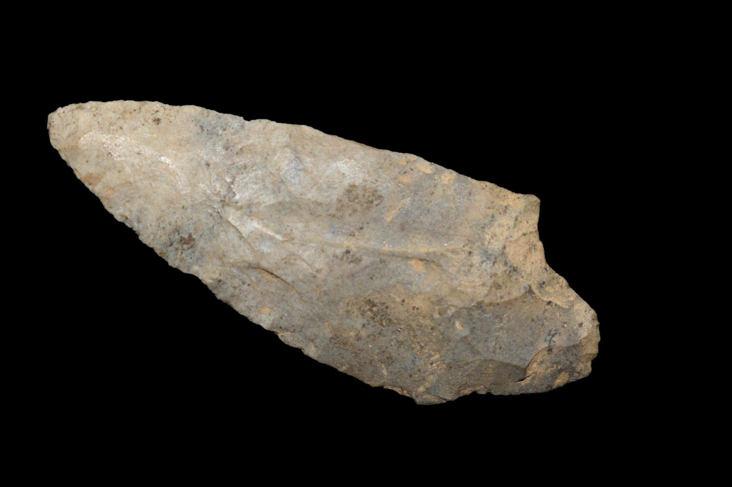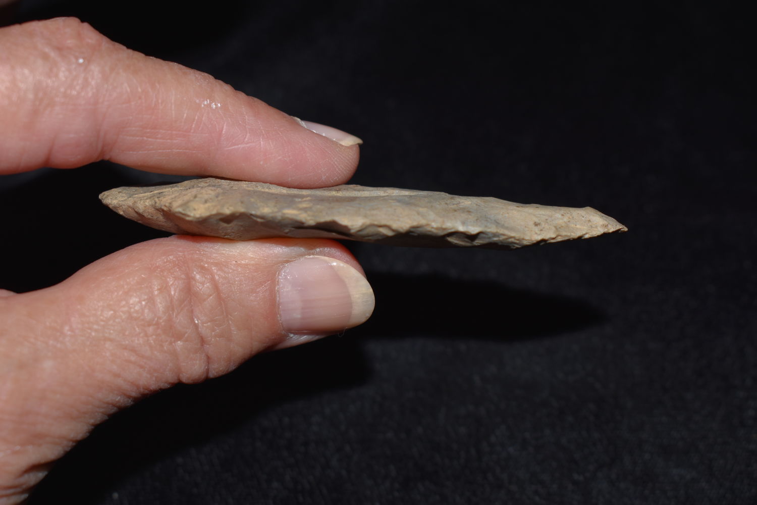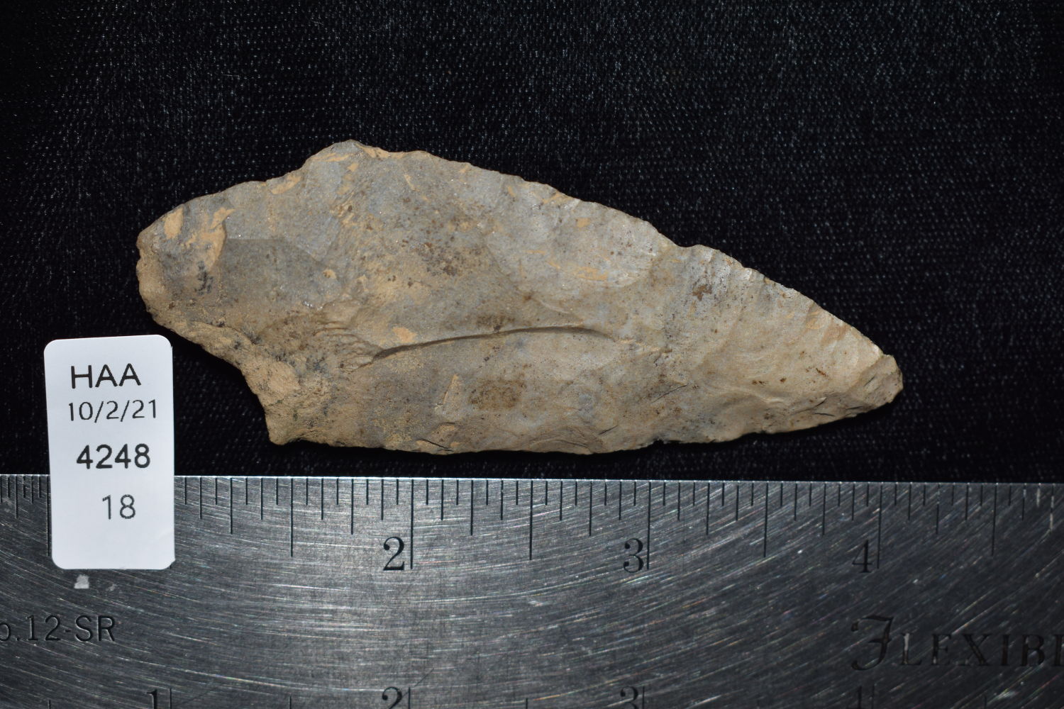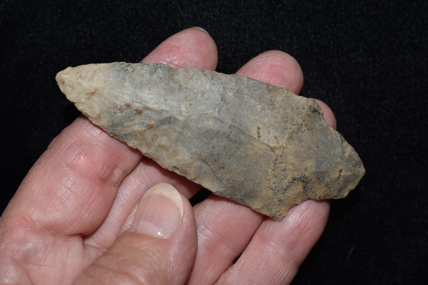 3 1/4″ Adena, found in Miller County Missouri on the Miller Site (23ML233) by Alan D. Miller. Authentic Native American Arrowhead
