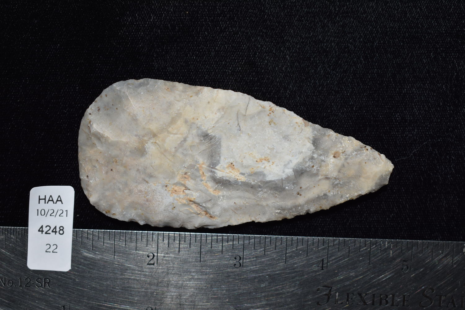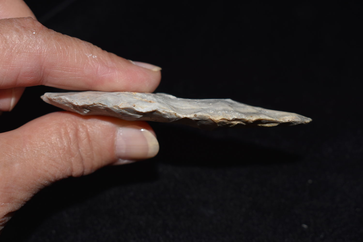3 1/2″ Cobbs Blade made of Mozarkite, found in Miller County Missouri on the Miller Site (23ML233) by Alan D. Miller. Authentic Native American Arrowhead