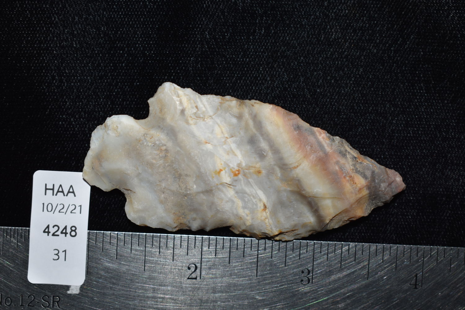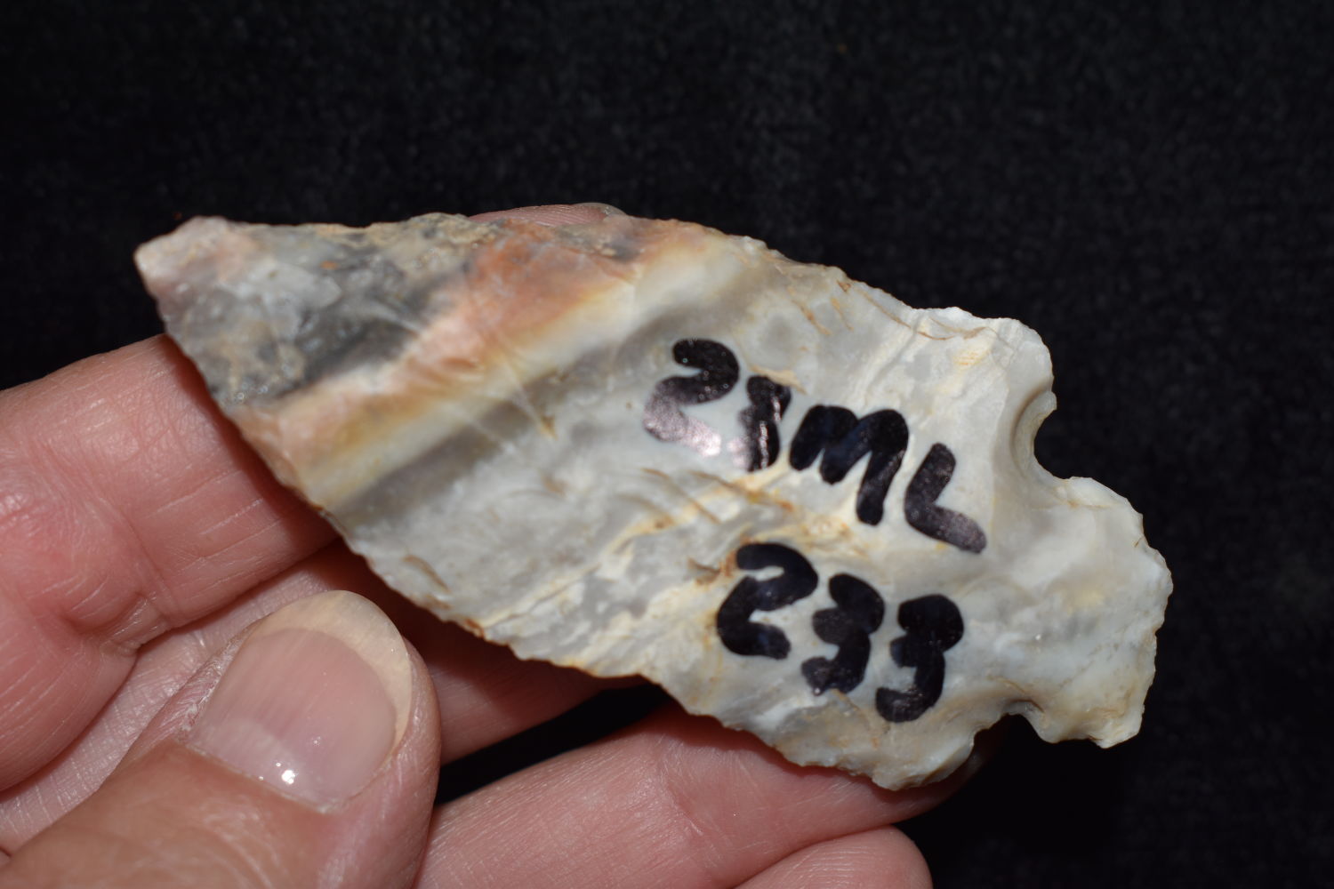 2 7/8″ Etley, found in Miller County Missouri on the Miller Site (23ML233) by Alan D. Miller. Authentic Native American Arrowhead