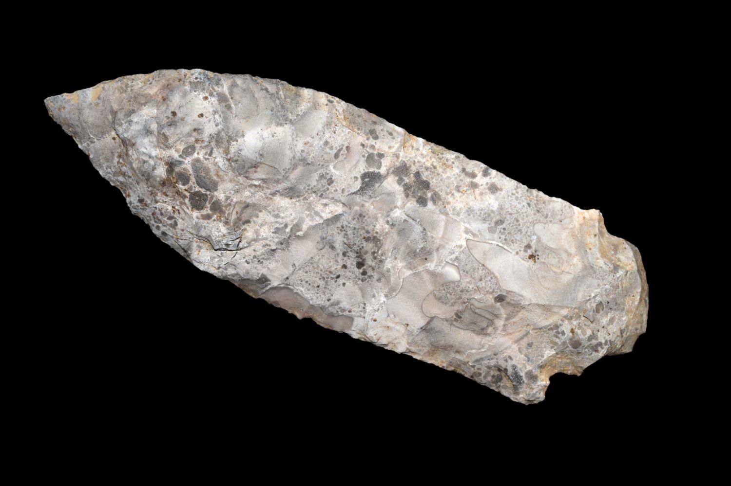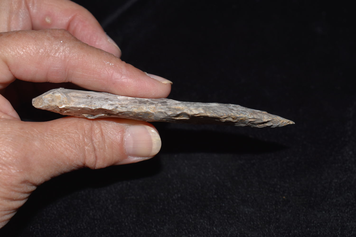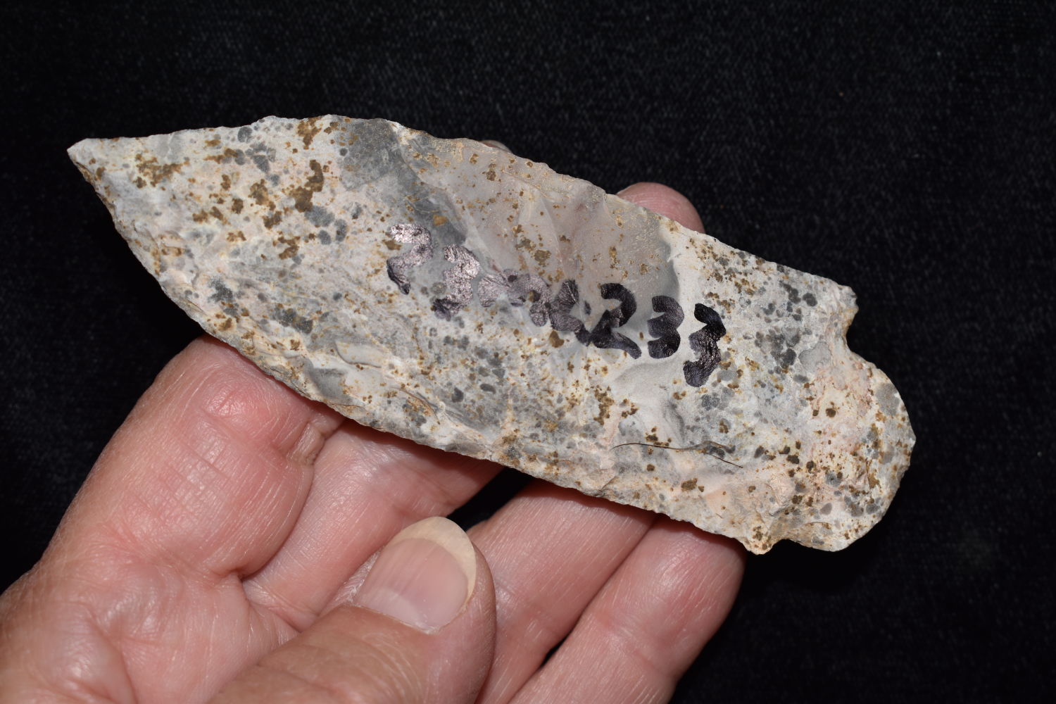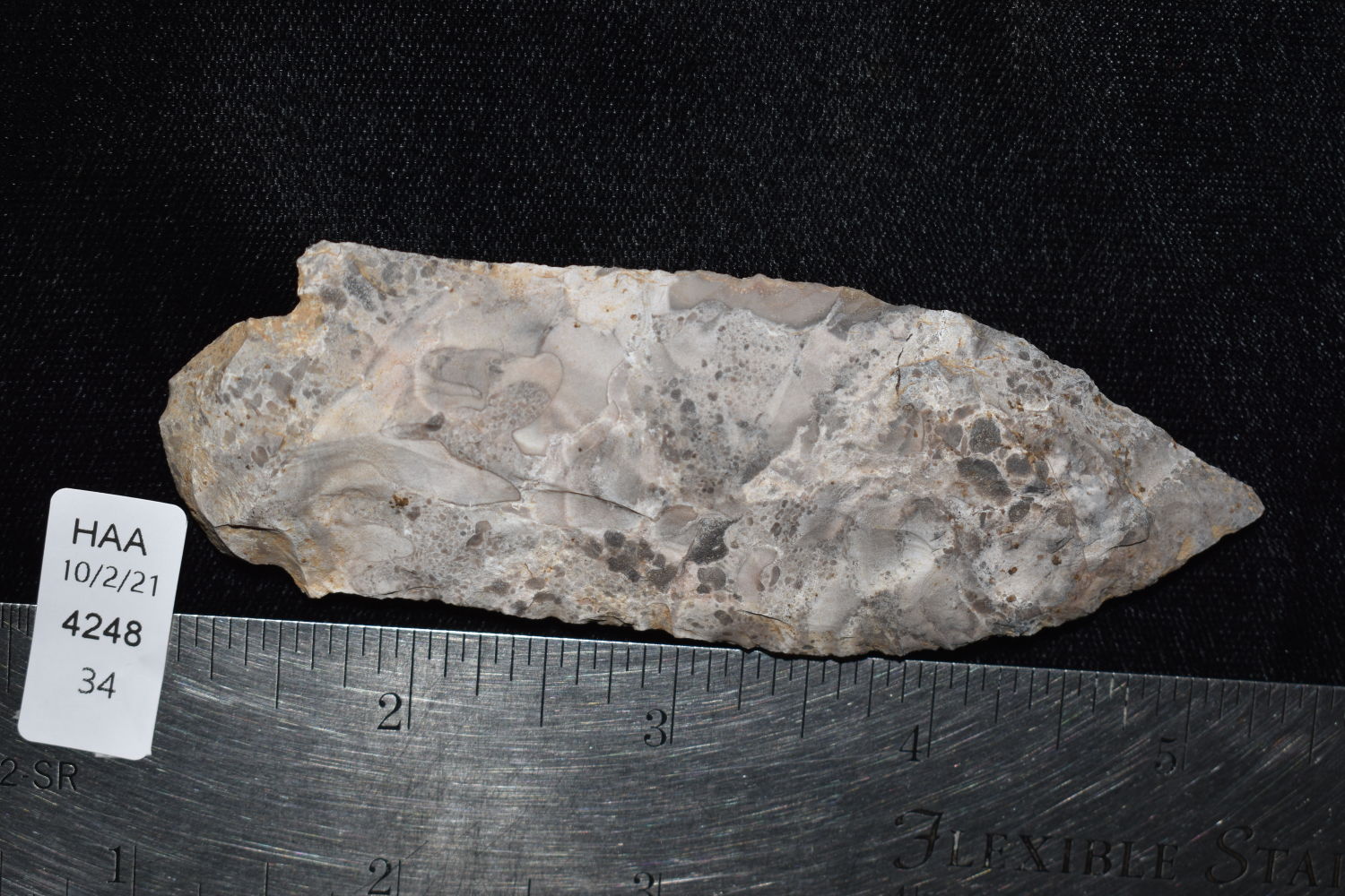 4 1/3″ Mozarkite Etley, found in Miller County Missouri on the Miller Site (23ML233) by Alan D. Miller. Authentic Native American Arrowhead