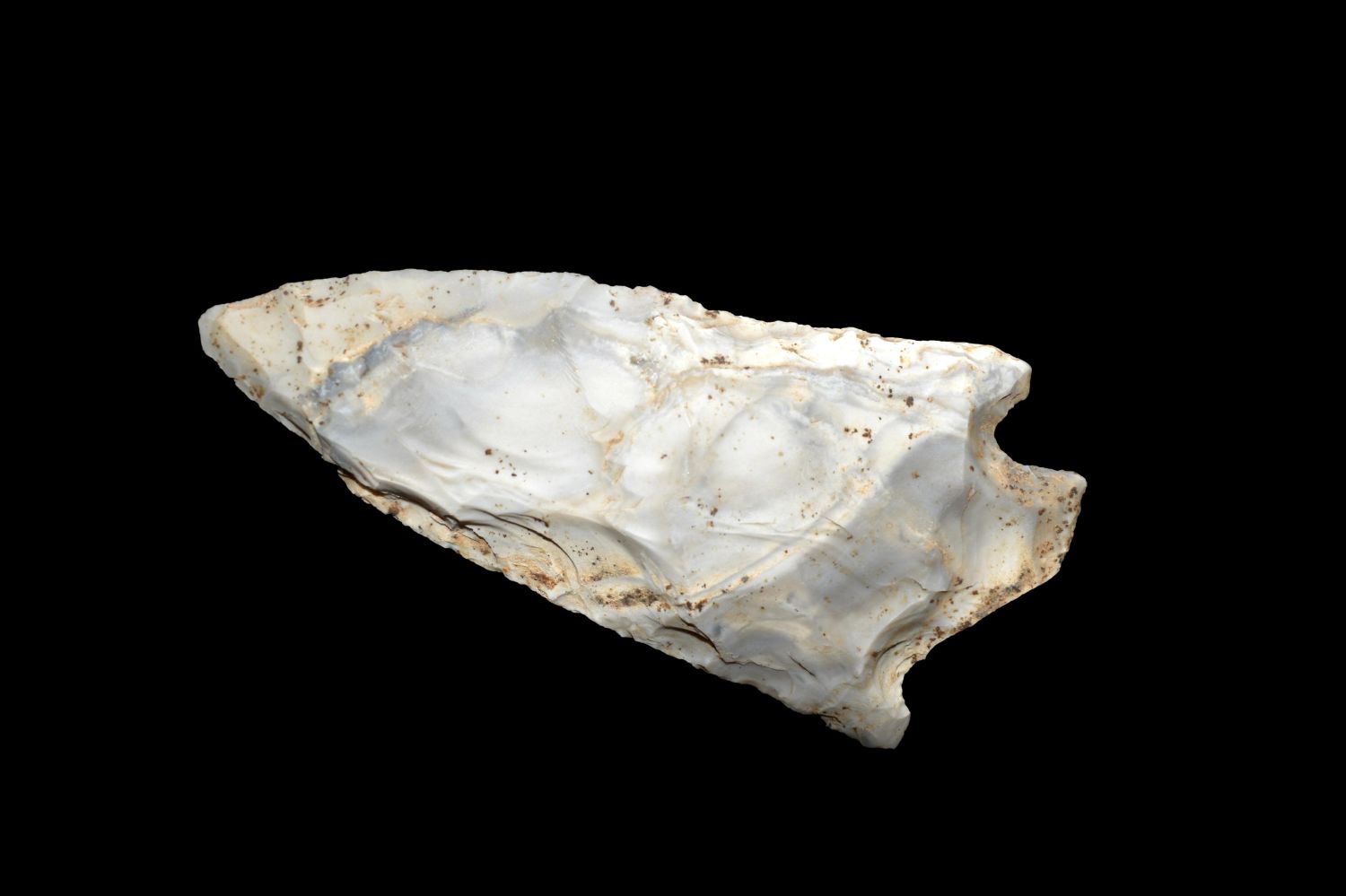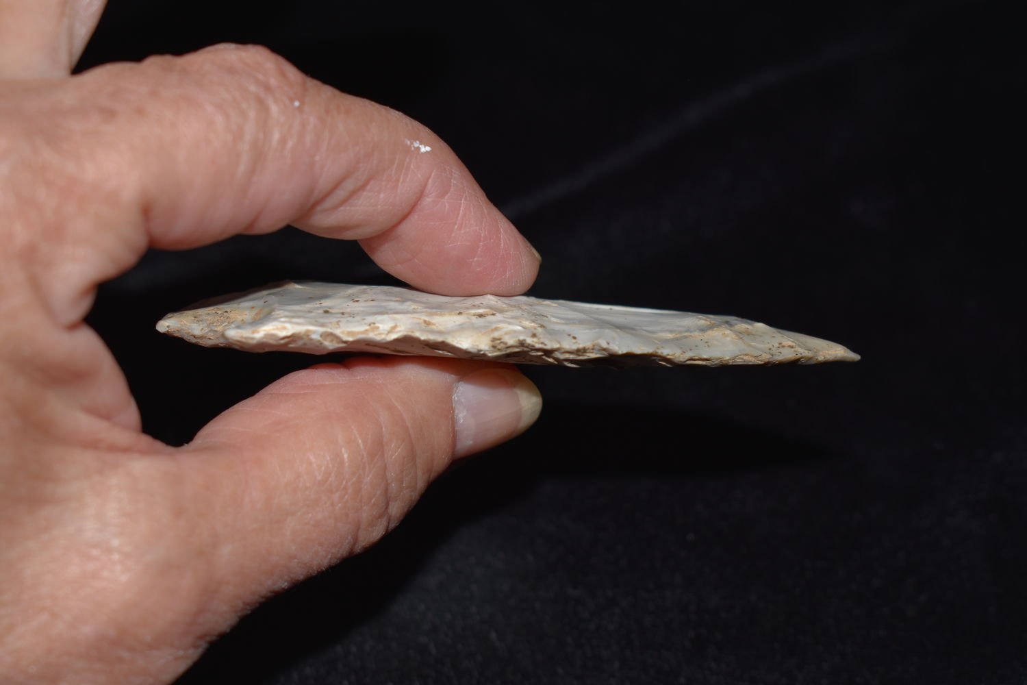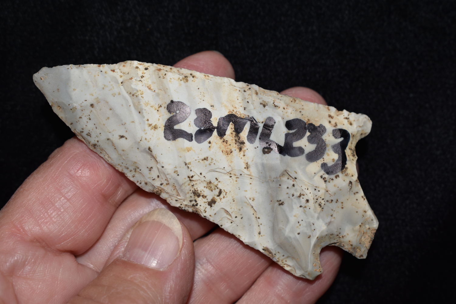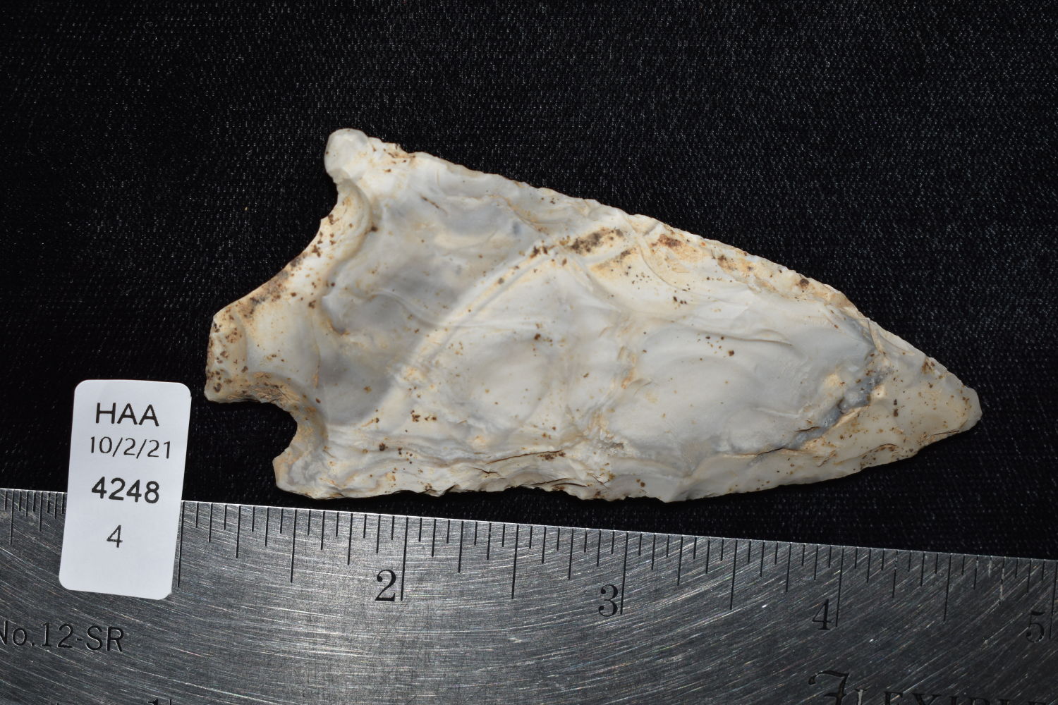 2 1/2″ Mozarkite Etley, found in Miller County Missouri on the Miller Site (23ML233) by Alan D. Miller. Authentic Native American Arrowhead