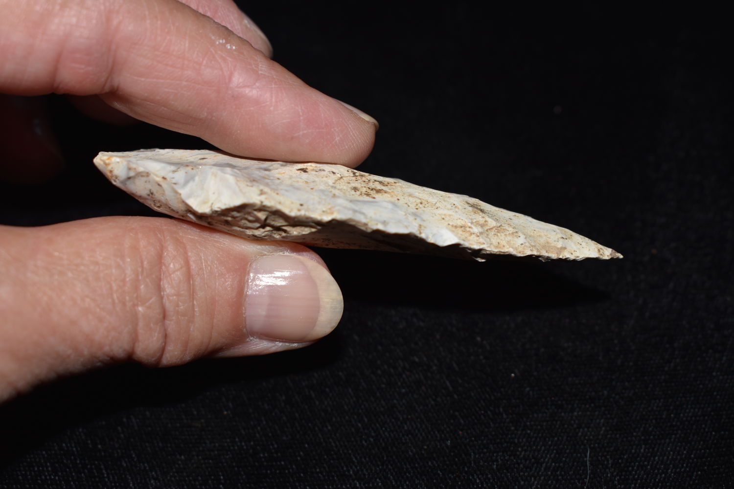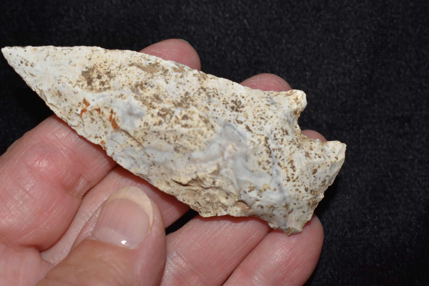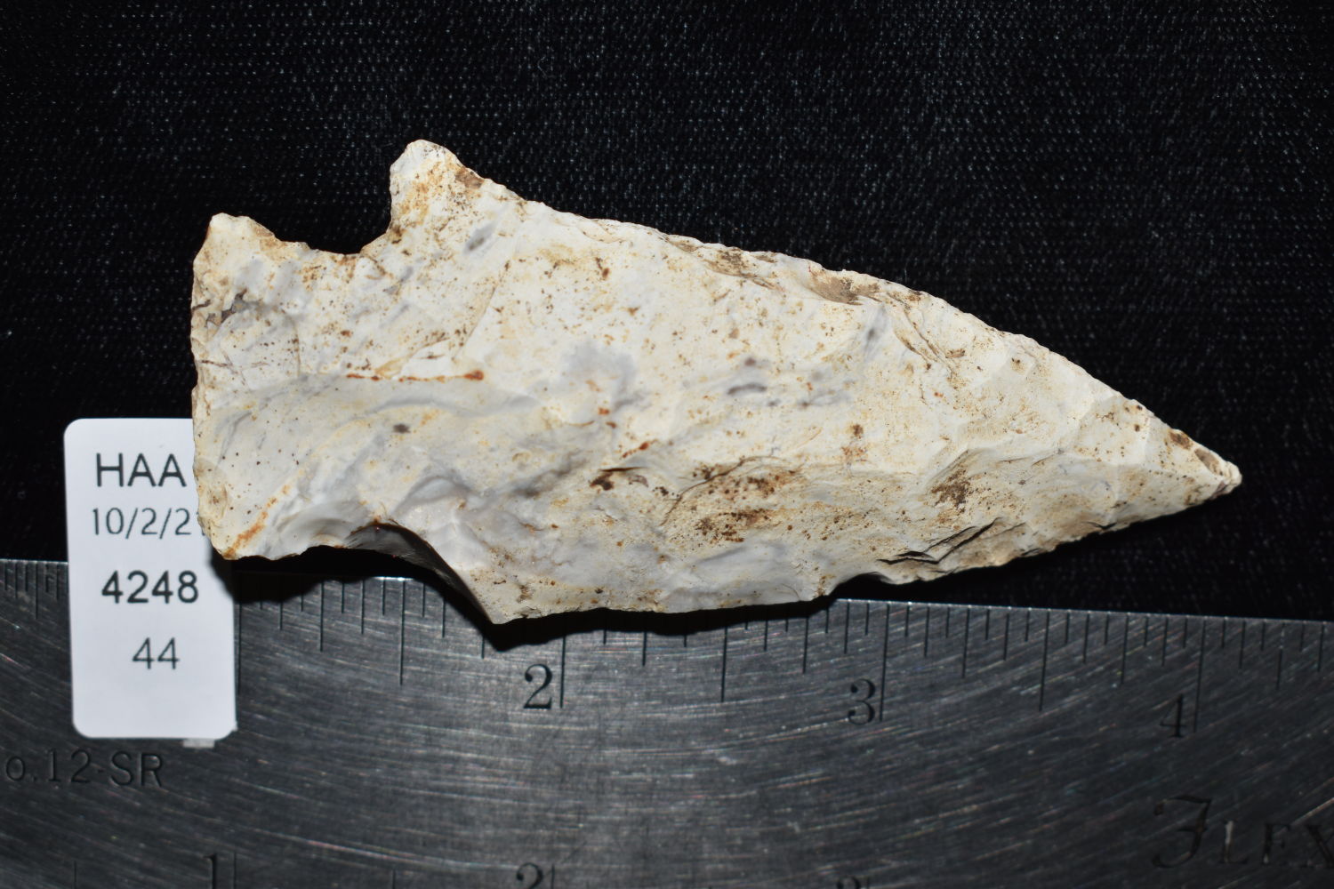 3 1/4″ Etley, found in Miller County Missouri on the Miller Site (23ML233) by Alan D. Miller. Authentic Native American Arrowhead