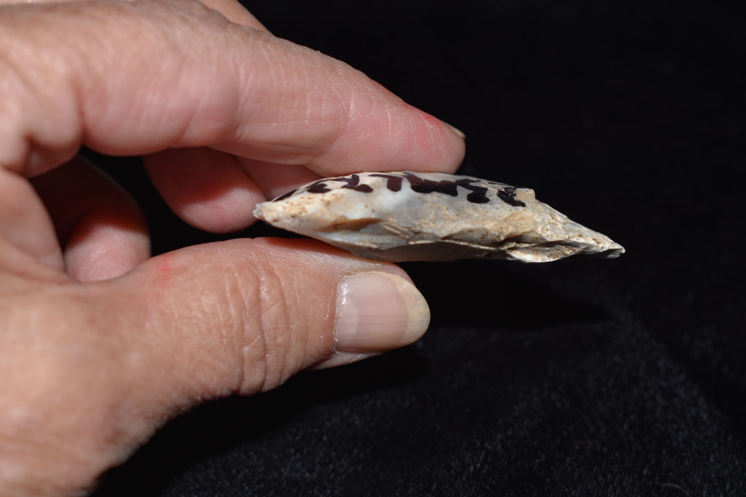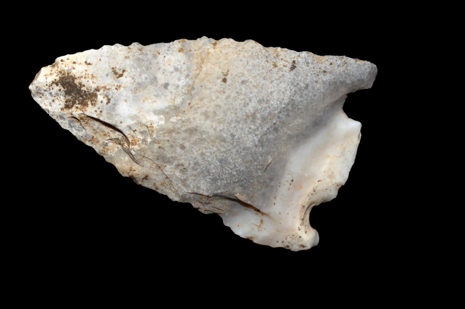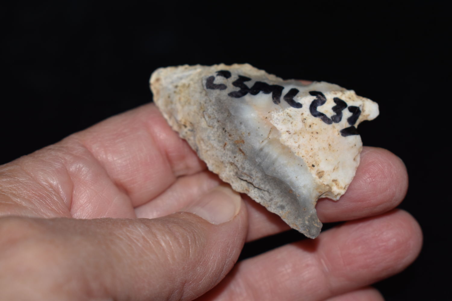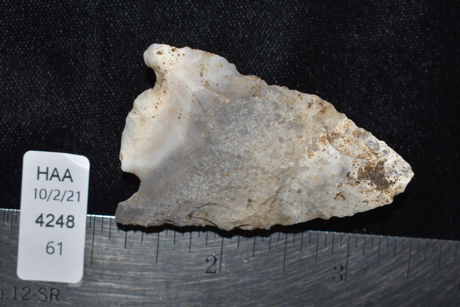 2 1/8″ Mozarkite Smith, found in Miller County Missouri on the Miller Site (23ML233) by Alan D. Miller. Authentic Native American Arrowhead