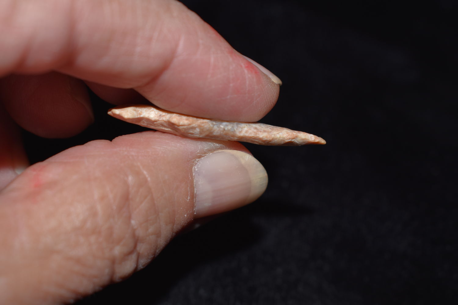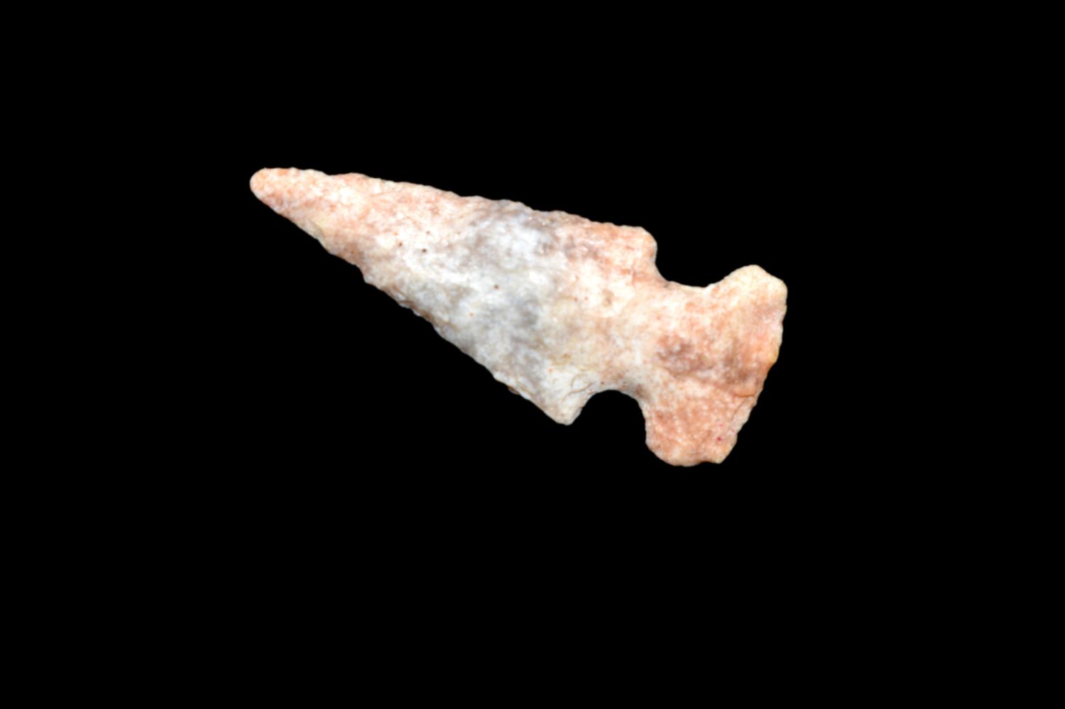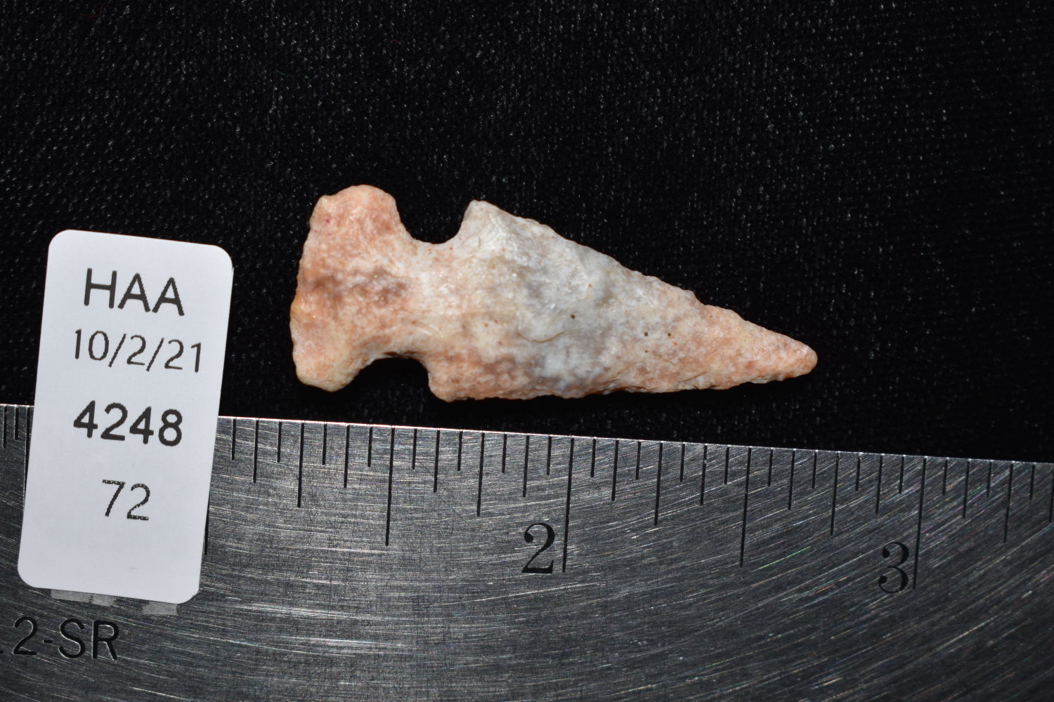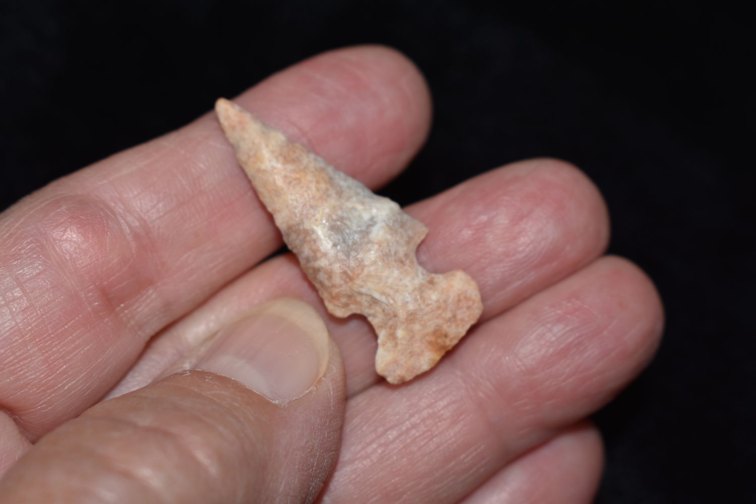 1 1/2″ Side Notched Bird Point, found in Miller County Missouri on the Miller Site (23ML233) by Alan D. Miller. Authentic Native American Arrowhead