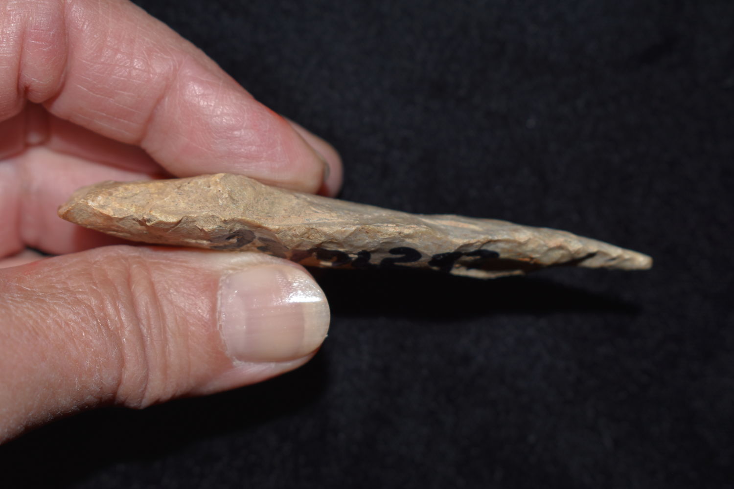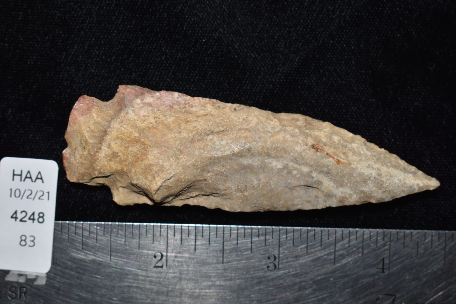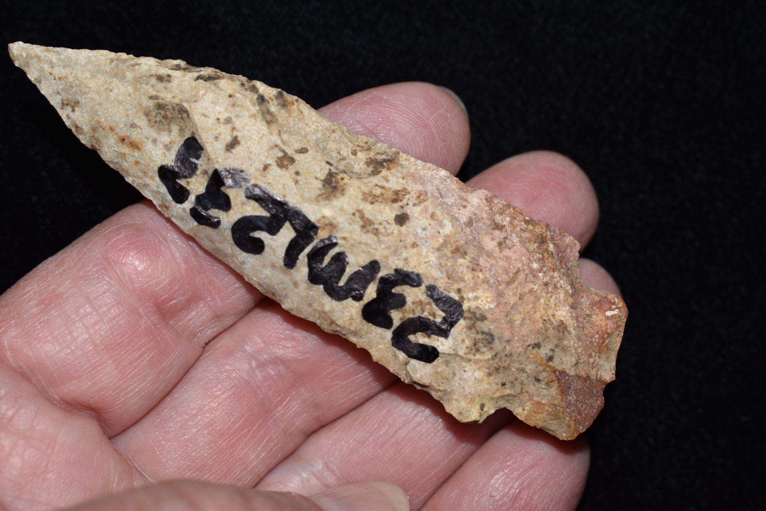 3 1/4″ Etley found in Miller County Missouri on the Miller Site (23ML233) by Alan D. Miller. Authentic Native American Arrowhead