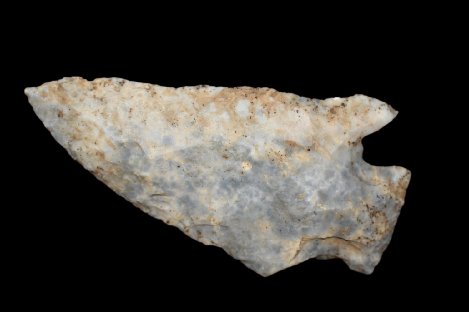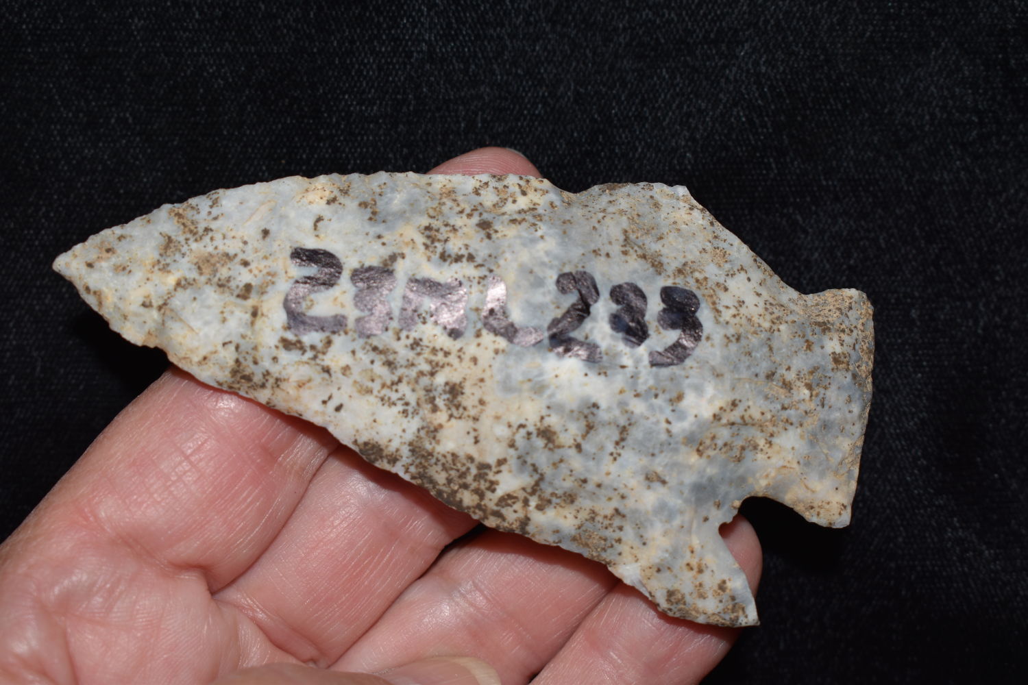 3 3/4″ Mozarkite Etley, found in Miller County Missouri on the Miller Site (23ML233) by Alan D. Miller. Authentic Native American Arrowhead