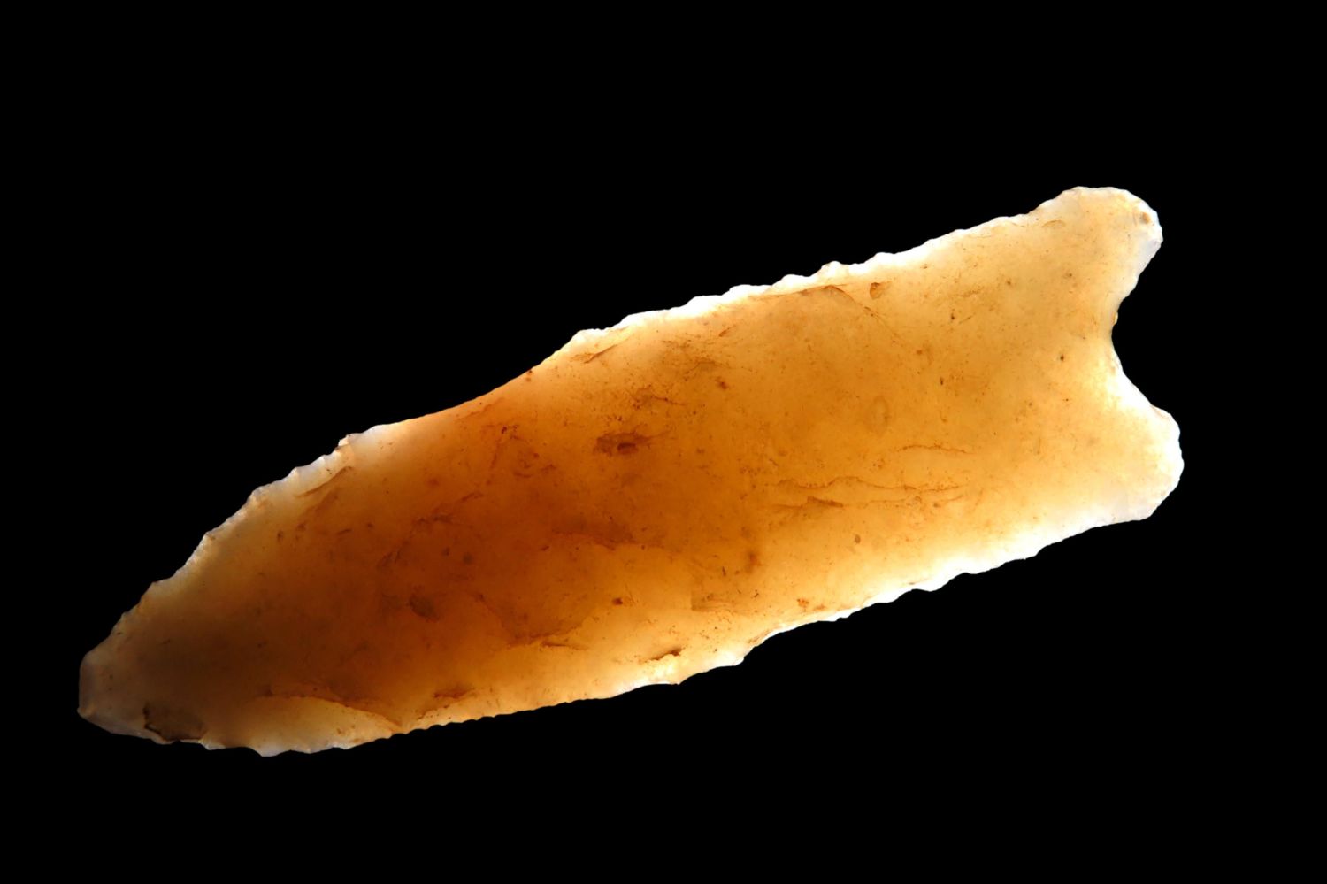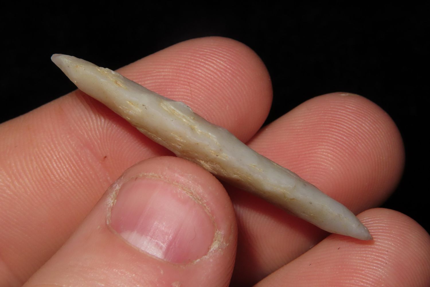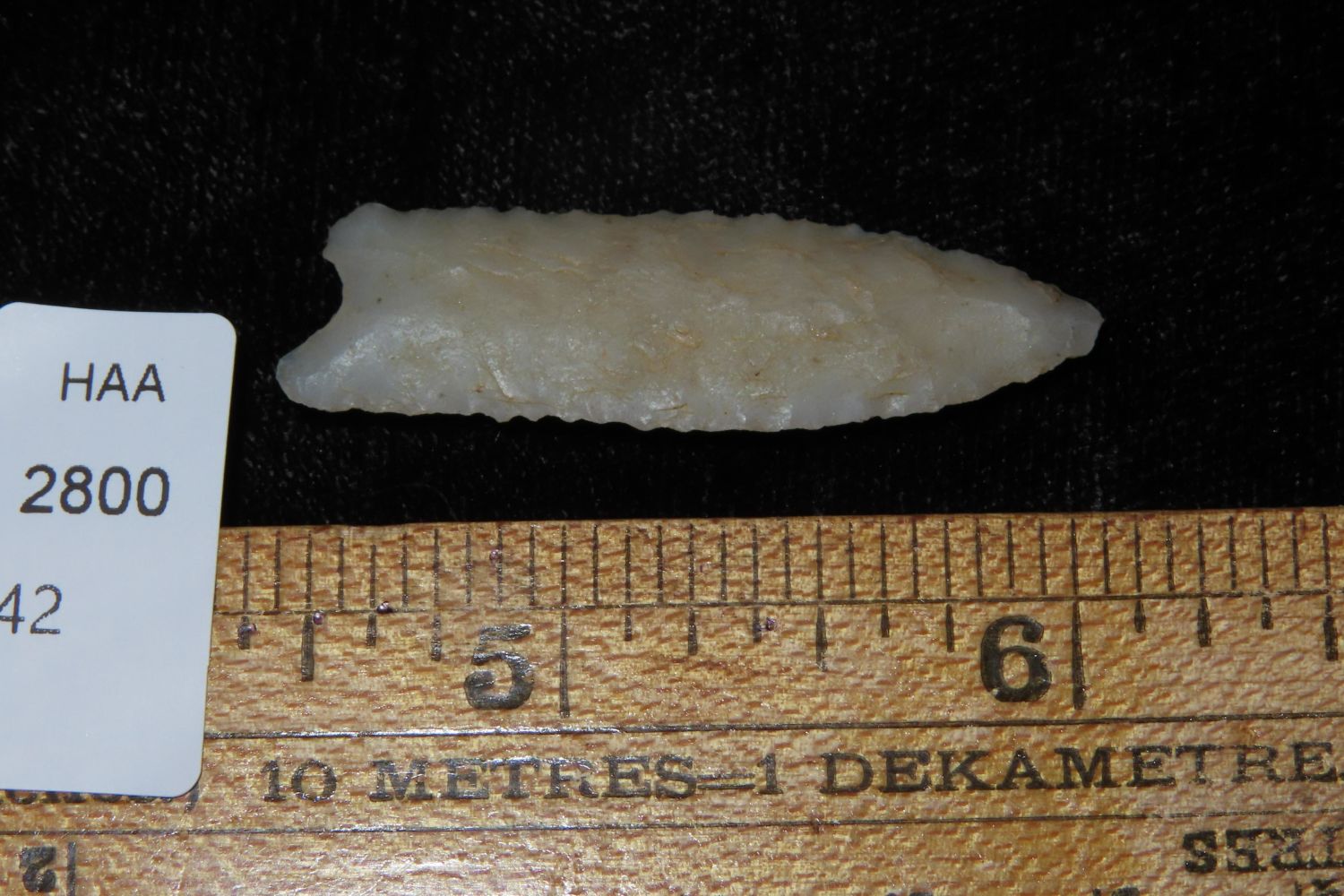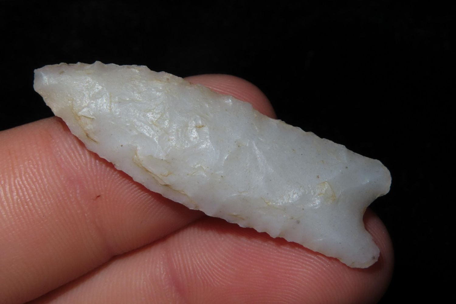 1 5/8" Translucent Hannah found in Crook County Wyoming in the Inyan Kara Creek area, Collection of Ernie Banks, Rancher. Authentic Native American Arrowhead Artifact