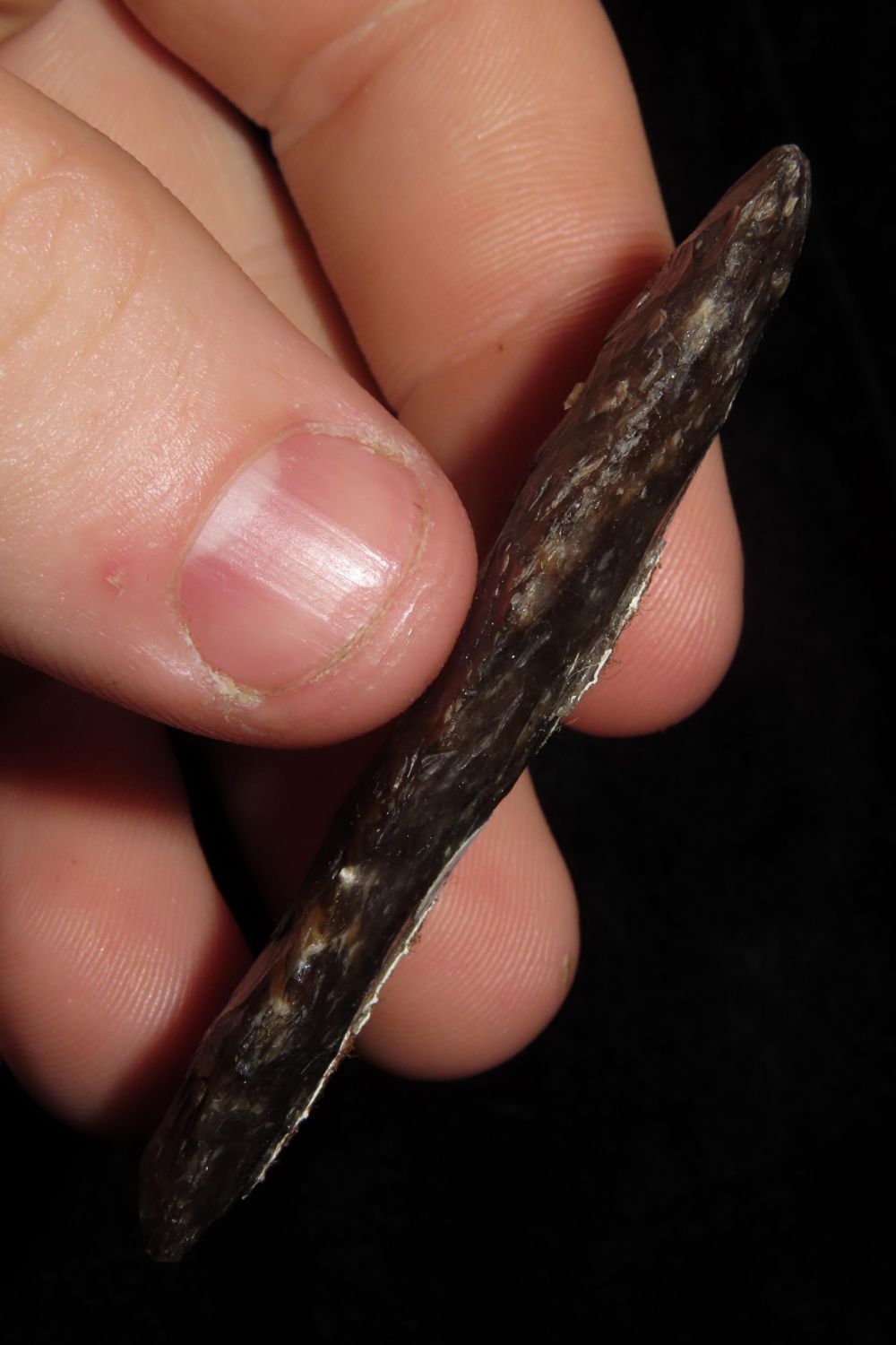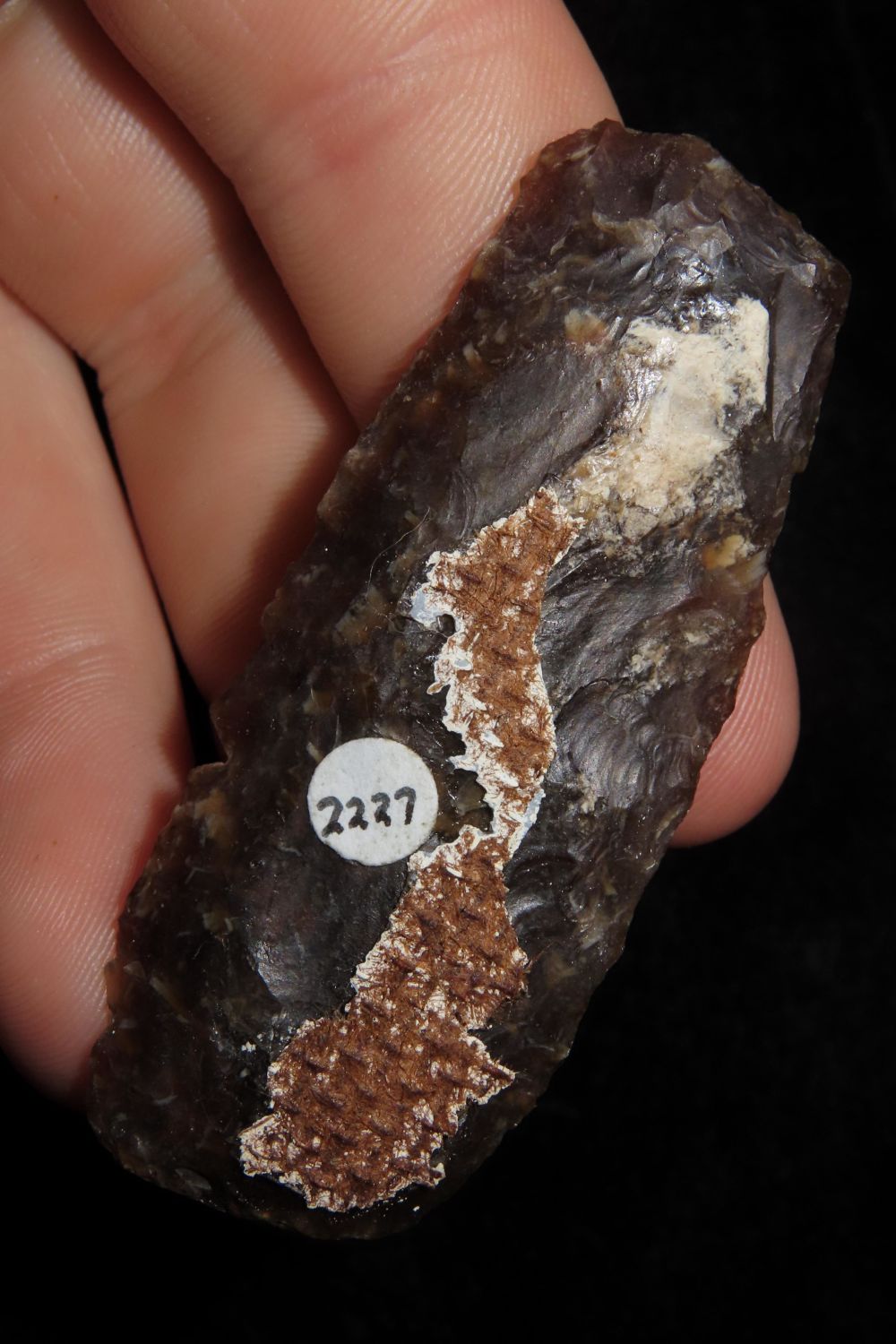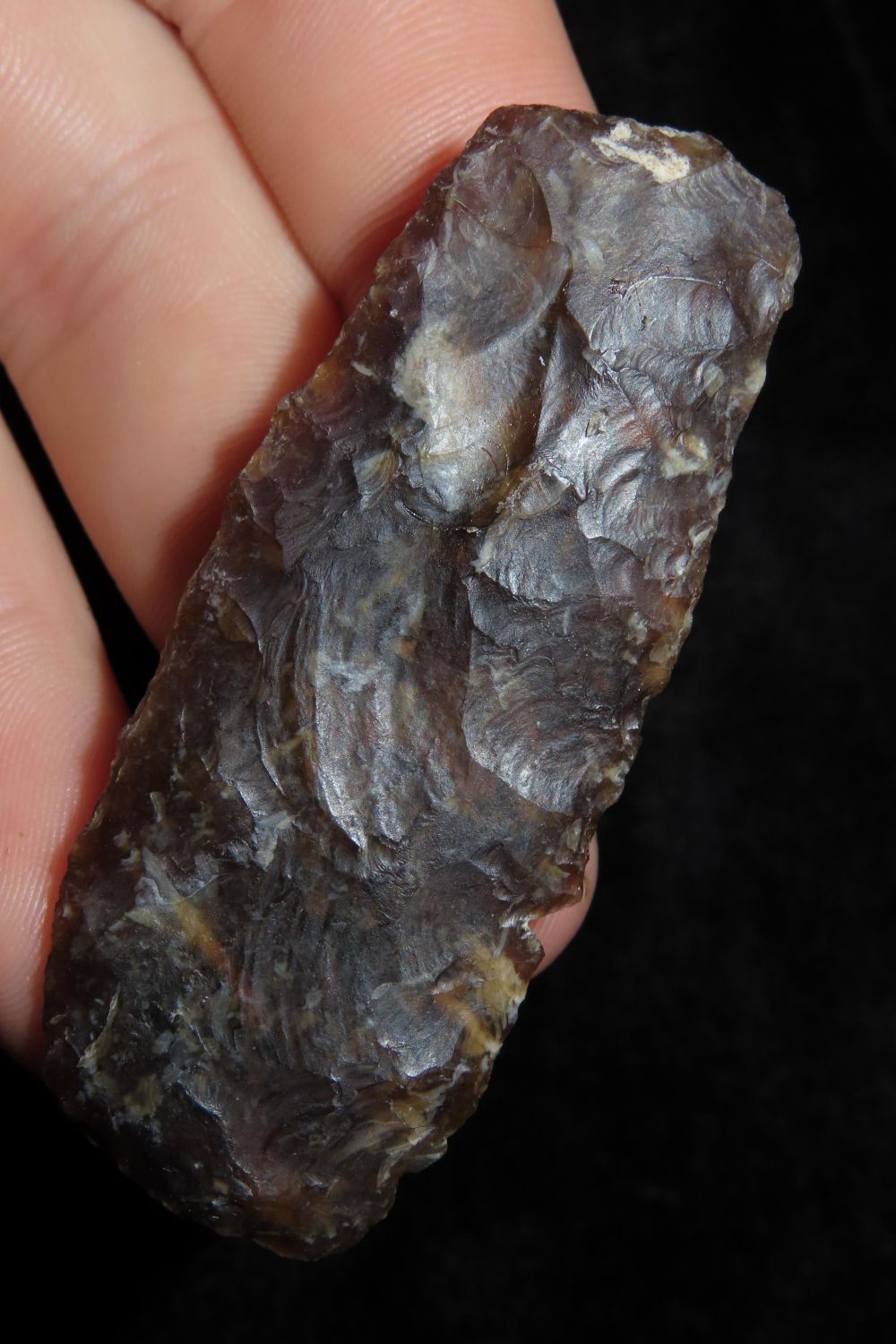 2 3/8" Knife River Flint Side Knife found in Morton County North Dakota. Collected by August and Pluma Spiss in the 1950’s – August was a school adminstrator in Mandan.