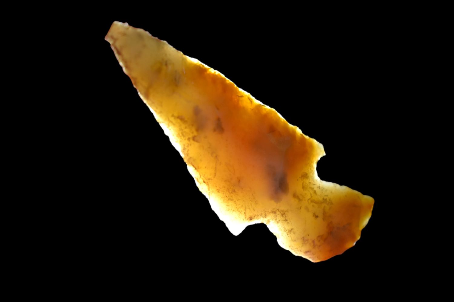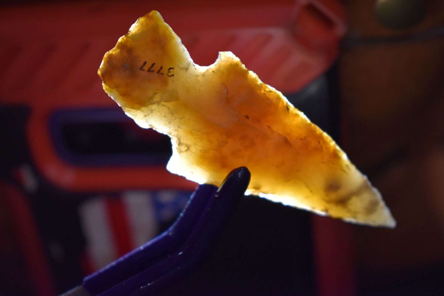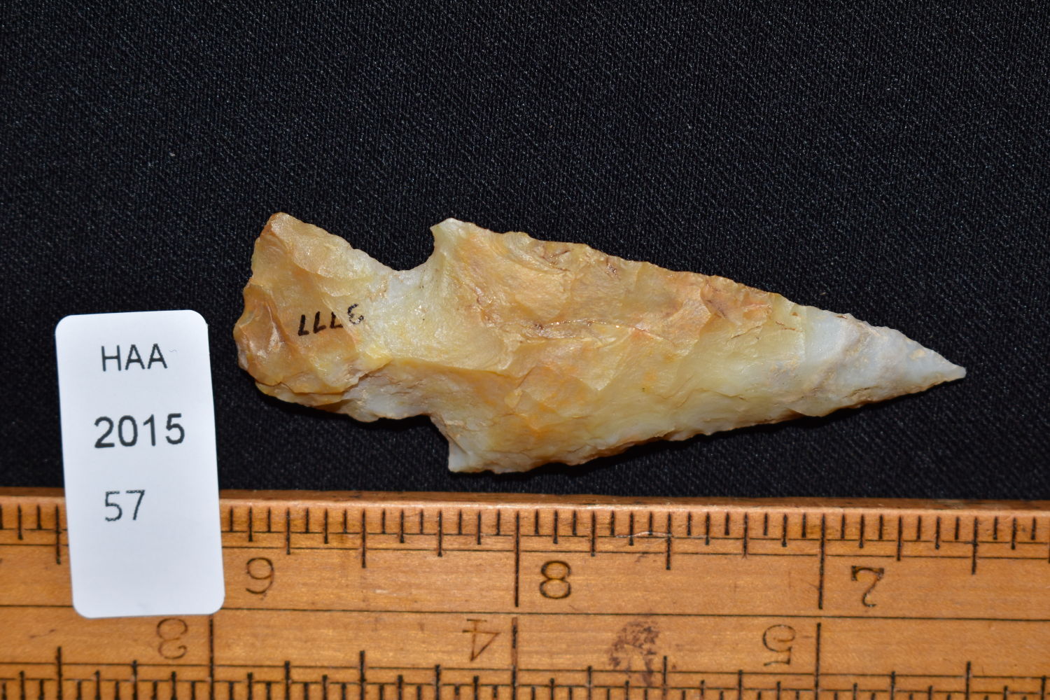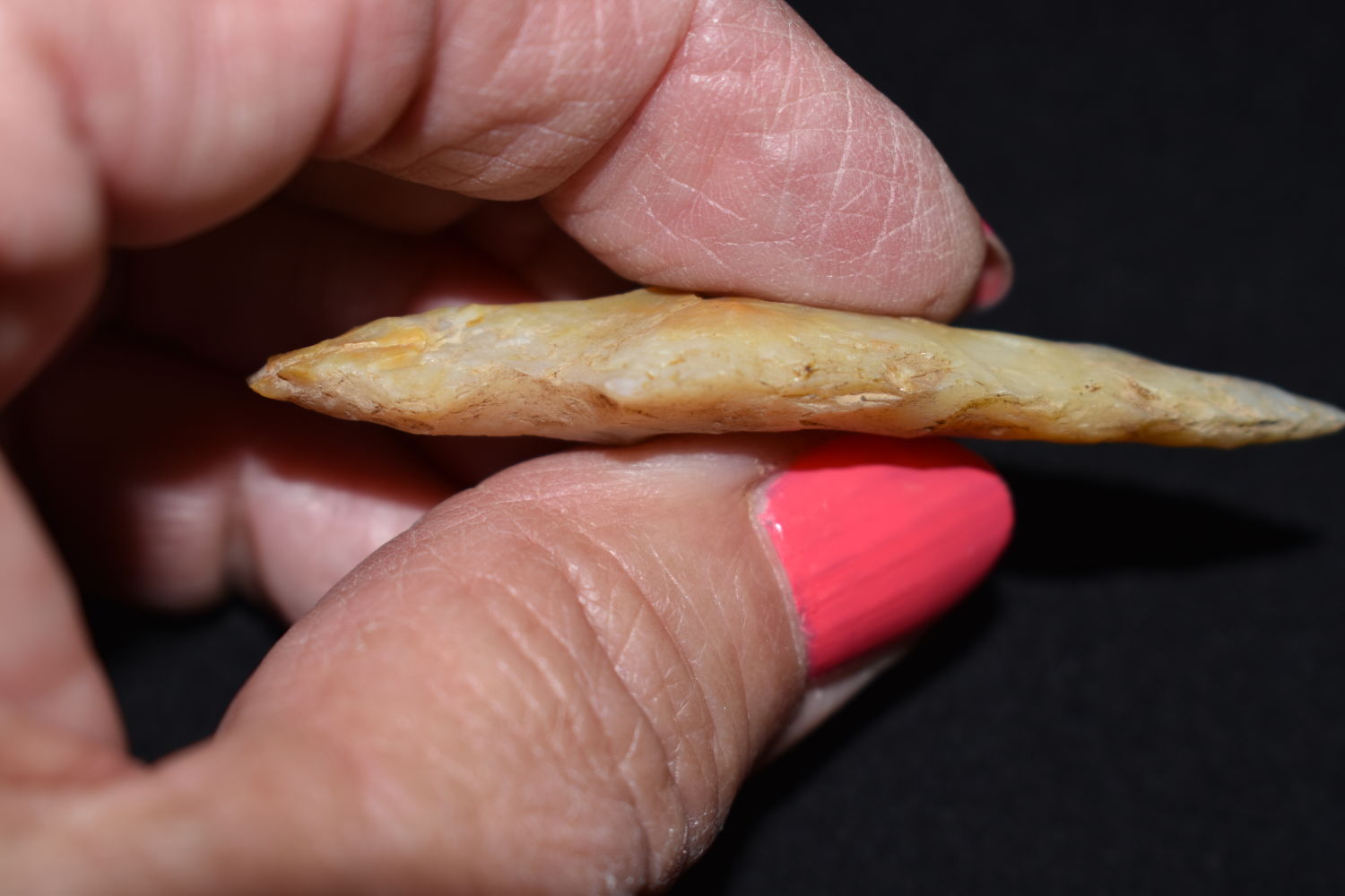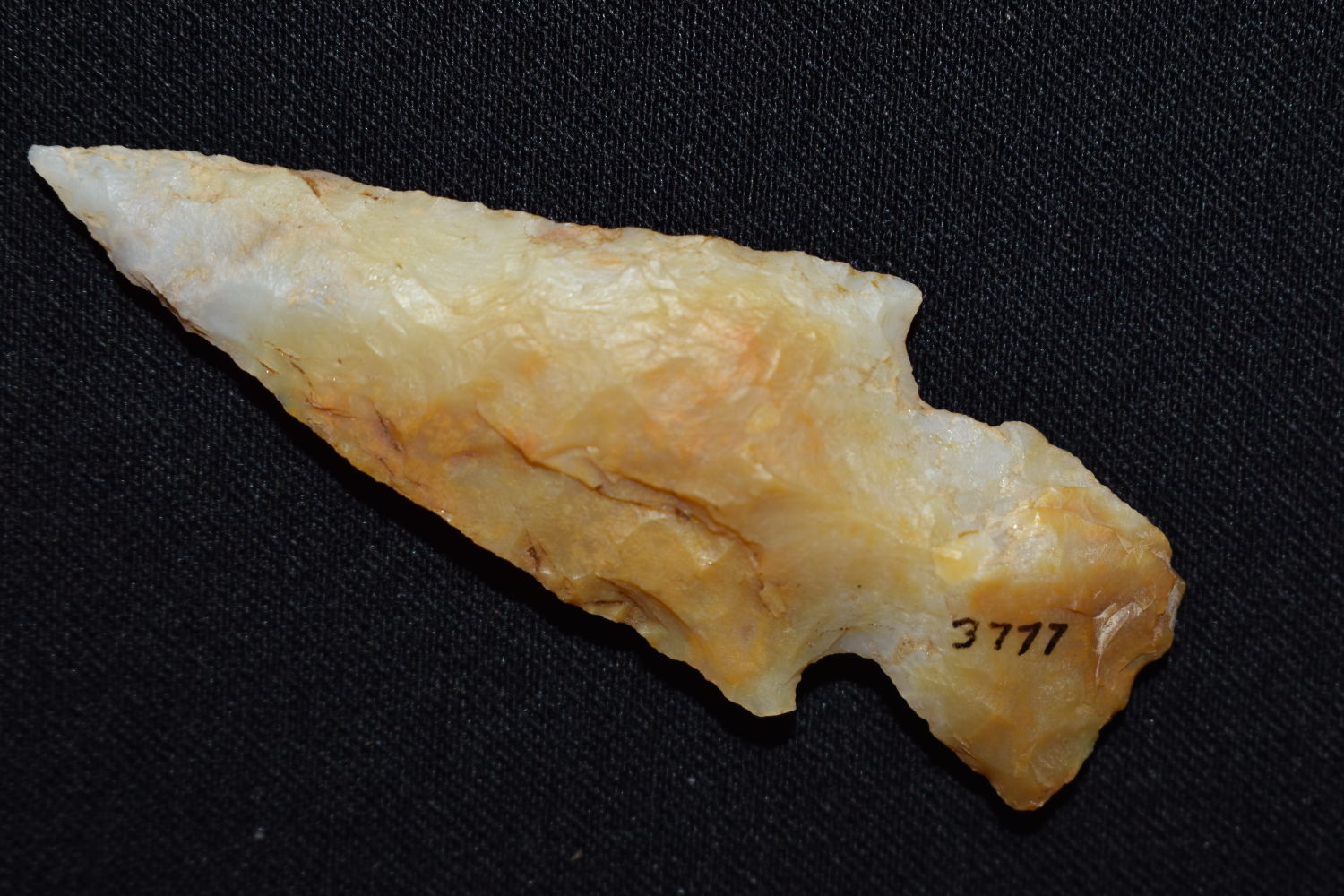 2 3/8″ Translucent Kaolin Stemmed Point found in Jackson County Illinois, Ex. Bruce Cox Collection of Hamilton, Illinois. Authentic Native American Arrowhead