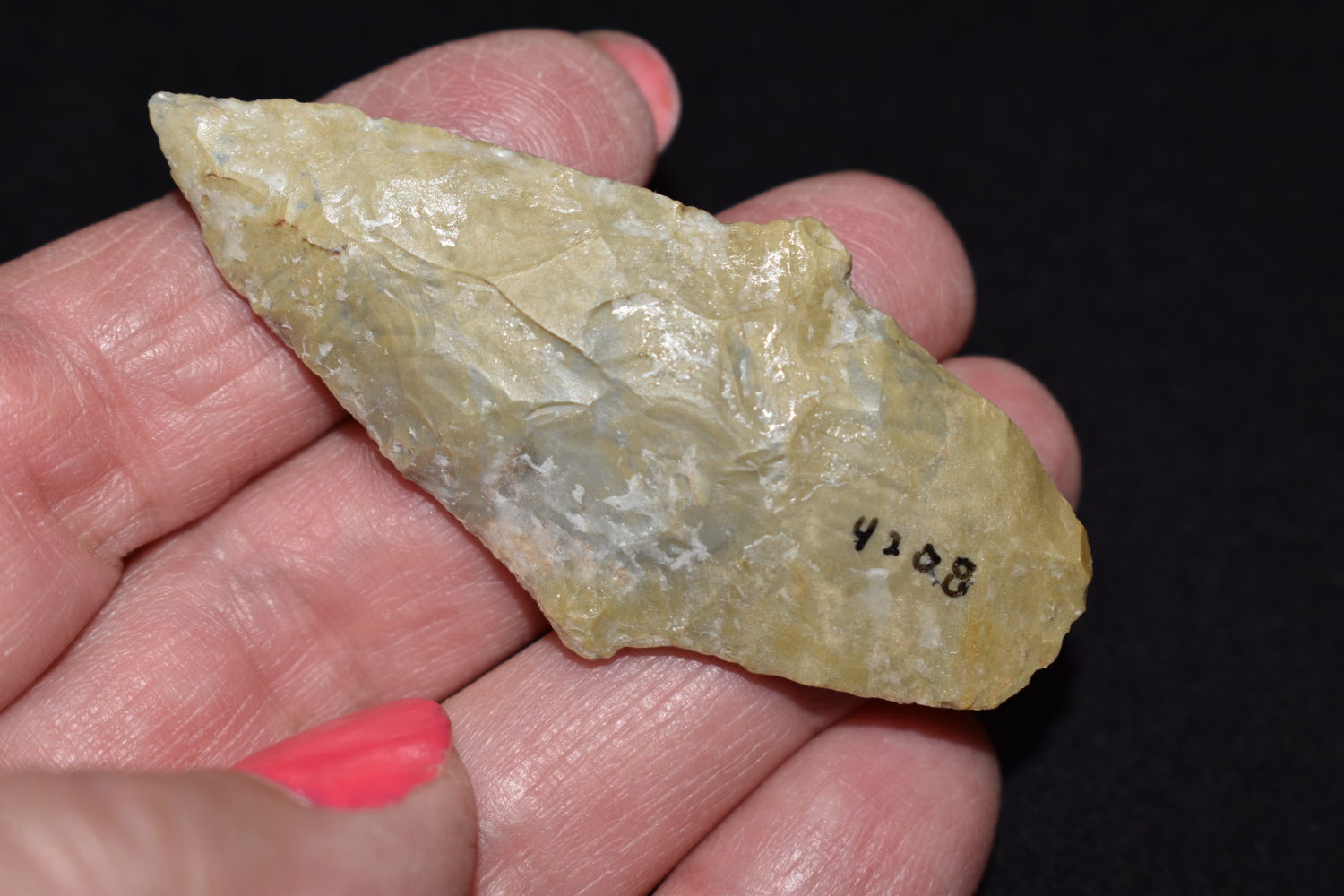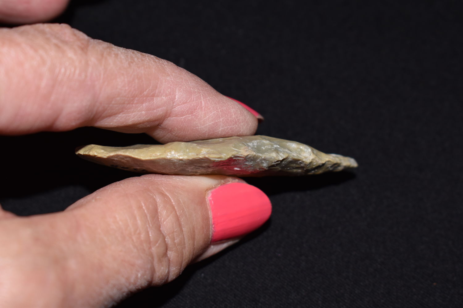 2 1/2″ Adena found in Hancock County Illinois, Ex. Bruce Cox Collection of Hamilton, Illinois. Authentic Native American Arrowhead