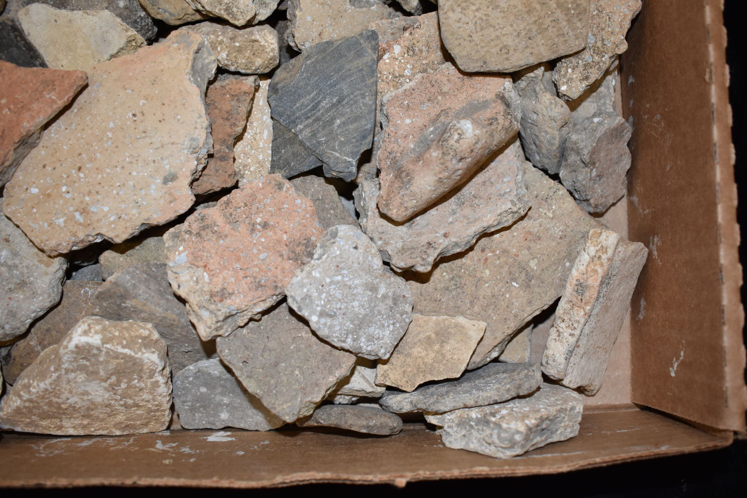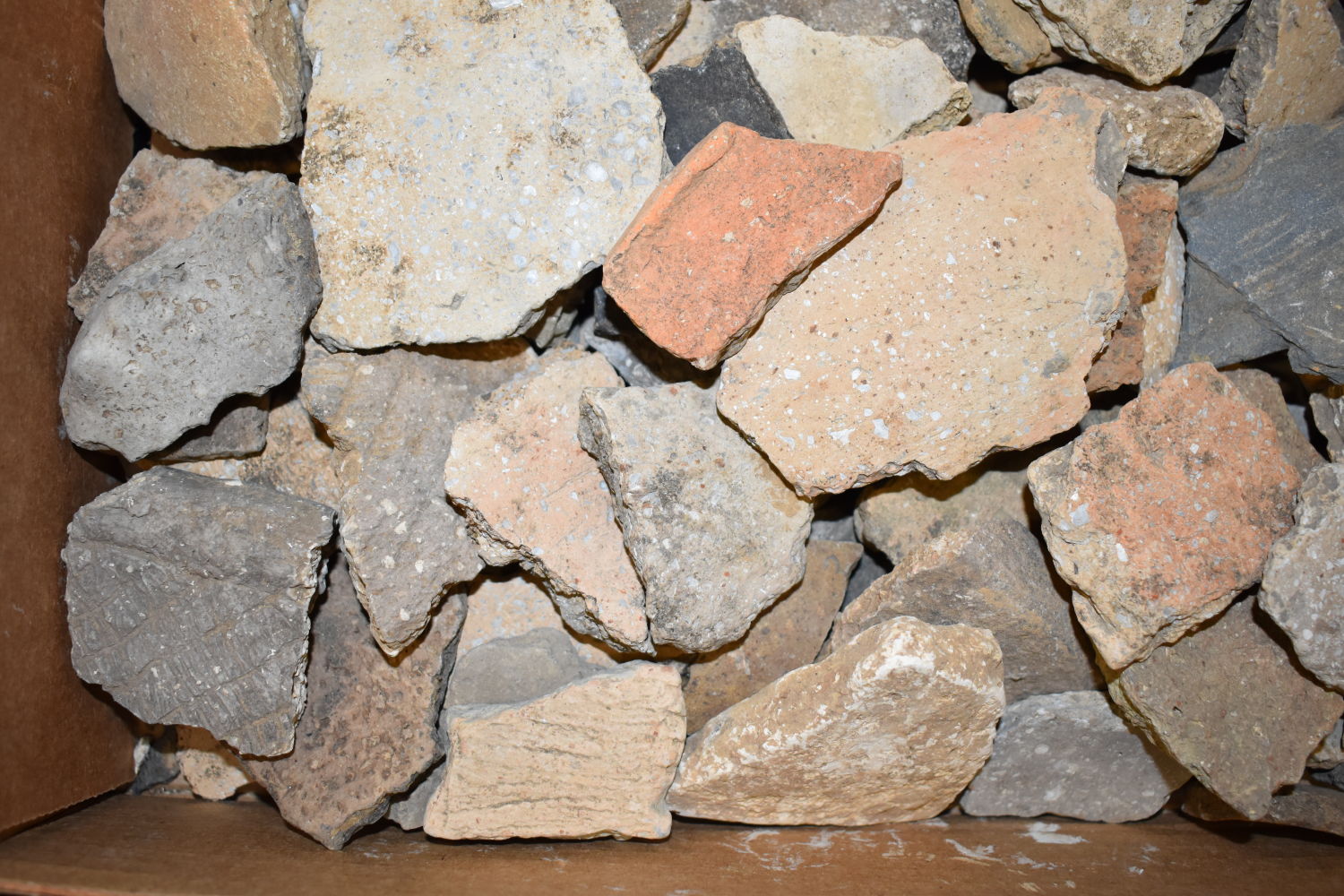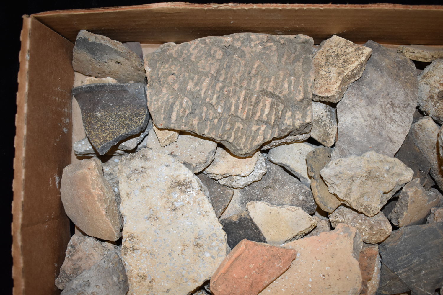 FLAT OF OVER 100 POTTERY SHARDS FOUND BY MARVIN MCKINNEY IN WEAKLEY COUNTY TENNESSEE & GRAVES CO KENTUCKY 1″ TO 6″ LONG