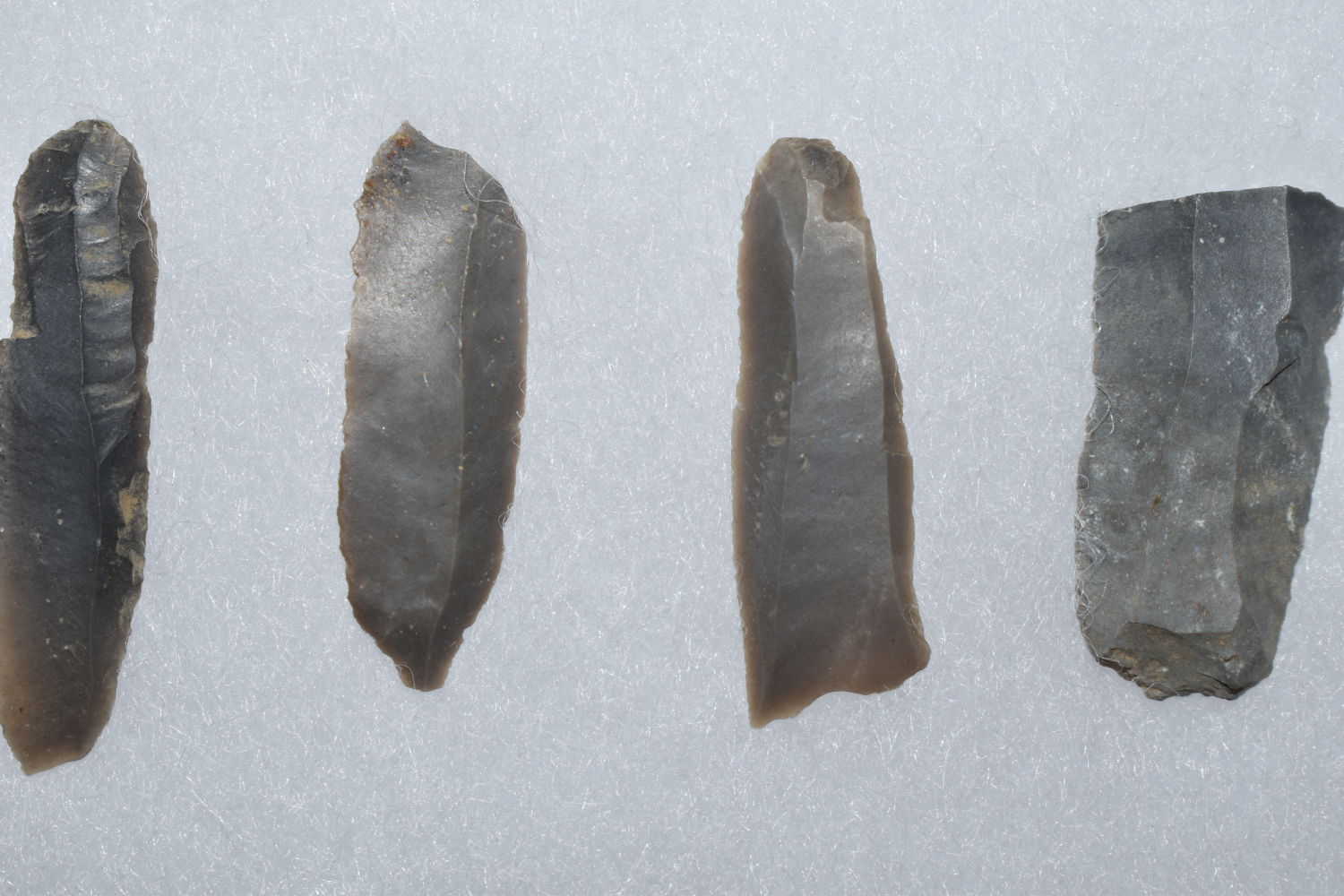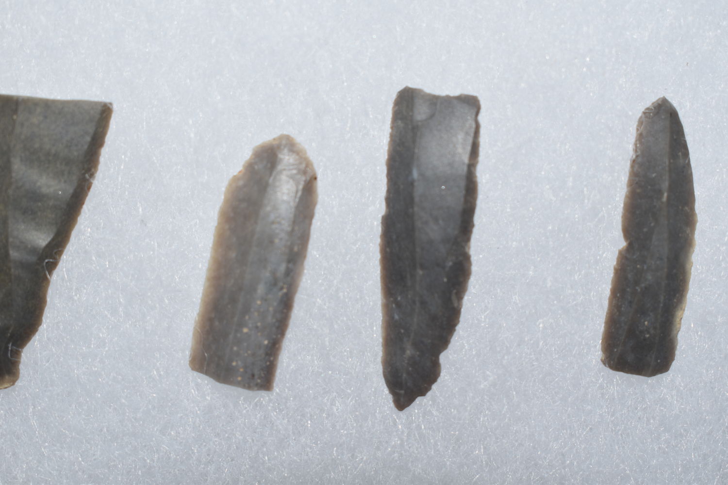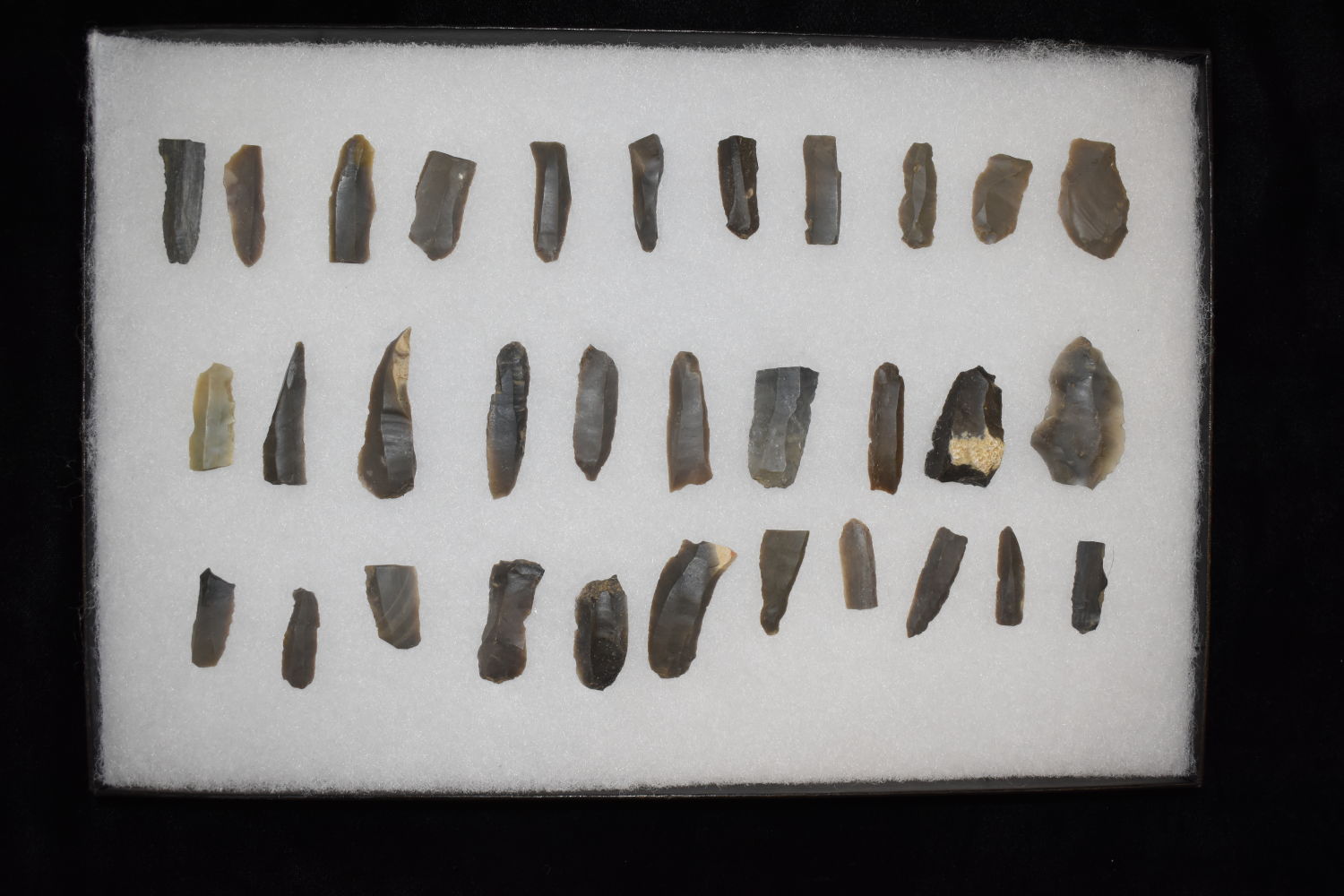8″ X 12″ FRAME OF 32 HOPEWELL LAMINAR FLAKE KNIVES FOUND AT THE MANN SITE, POSEY COUNTY INDIANA