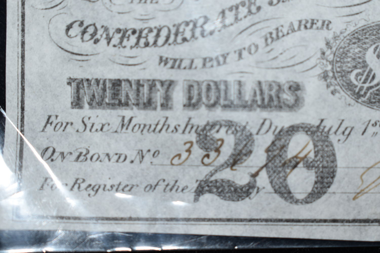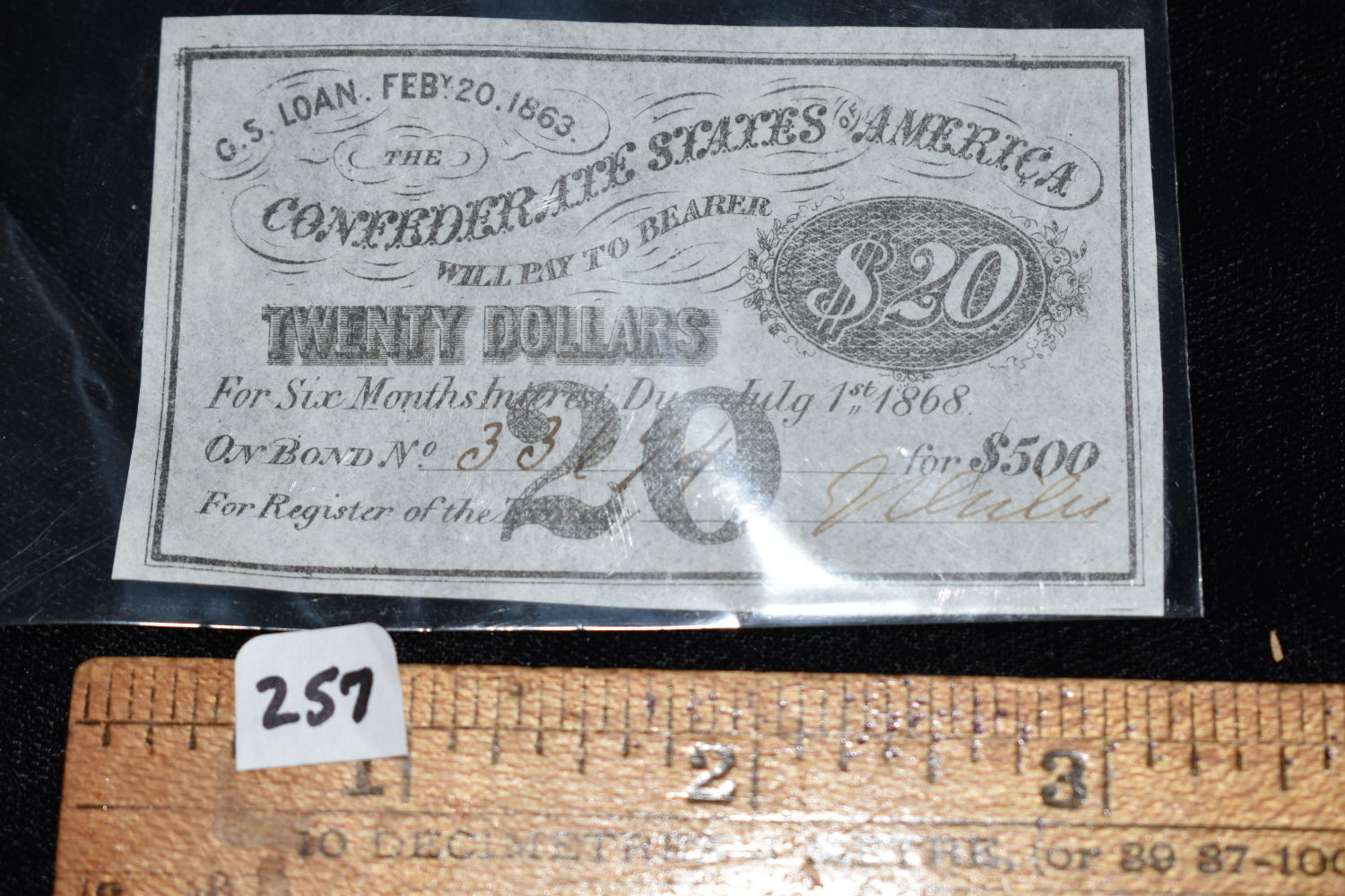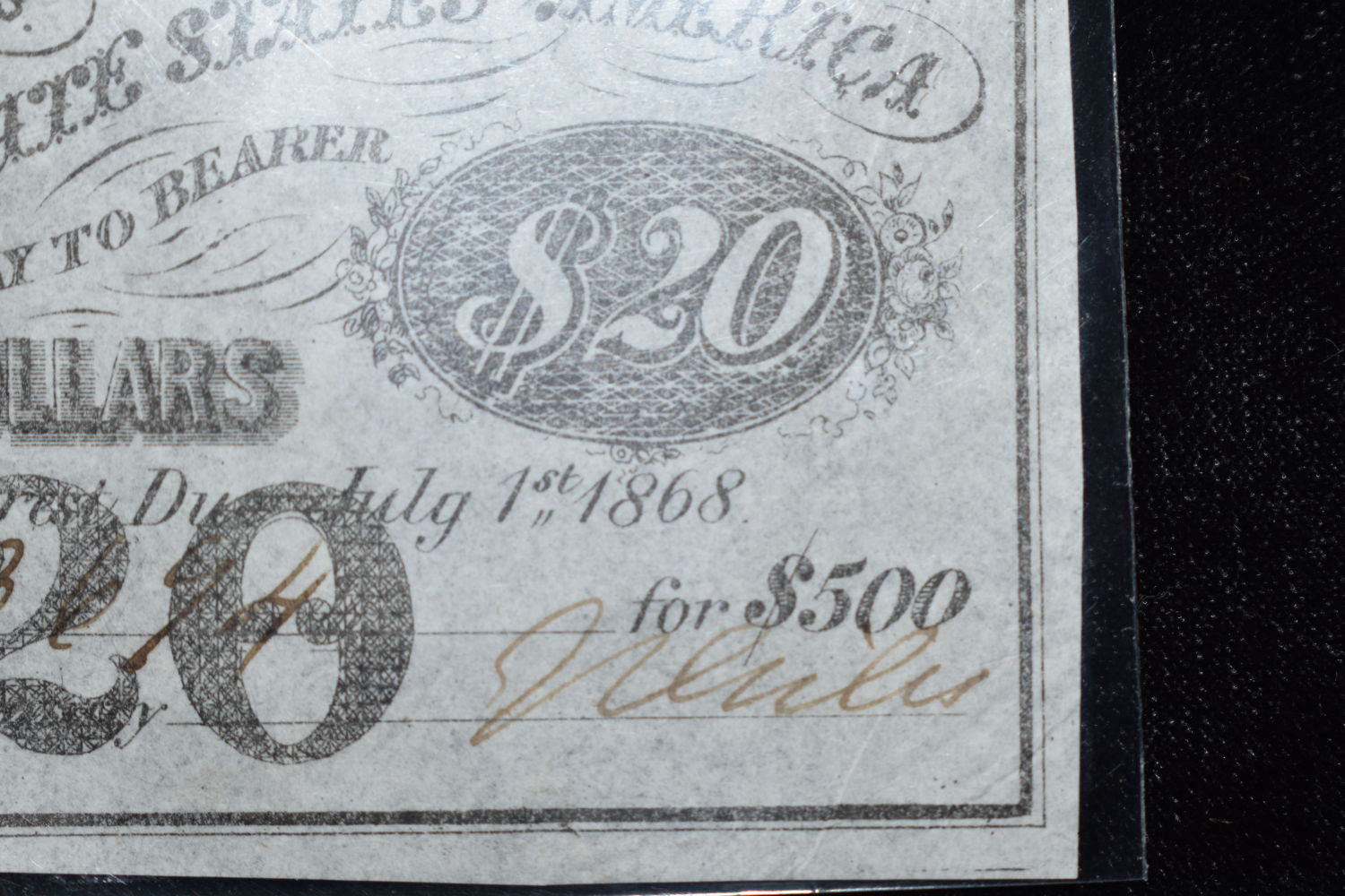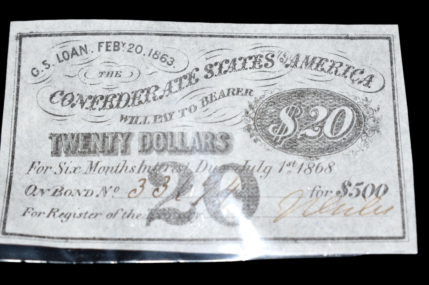 1868 CONFEDERATE ARMY CIVIL WAR $20 BOND NOTE, ORIGINAL PERIOD ITEM, GREAT PIECE OF AMERICAN HISTORY