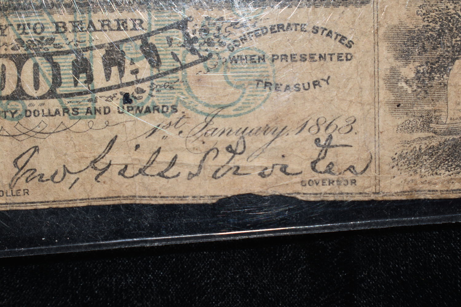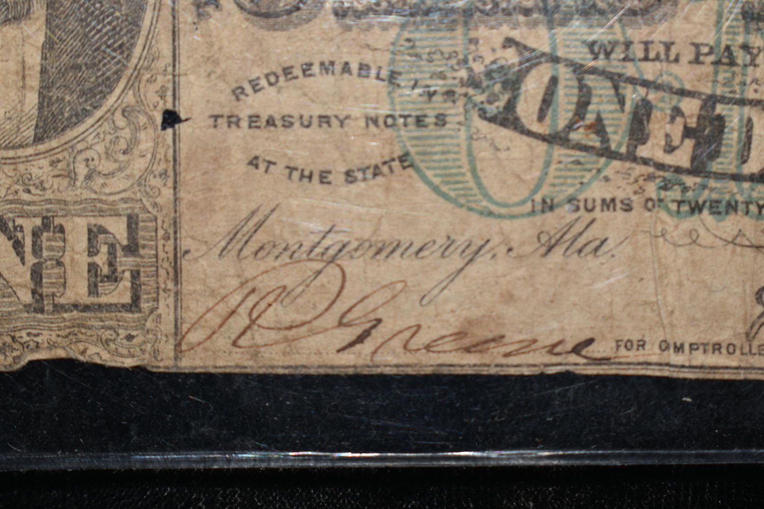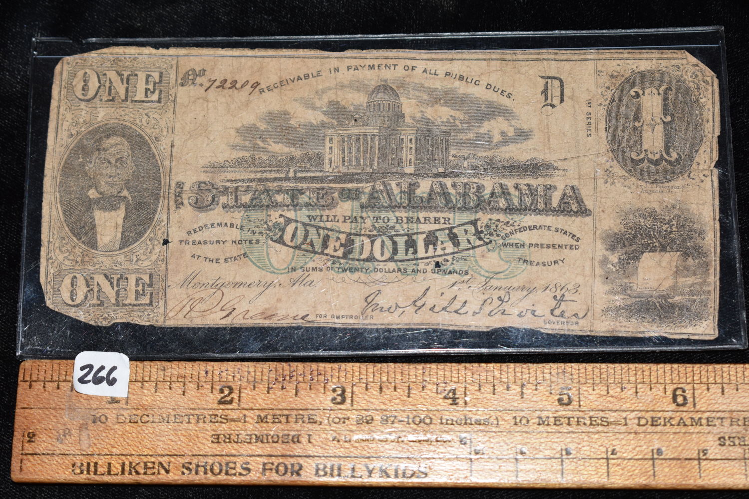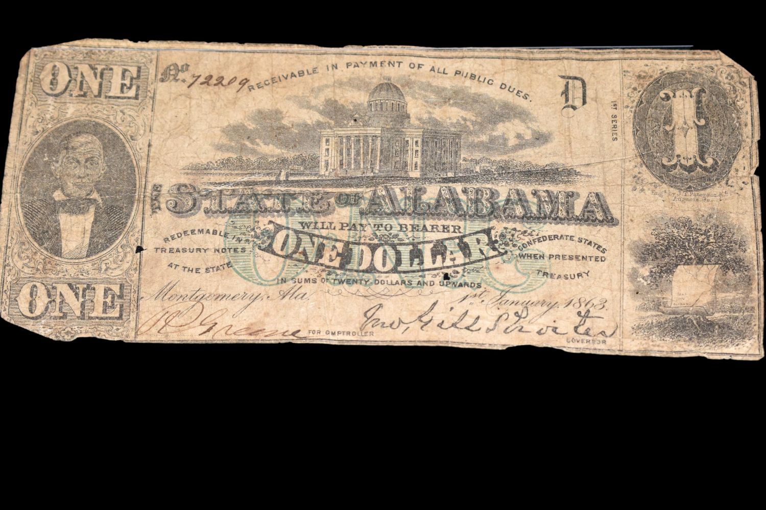 RARE 1863 CONFEDERATE STATES ALABAMA $1 BILL, ORIGINAL PERIOD CIVIL WAR CURRENCY