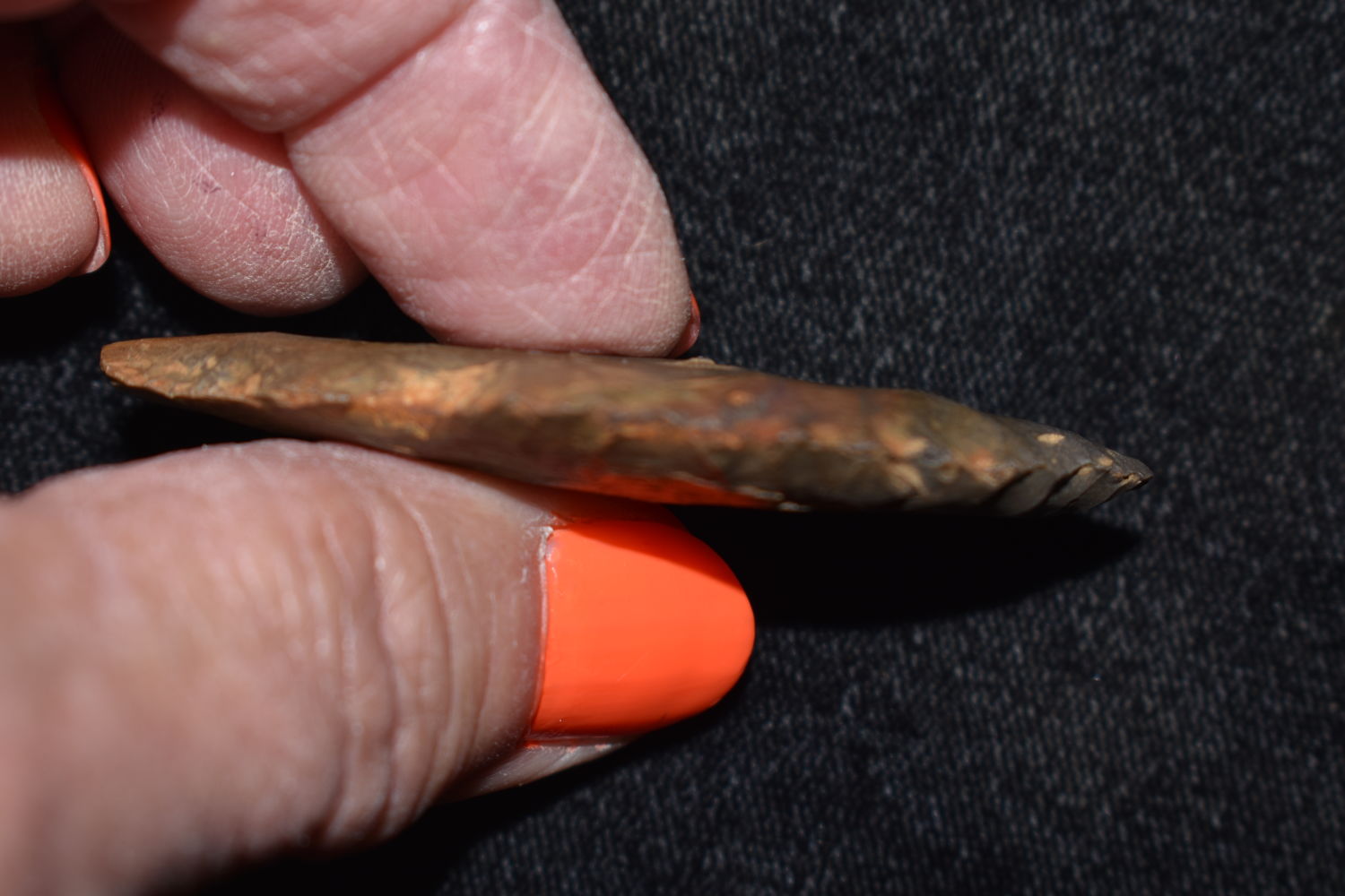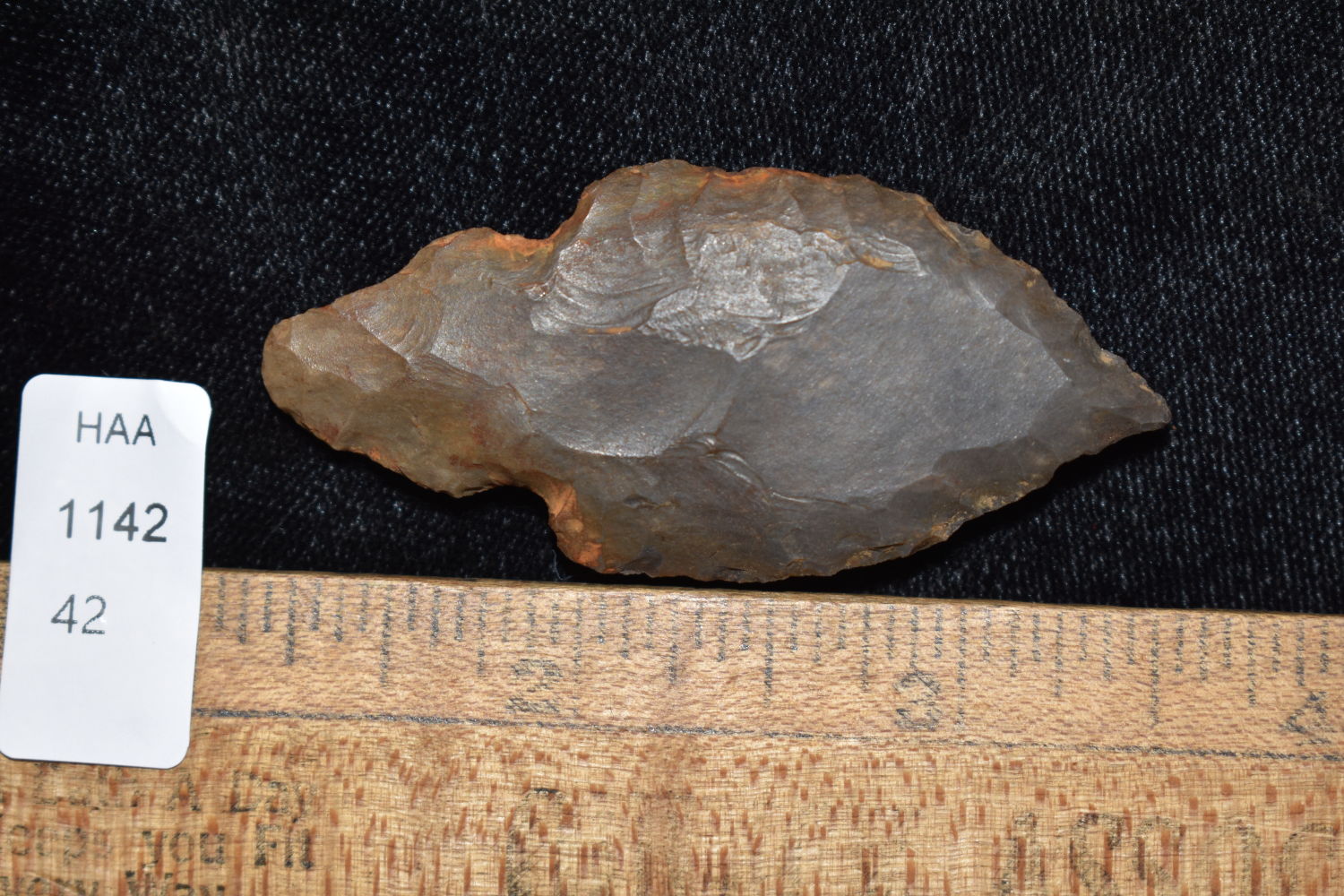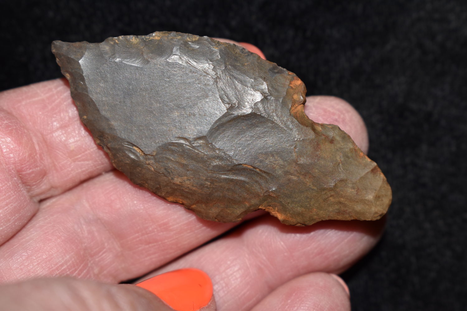 CLASSIC TURKEYTAIL FOUND BY MARVIN MCKINNEY IN GRAVES COUNTY KENTUCKY, 2 3/8″ LONG ARROWHEAD