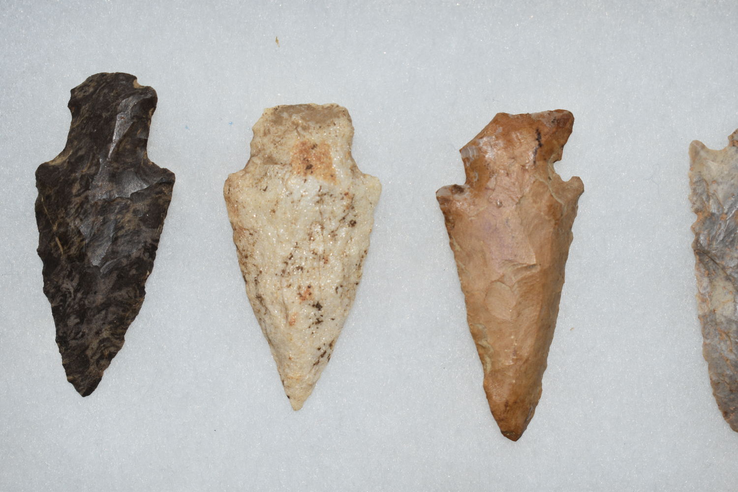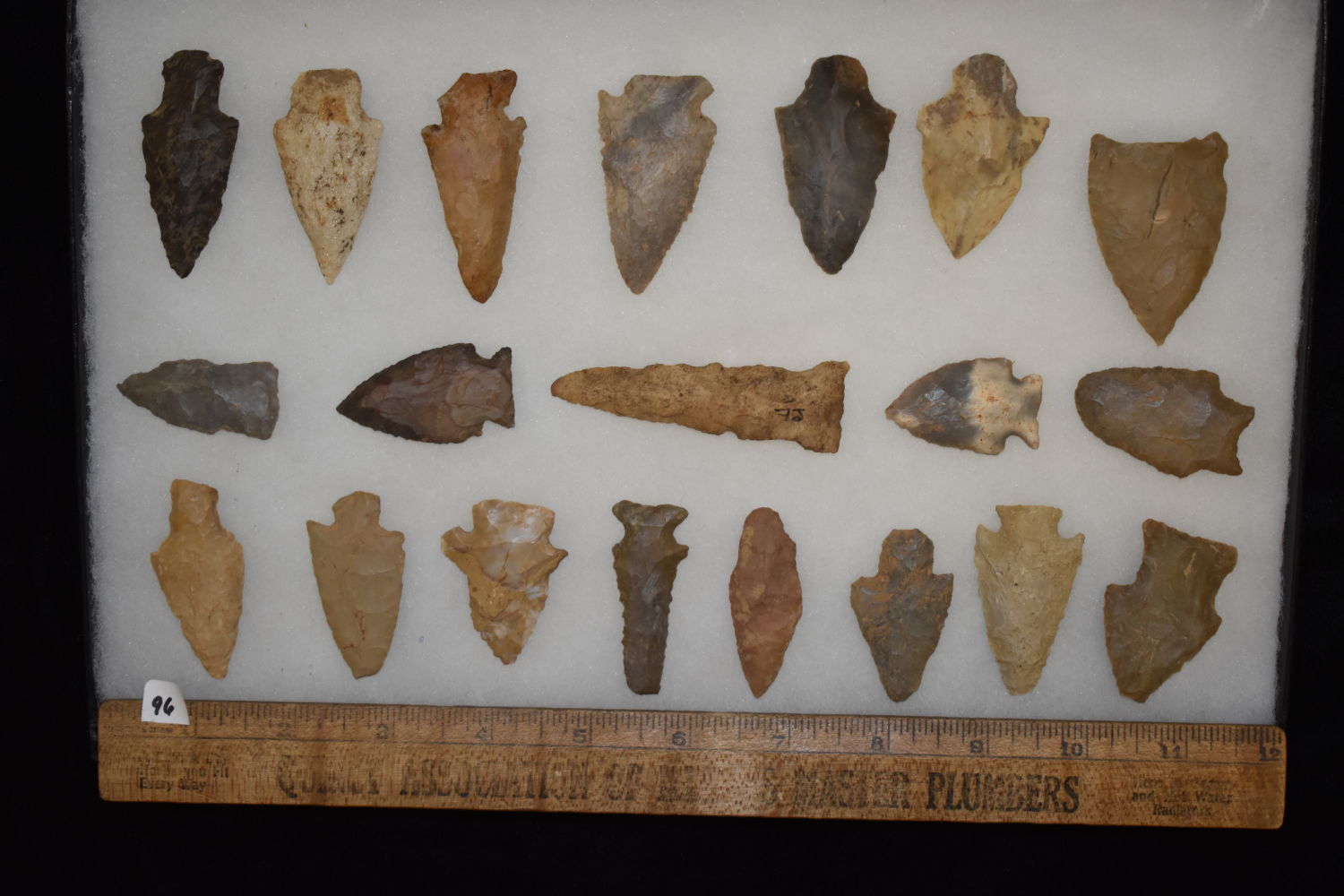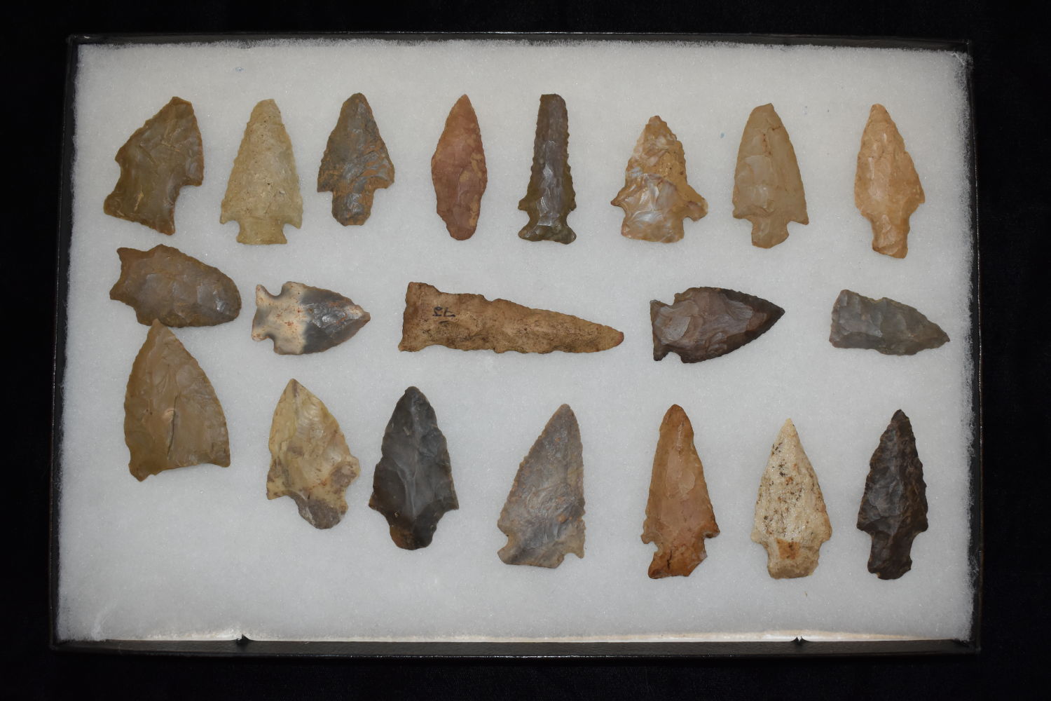 8″ X 12″ FRAME OF 20 MOSTLY ARCHAIC ARROWHEADS FOUND BY MARVIN MCKINNEY IN WEAKLEY COUNTY TENNESSEE & GRAVES CO KENTUCKY