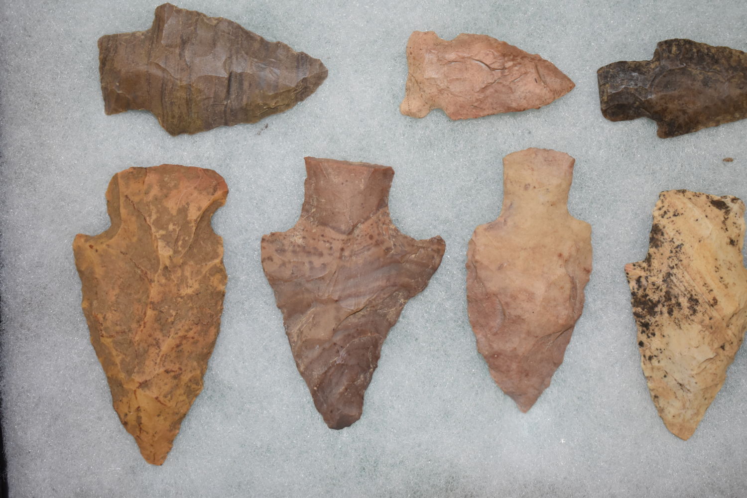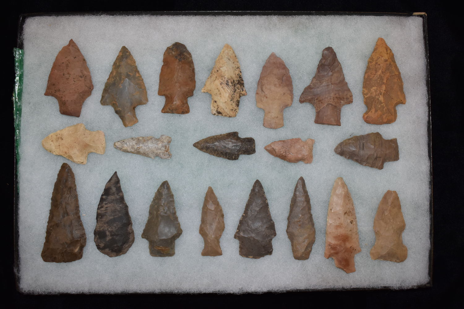 8″ X 12″ FRAME OF 20 MOSTLY ARCHAIC ARROWHEADS FOUND BY MARVIN MCKINNEY IN WEAKLEY COUNTY TENNESSEE & GRAVES CO KENTUCKY
