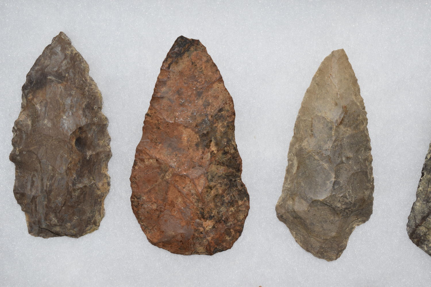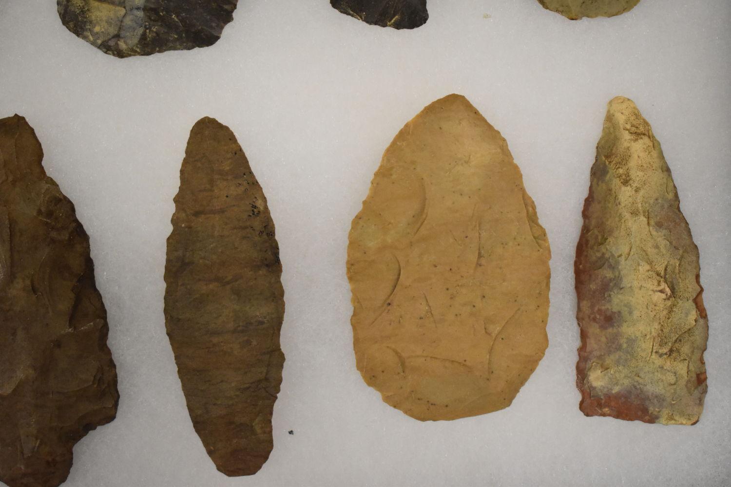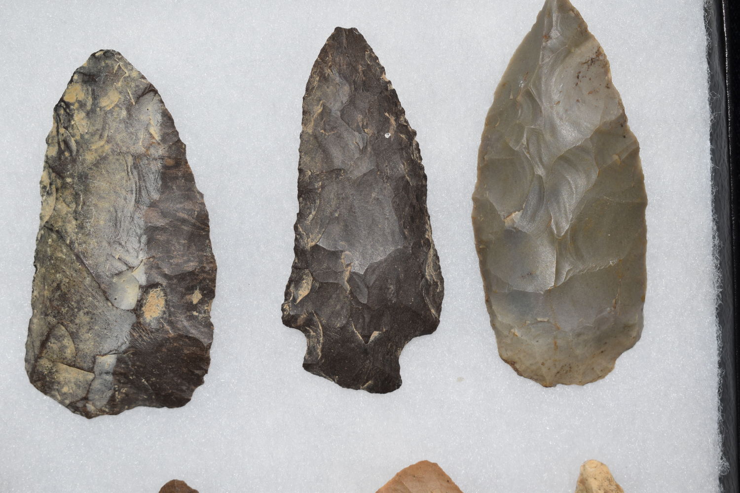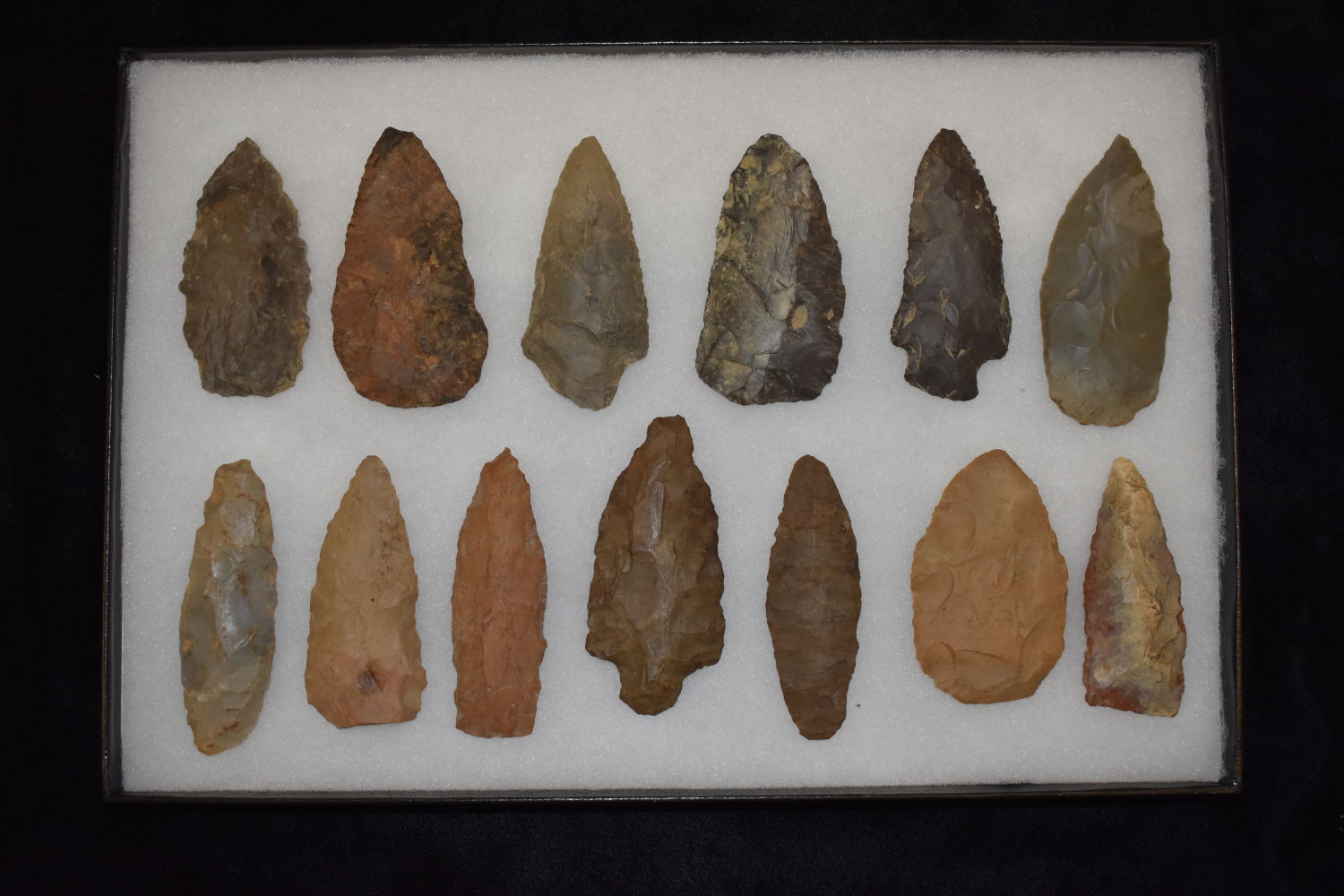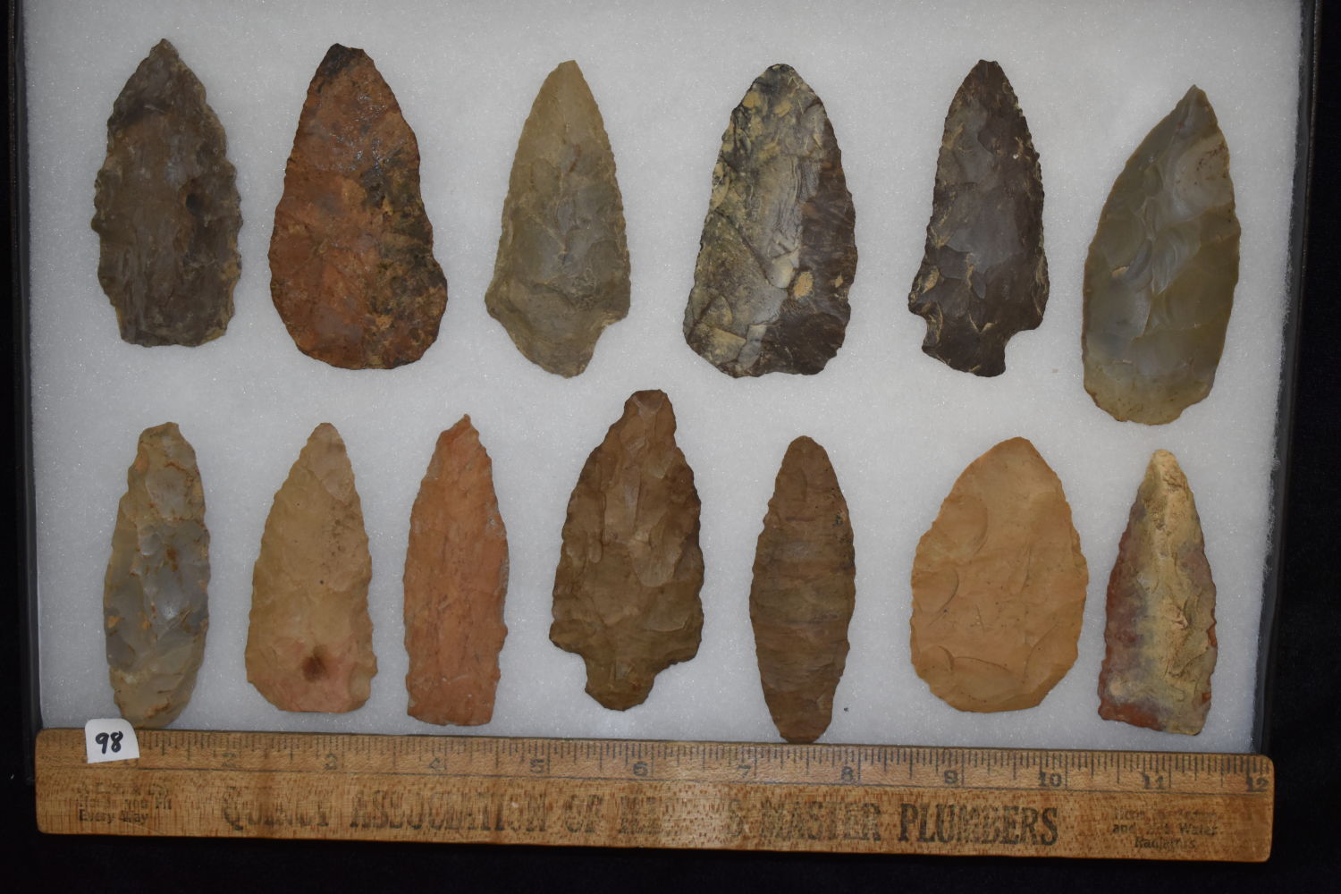 8″ X 12″ FRAME OF 13 MOSTLY ARCHAIC ARROWHEADS FOUND BY MARVIN MCKINNEY IN WEAKLEY COUNTY TENNESSEE & GRAVES CO KENTUCKY