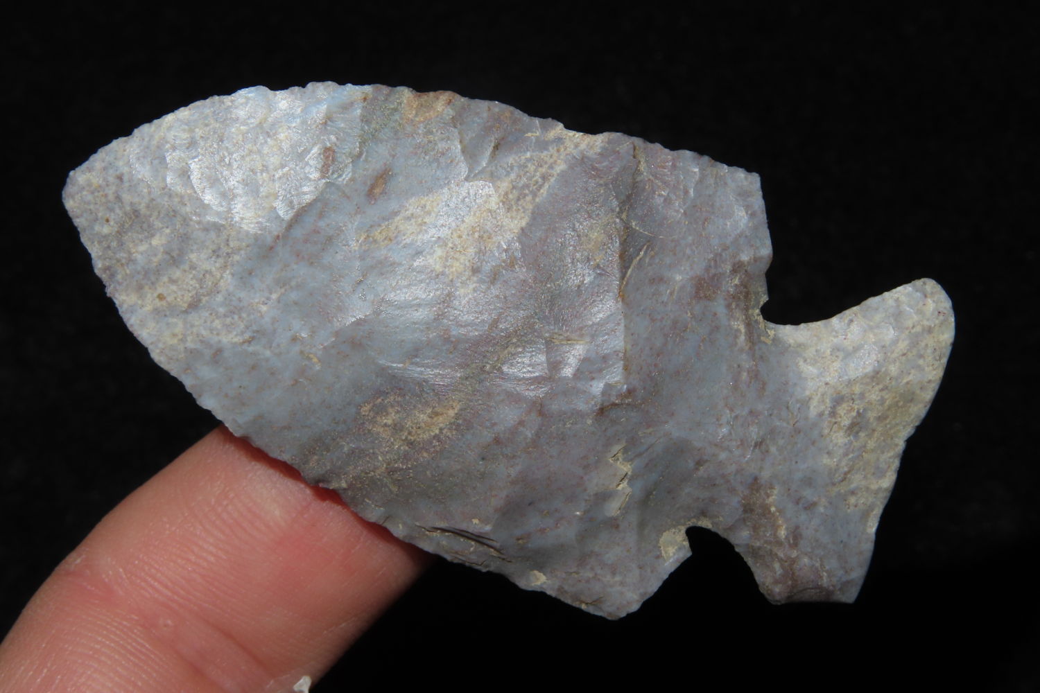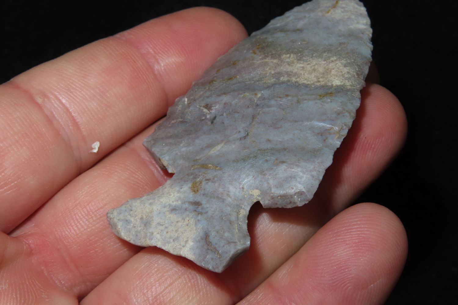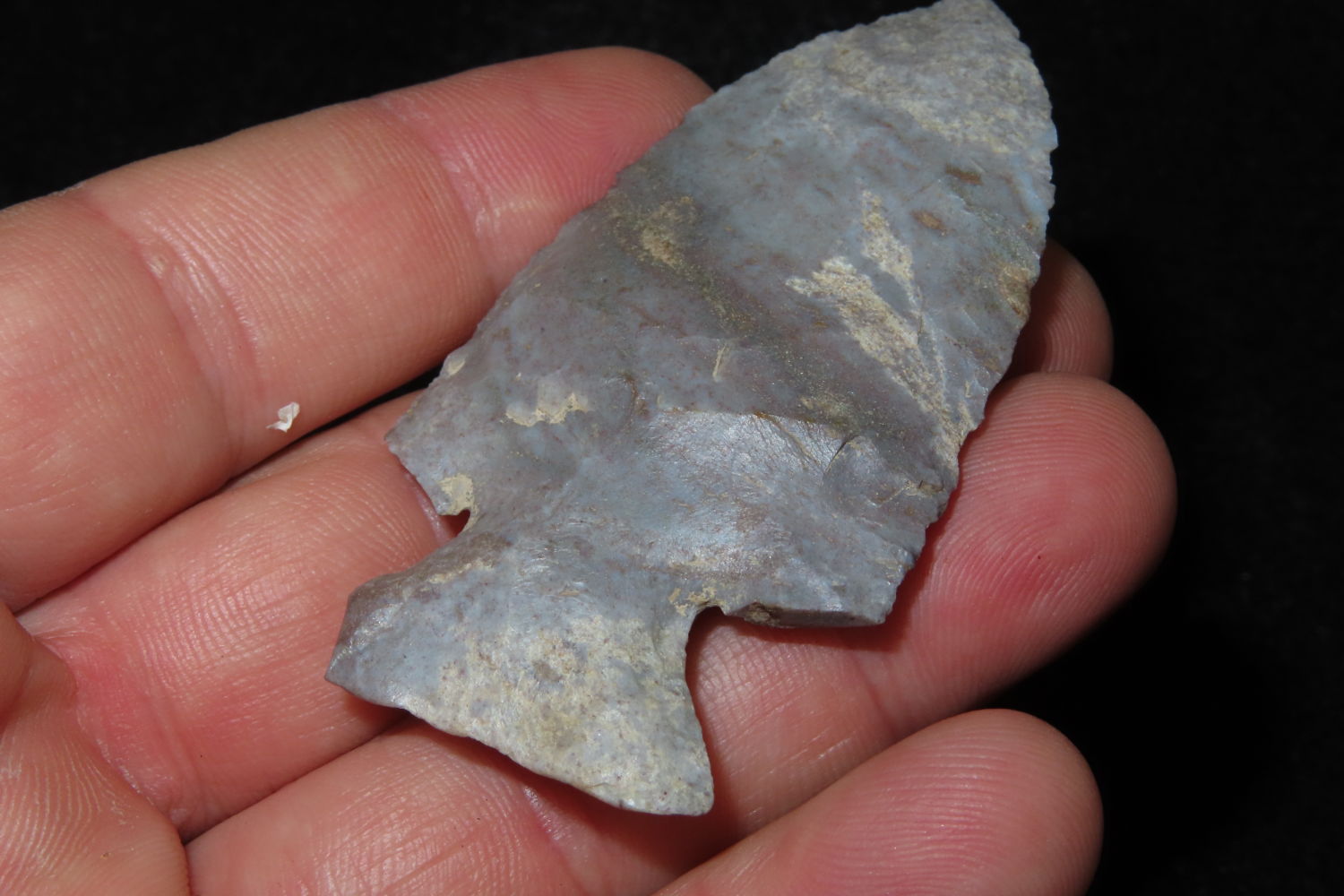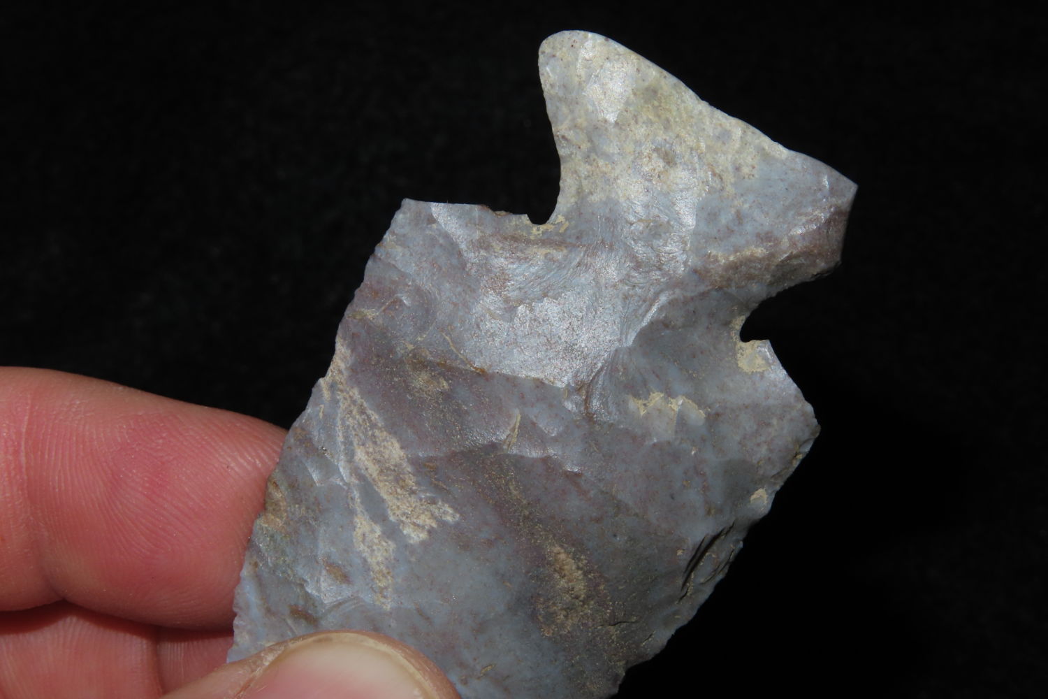 3 5/8″ Dog Leg Thebes, Amazing flaking and point, just missing a couple ears, Ohio