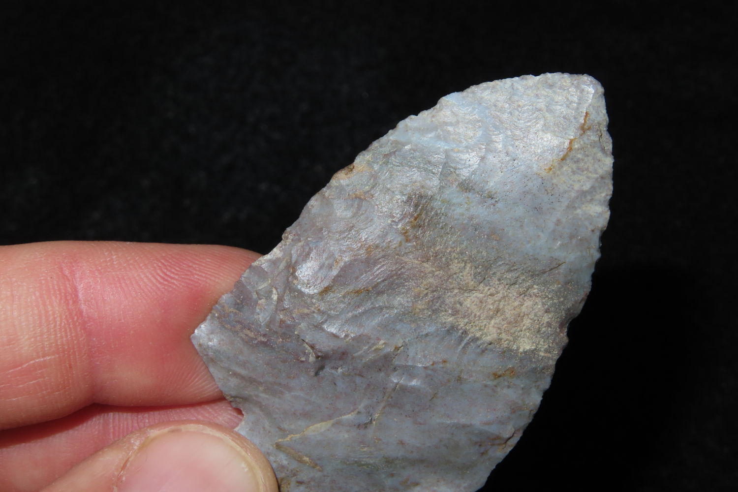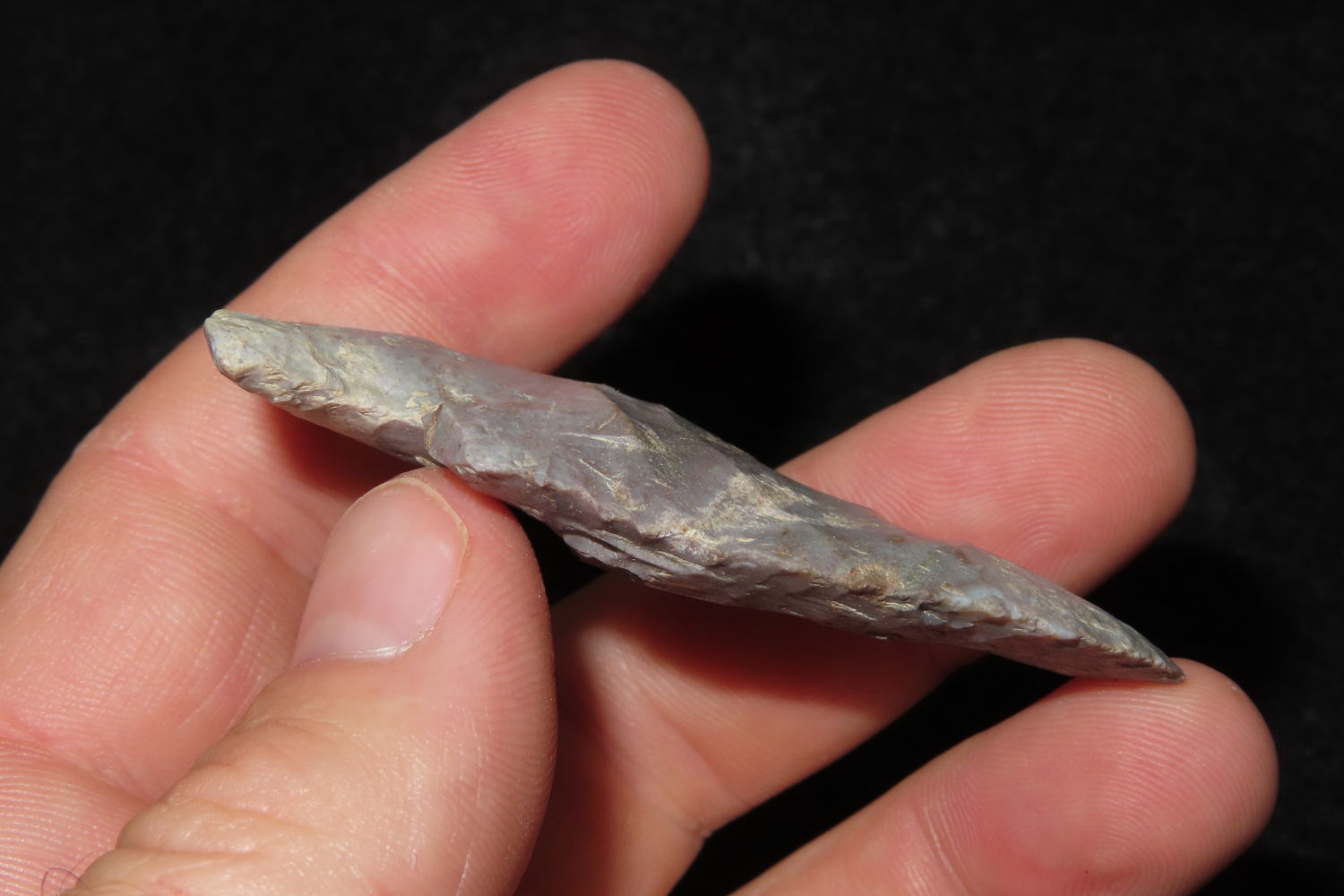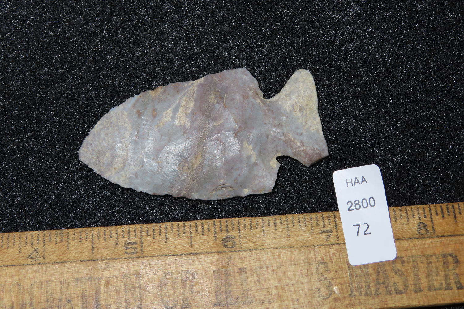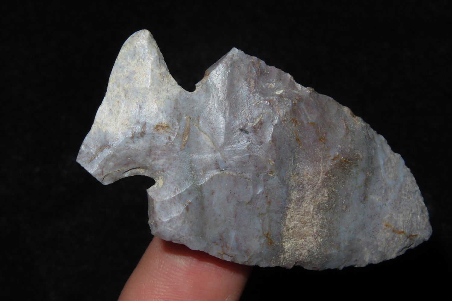 3 5/8″ Dog Leg Thebes, Amazing flaking and point, just missing a couple ears, Ohio